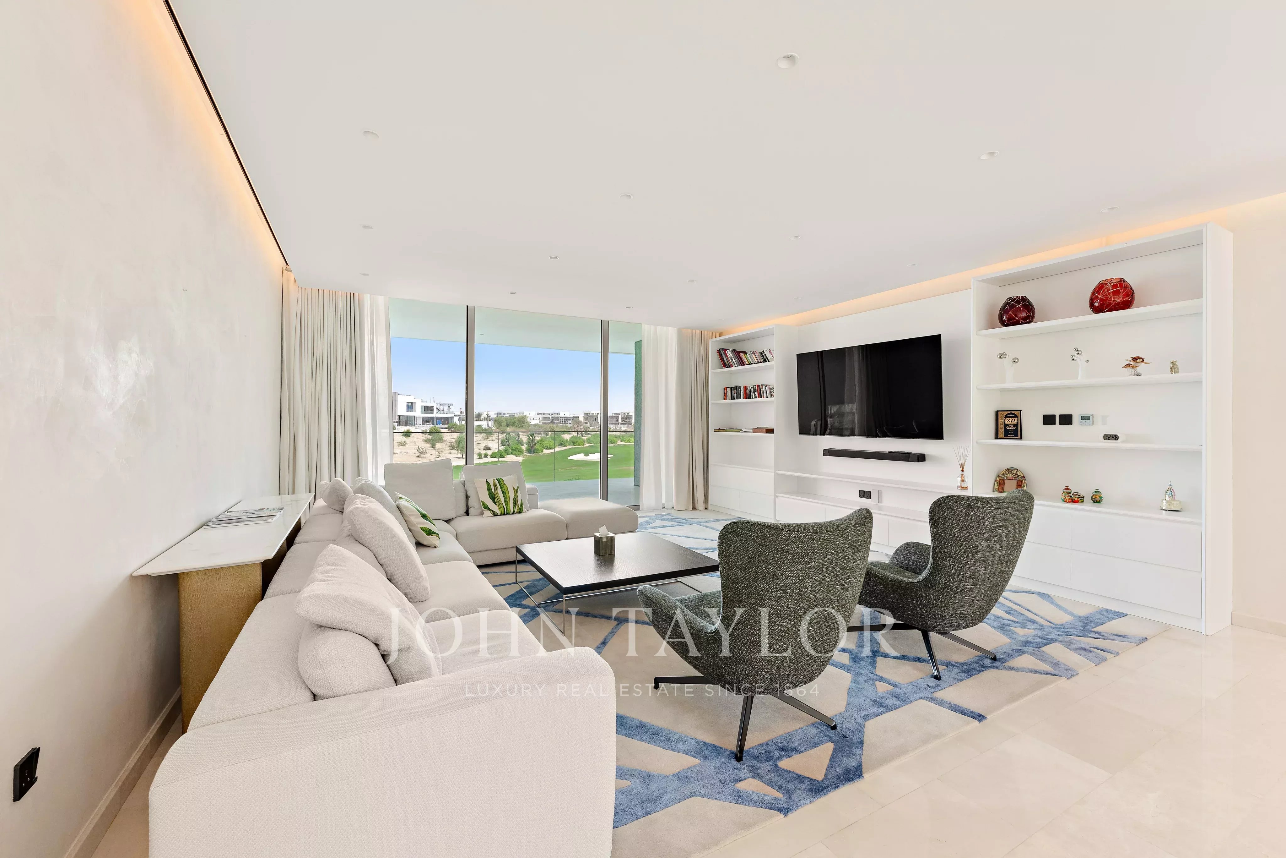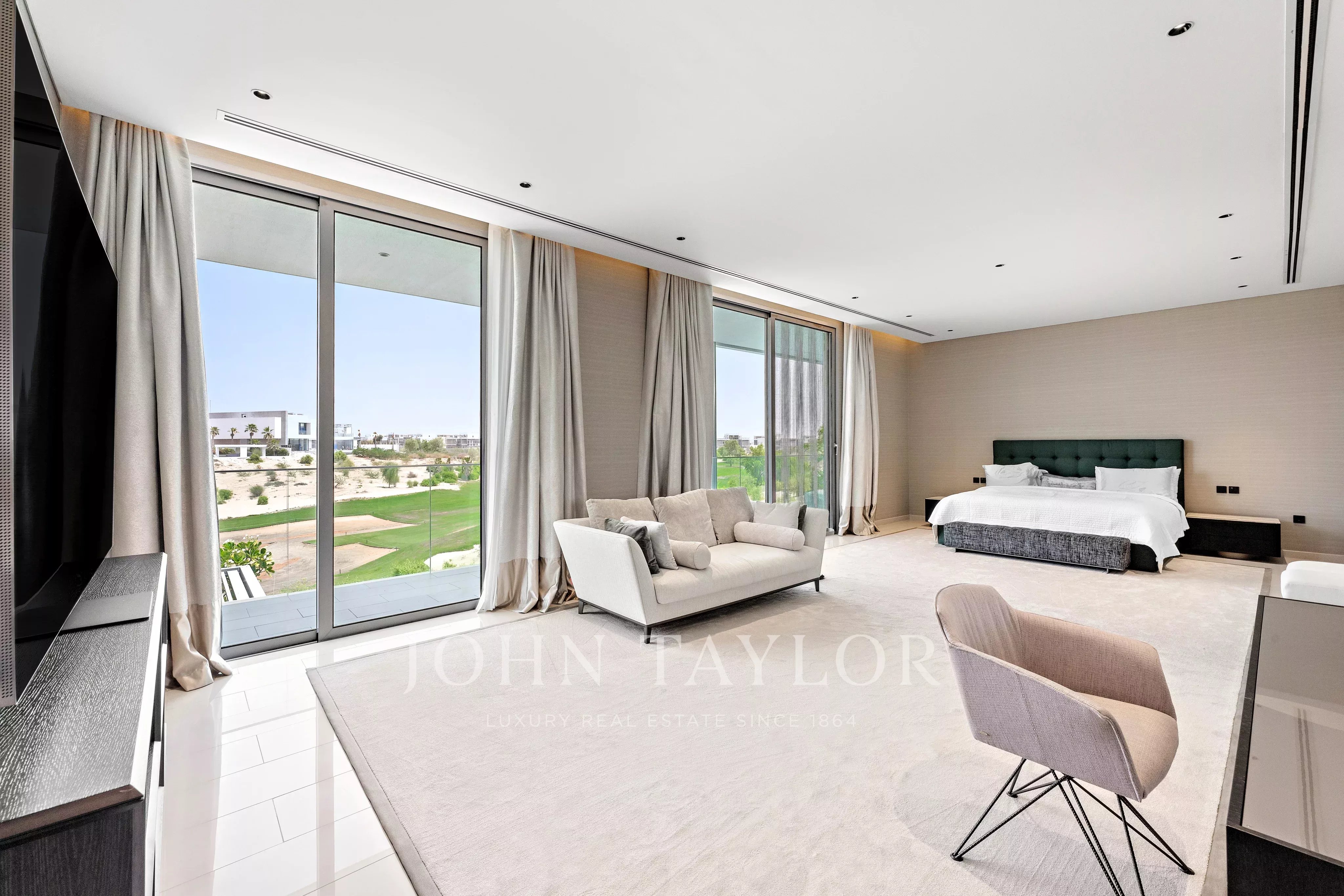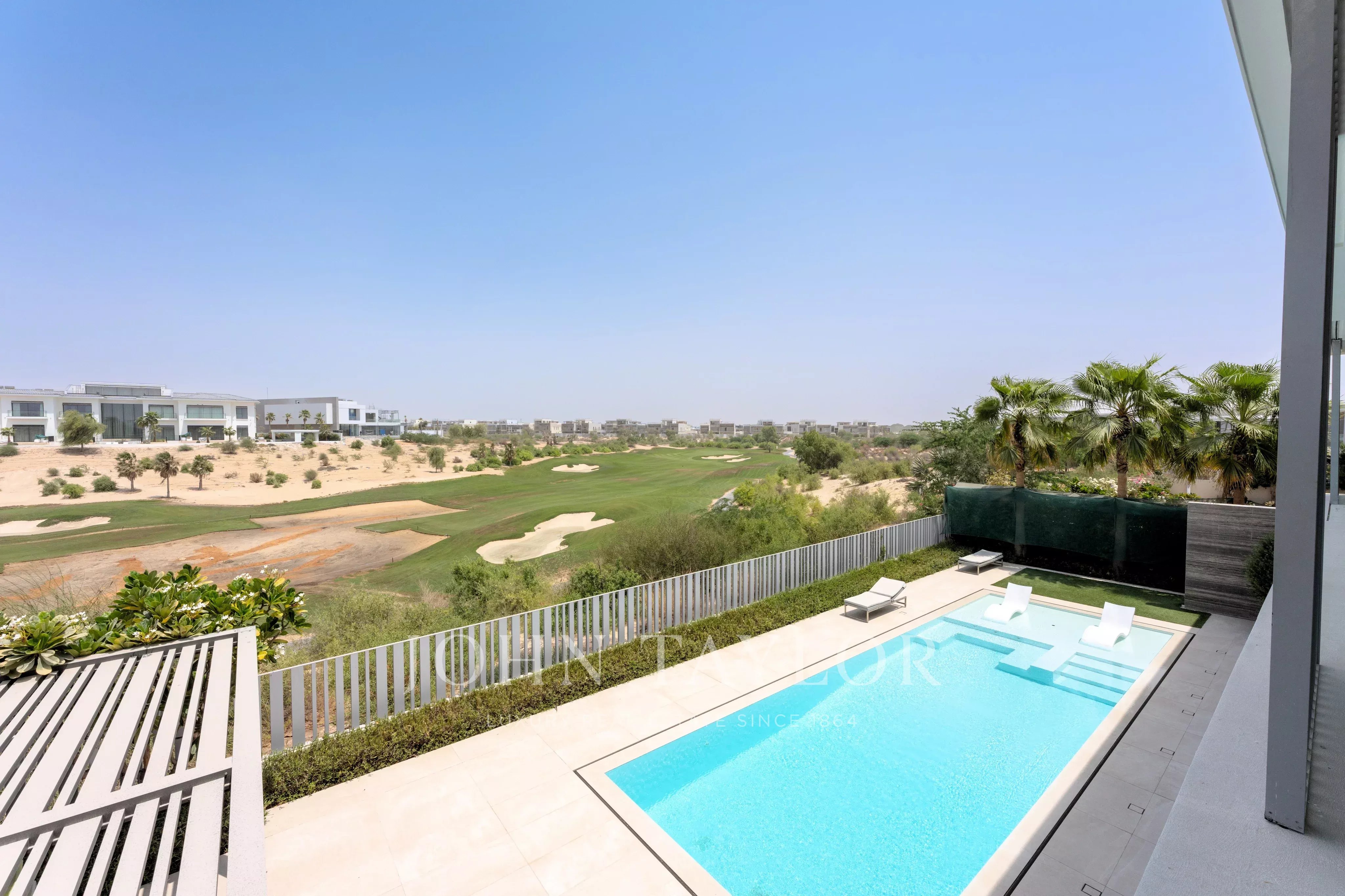 Progettata per sfruttare al massimo la sua posizione privilegiata sul campo da golf, la villa dispone di un giardino splendidamente curato, una piscina privata e un'area barbecue dedicata con pergolato, creando l'ambiente perfetto per intrattenersi all'aperto. Ulteriori caratteristiche esterne includono una palestra privata, una stanza per l'autista e una zona lavanderia esterna, che aumentano la comodità e la privacy.