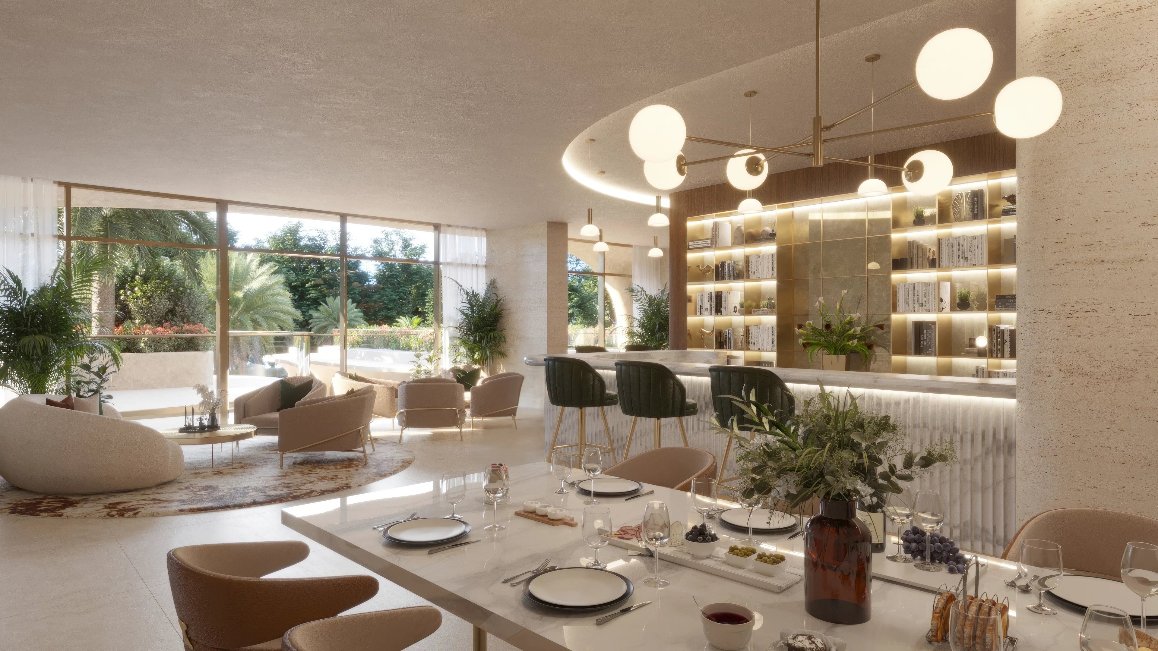 Nel cuore della casa, la cucina a vista si apre su una spaziosa zona pranzo e un elegante soggiorno, il tutto che sfuma senza soluzione di continuità verso la terrazza esterna. La cucina a vista è incentrata su una grande isola in pietra naturale, incorniciata da mobili dai toni tenui che creano un'atmosfera raffinata ma accogliente. A completamento di ciò vi sono una cucina di preparazione dedicata e una dispensa, rifinite con pavimenti in marmo naturale con finitura sigillata e naturale. I piani di lavoro e gli alzatine sono realizzati in quarzo di alta qualità o pietra sinterizzata, che offrono sia resistenza che eleganza. Lo spazio è dotato di mobili di livello europeo con ante e cassetti estraibili resistenti e con chiusura ammortizzata, tutti progettati con cura per garantire la massima funzionalità. La cucina è completamente attrezzata con elettrodomestici Miele che includono un frigorifero combinato con congelatore, piano cottura a gas, forno a gas, cappa a ricircolo e lavastoviglie.
