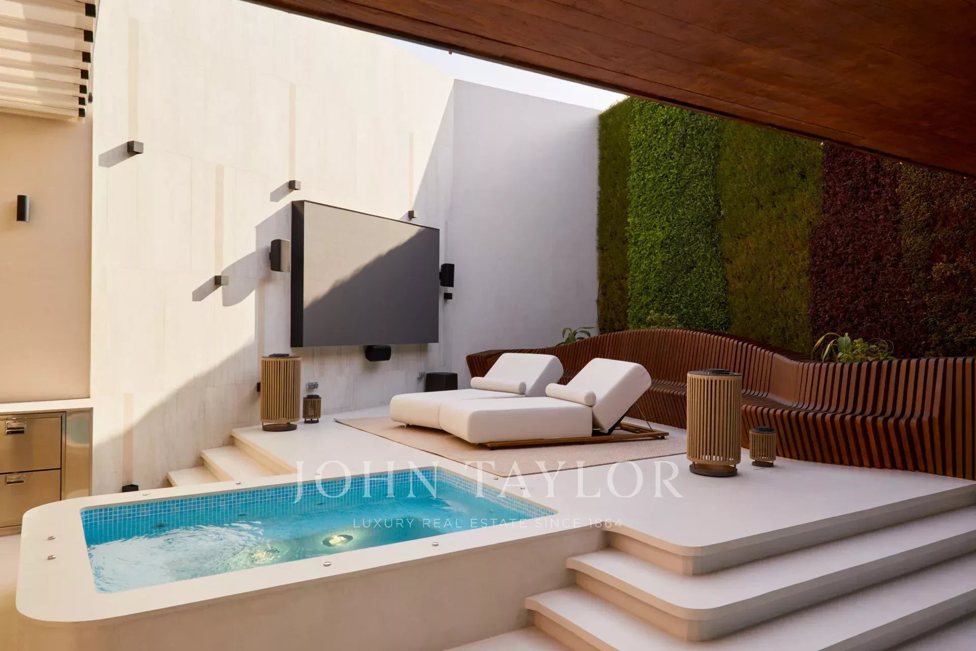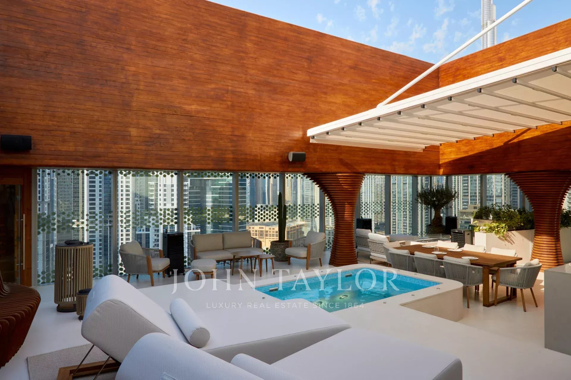 Terrazza privata con piscina e zona pranzo: Accedete alla vostra ampia terrazza, dotata di piscina privata e zona pranzo all'aperto con vista spettacolare sul Burj Khalifa, perfetta per il relax e l'intrattenimento.