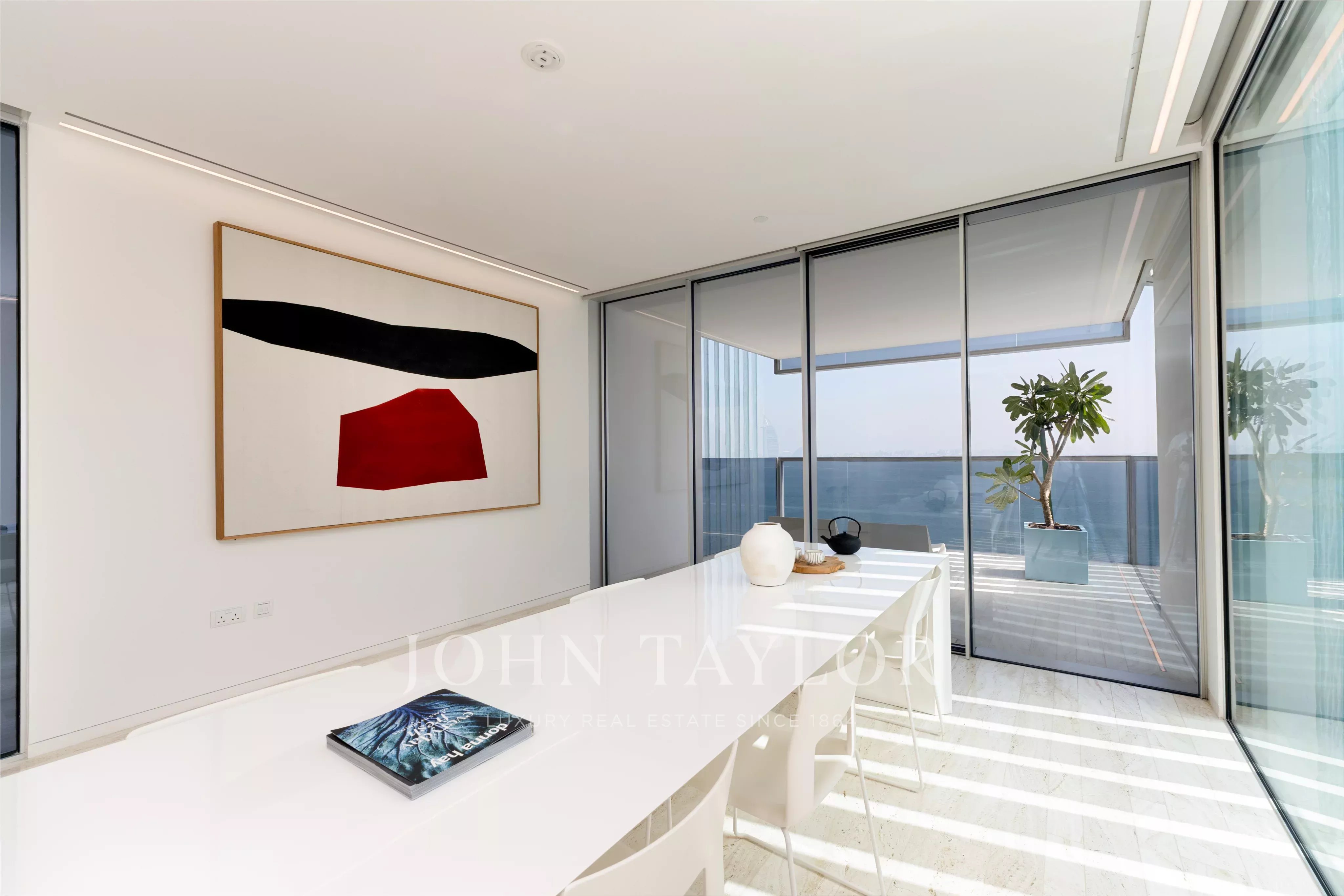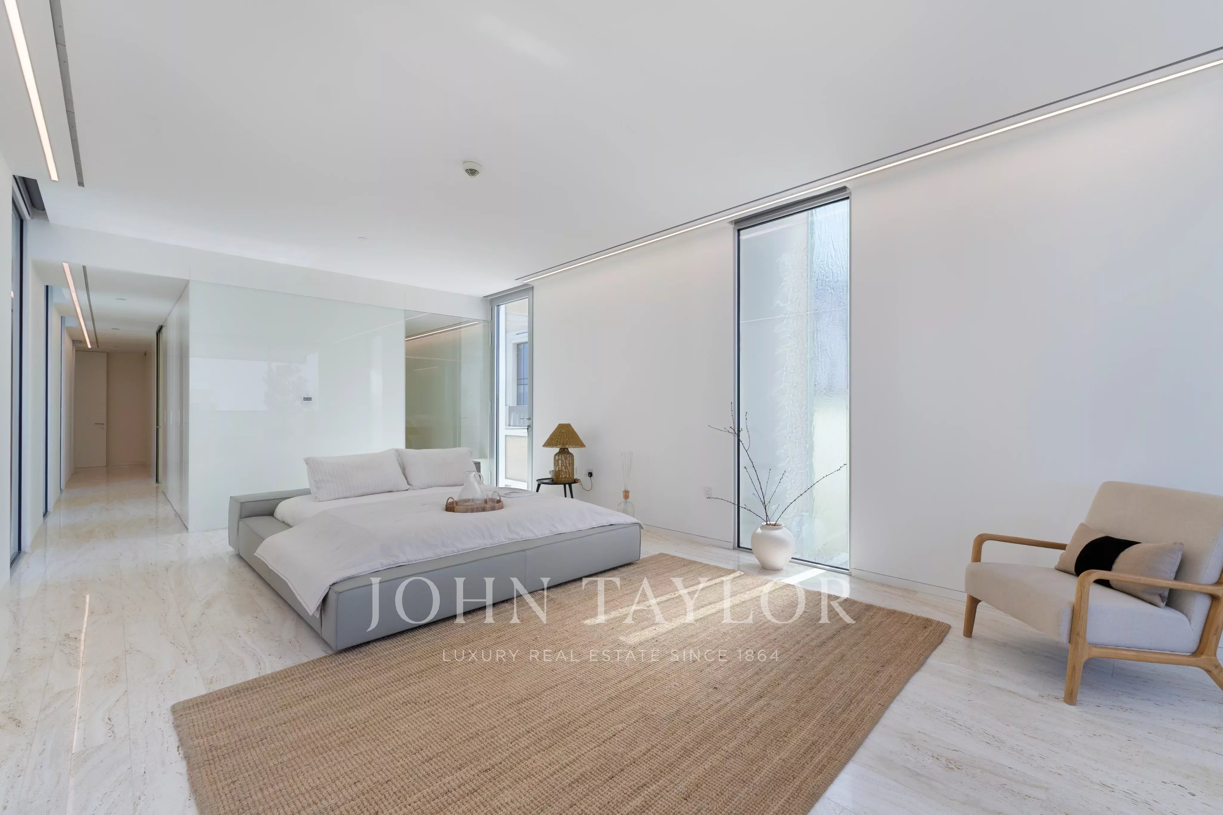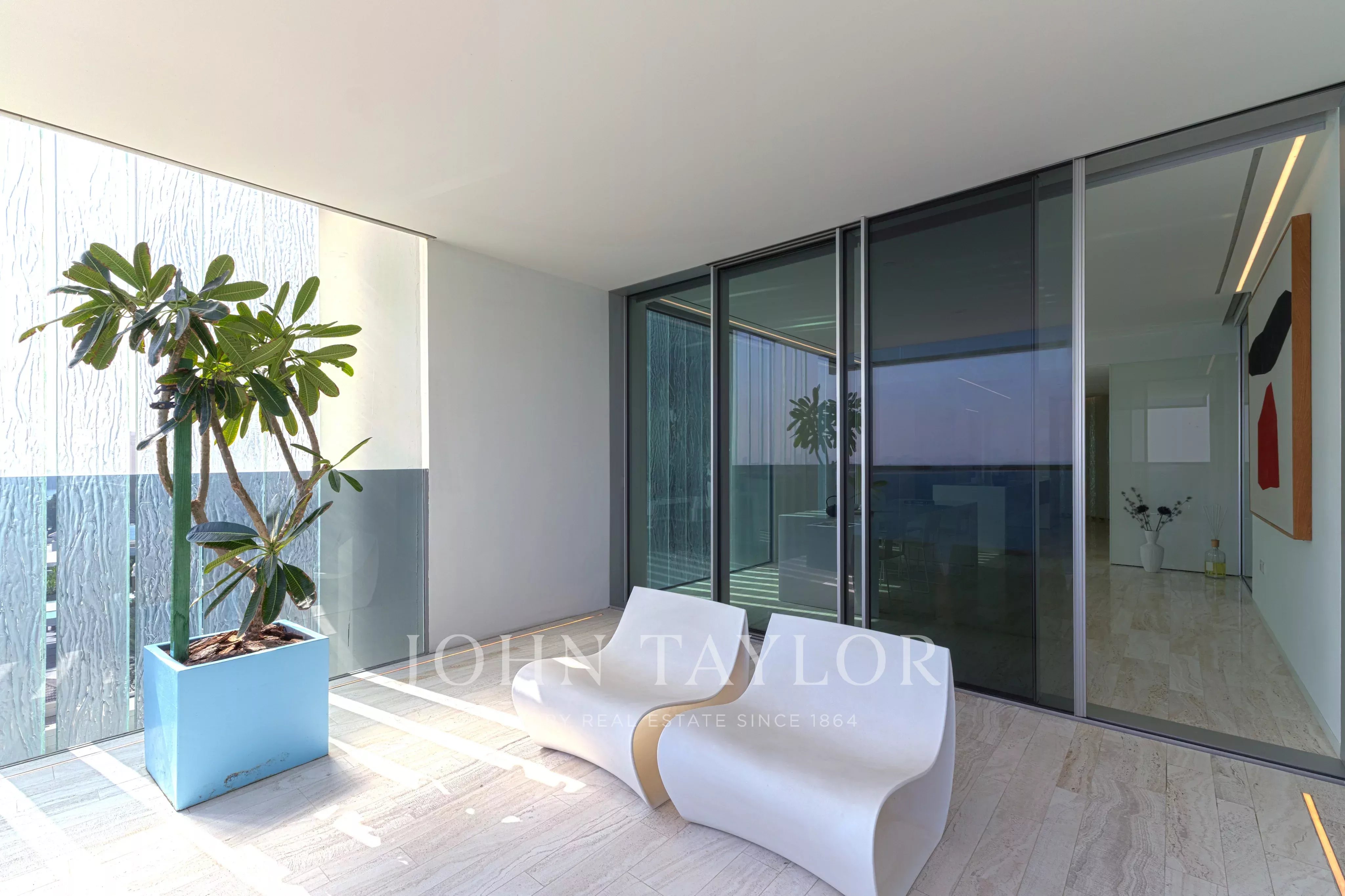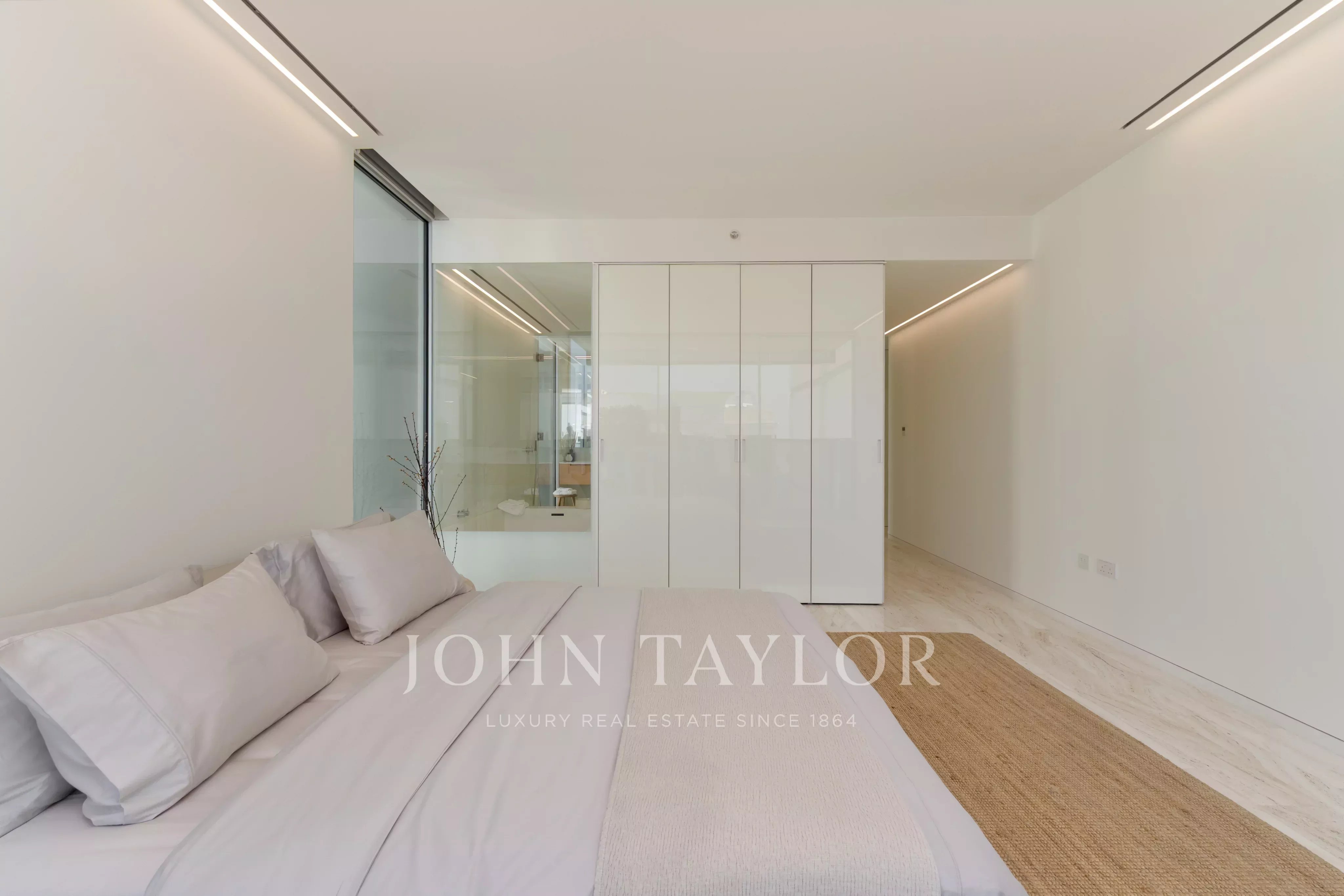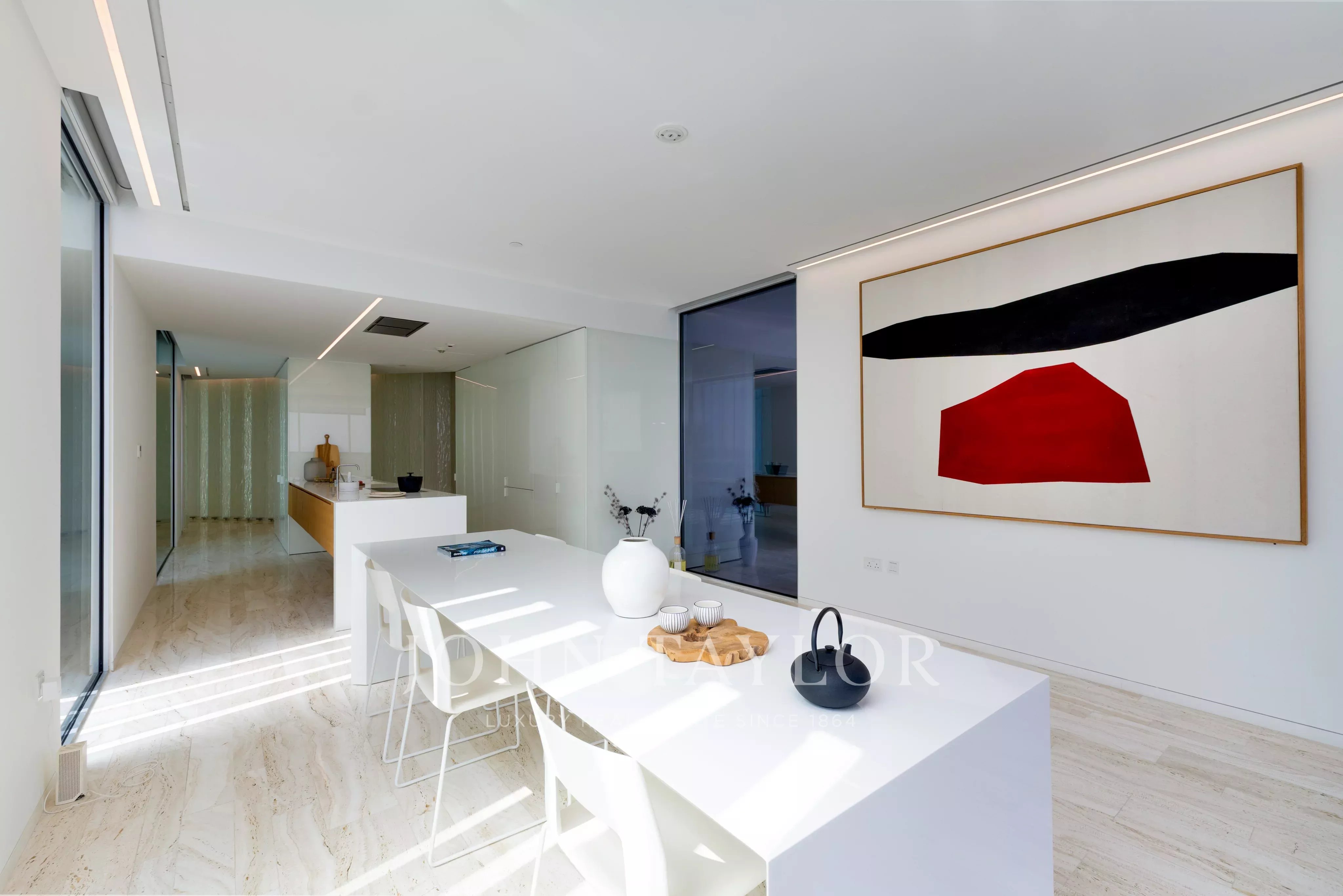 Con una superficie edificata di 6.656 m², questo splendido attico arredato a Muraba Dia ospita cinque camere da letto, tutte arredate in stile contemporaneo. I toni neutri degli arredi morbidi e la scelta di mobili scandinavi fanno di questa casa un'abitazione che invoglia la maggior parte dei proprietari a trasferirsi e a farla propria. Con ampie vedute sul mare e sulla mezzaluna della Palma, l'orientamento da est a ovest consente di godere della luce del sole in diversi momenti della giornata. L'intelligente disposizione è a cavallo tra privacy e apertura, grazie soprattutto alla genialità architettonica dei pluripremiati architetti spagnoli RCR Arquitectes, che hanno creato uno spazio ampio e ponderato. Le porte e le finestre scorrevoli ultra-sottili consentono una facile transizione tra gli spazi interni ed esterni, esaltando ulteriormente il design a pianta aperta e la connessione con l'ambiente circostante.