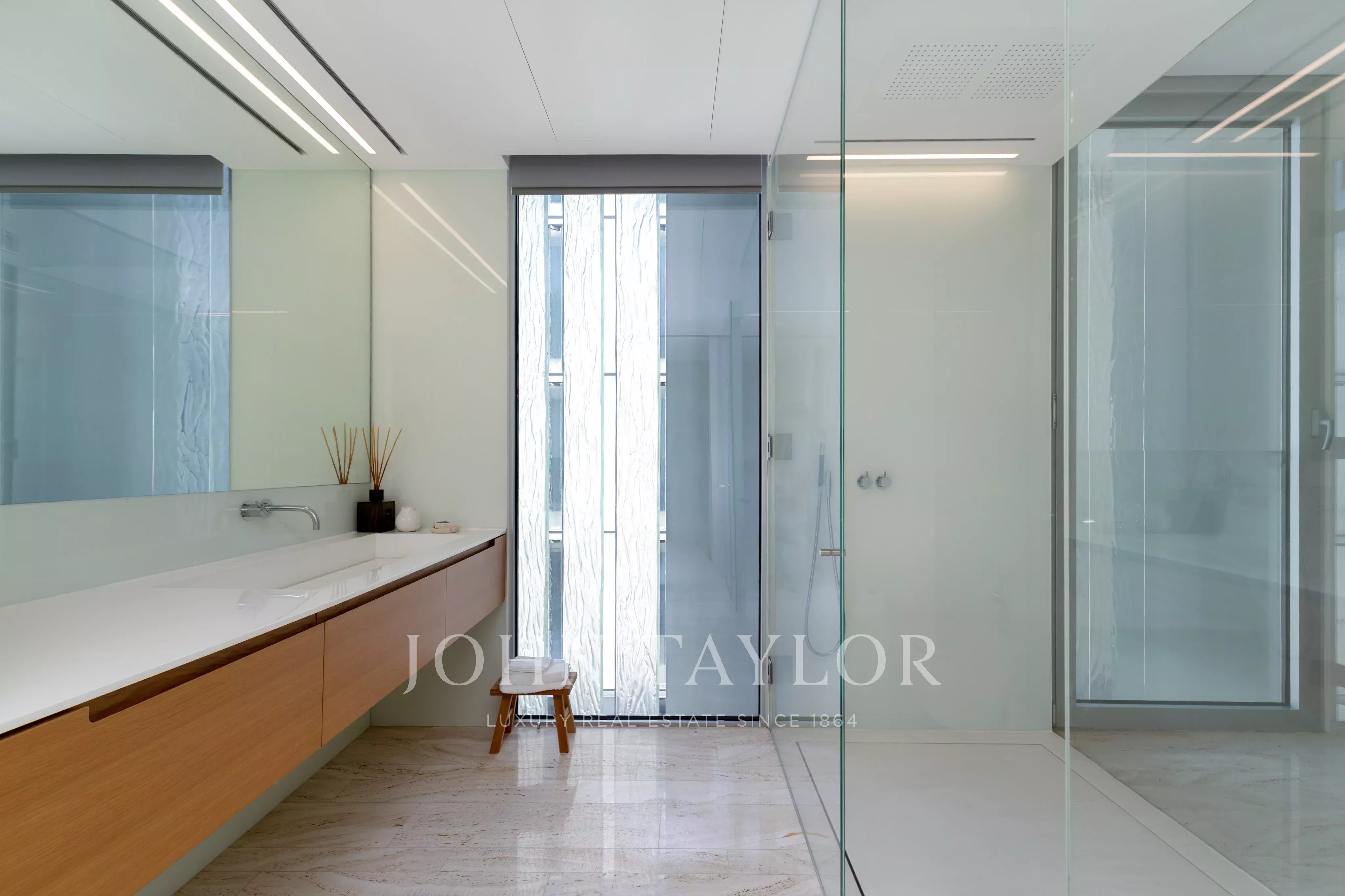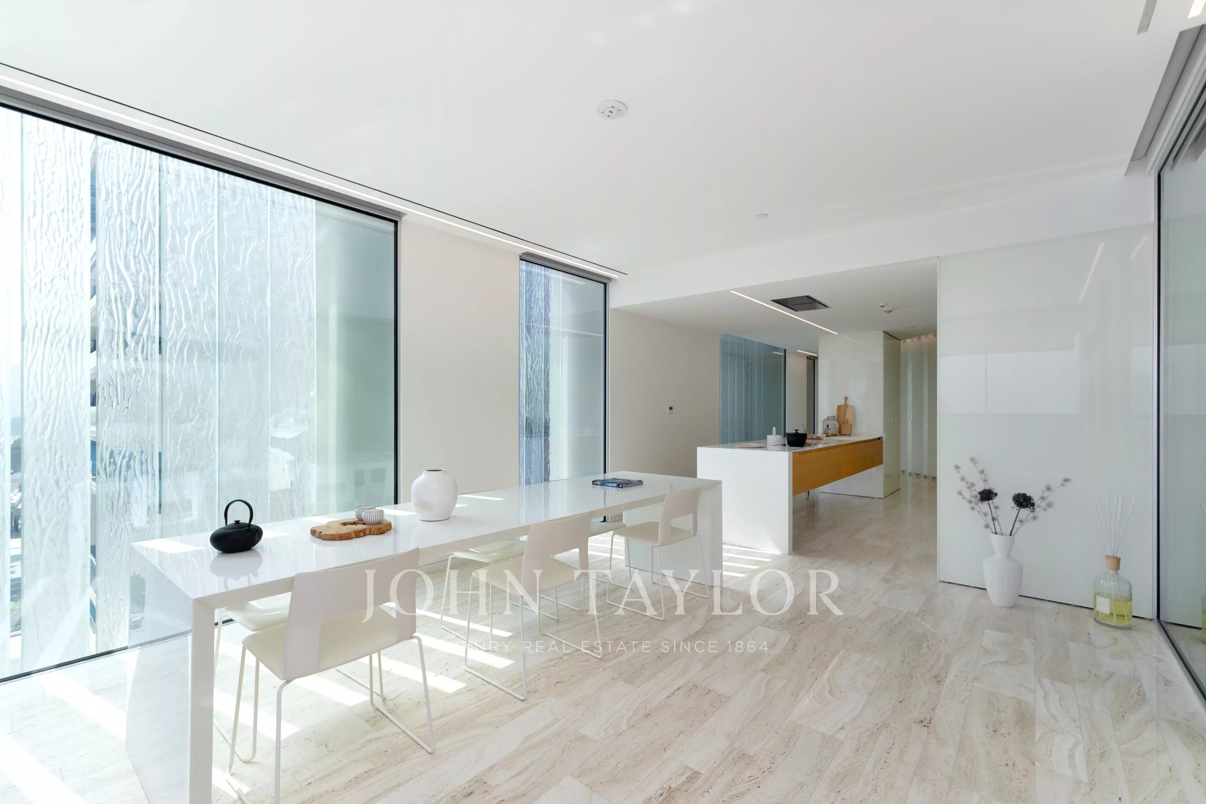 L'abitazione, alla quale si accede tramite un pianerottolo privato dell'ascensore, si apre in un atrio d'ingresso che trasmette immediatamente esclusività e discrezione. Un pianerottolo secondario dell'ascensore semi-privato consente un accesso senza soluzione di continuità per il personale, garantendo la privacy dei residenti e mantenendo al contempo la facilità operativa. La casa è dotata di porte scorrevoli senza telaio di Sky-Frame, comandi a sfioramento di Geberit, apparecchi di illuminazione di Panzeri, ferramenta di d line, oltre a oscuranti wireless e tende motorizzate di Lutron.