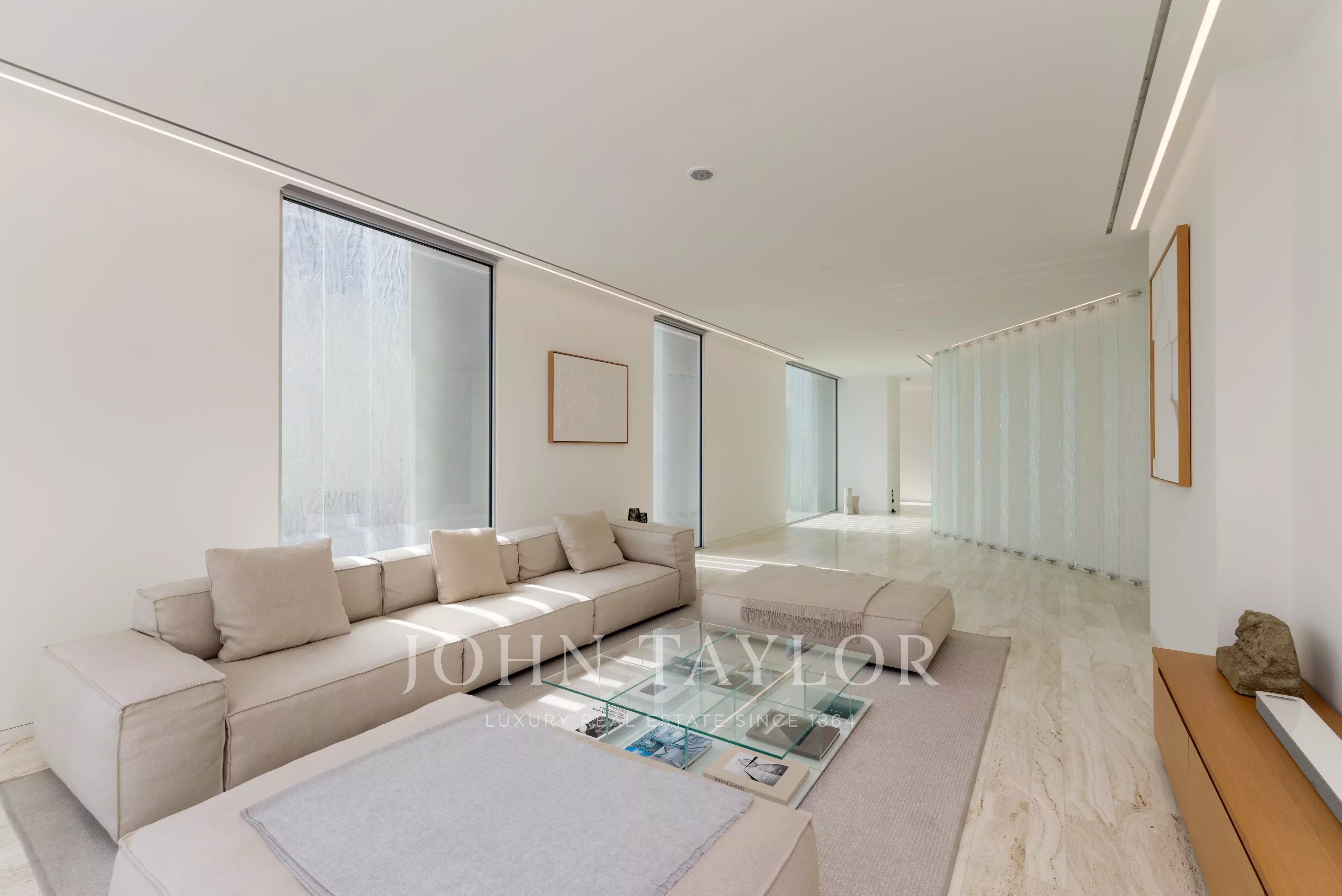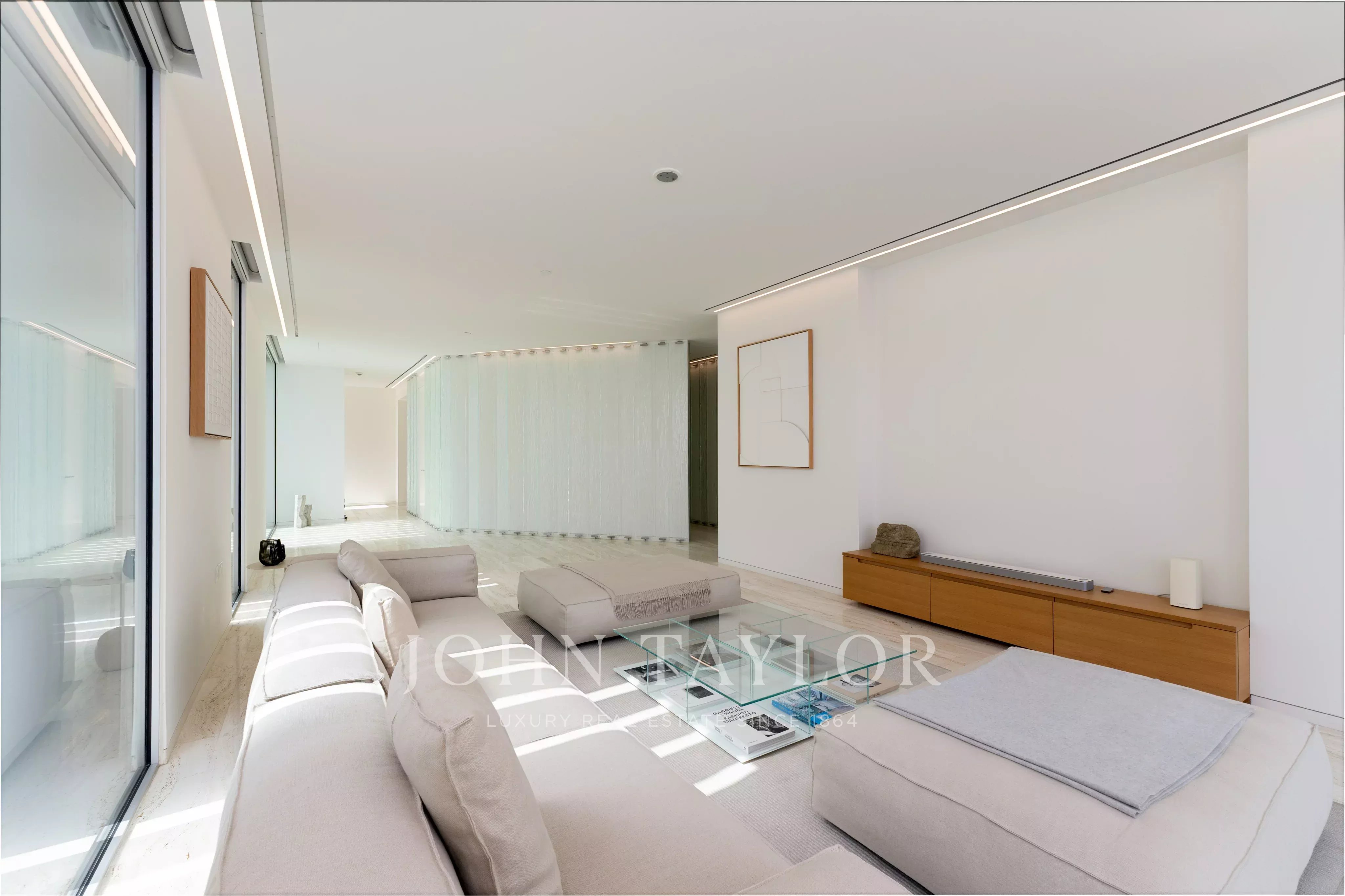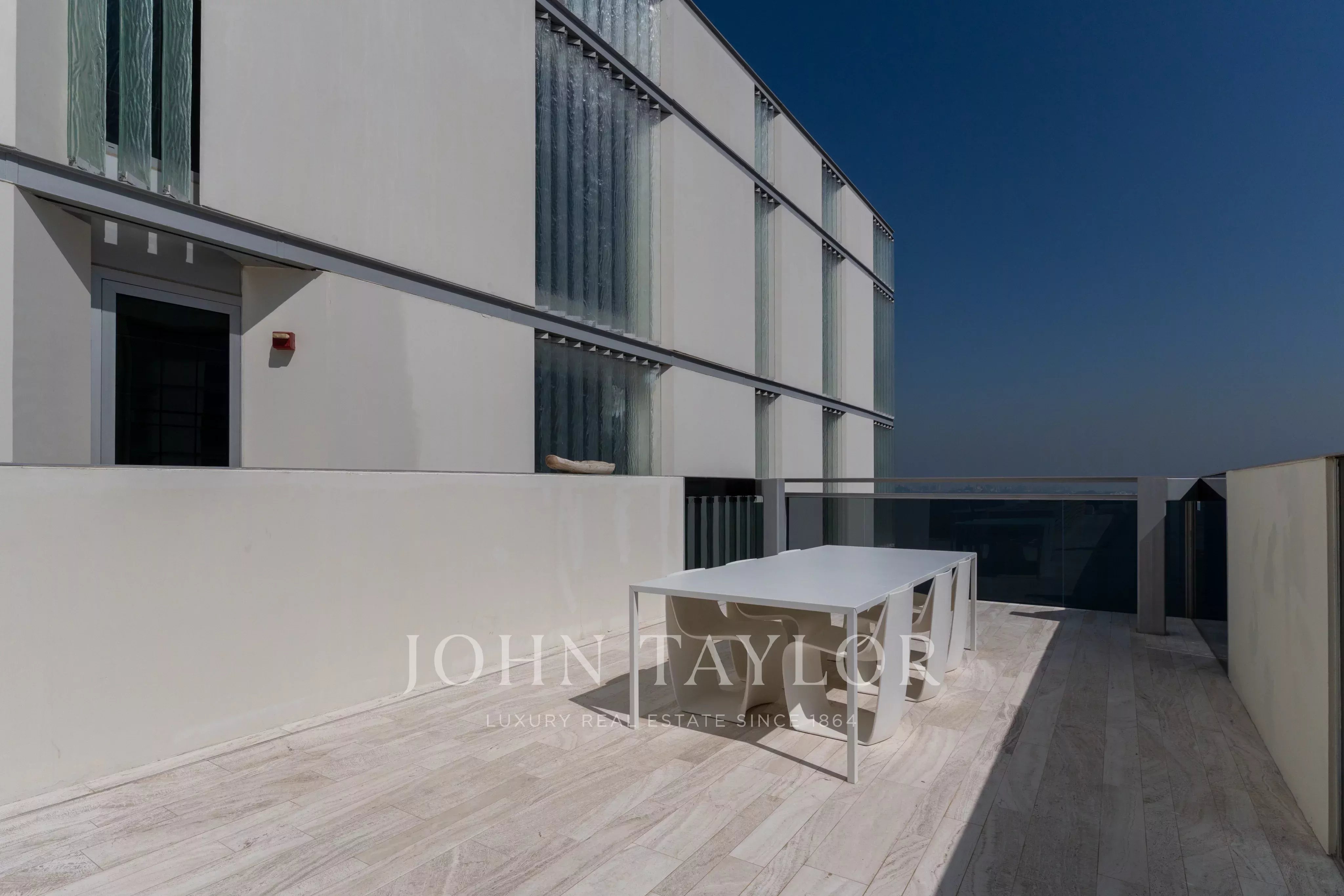 La disposizione si sviluppa in un soggiorno che si estende sulla facciata, progettato per massimizzare la luce e la vista e che si collega direttamente a una straordinaria terrazza di 29 metri. Questo straordinario spazio esterno agisce come un'estensione naturale degli interni e funge da spazio perfetto per l'intrattenimento, completo di un'area per i lettini.