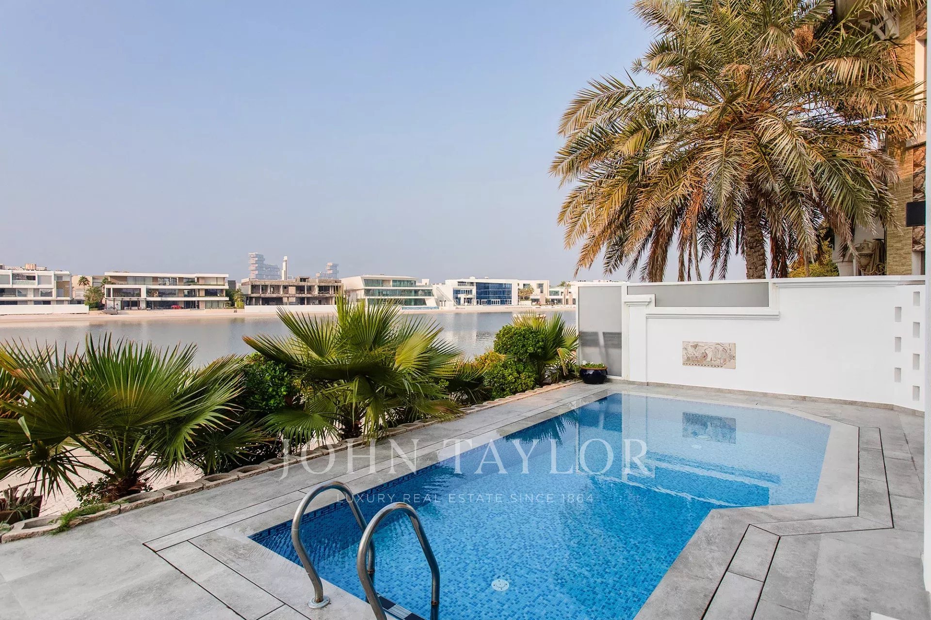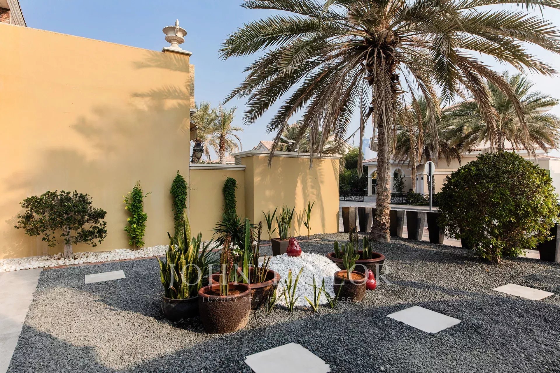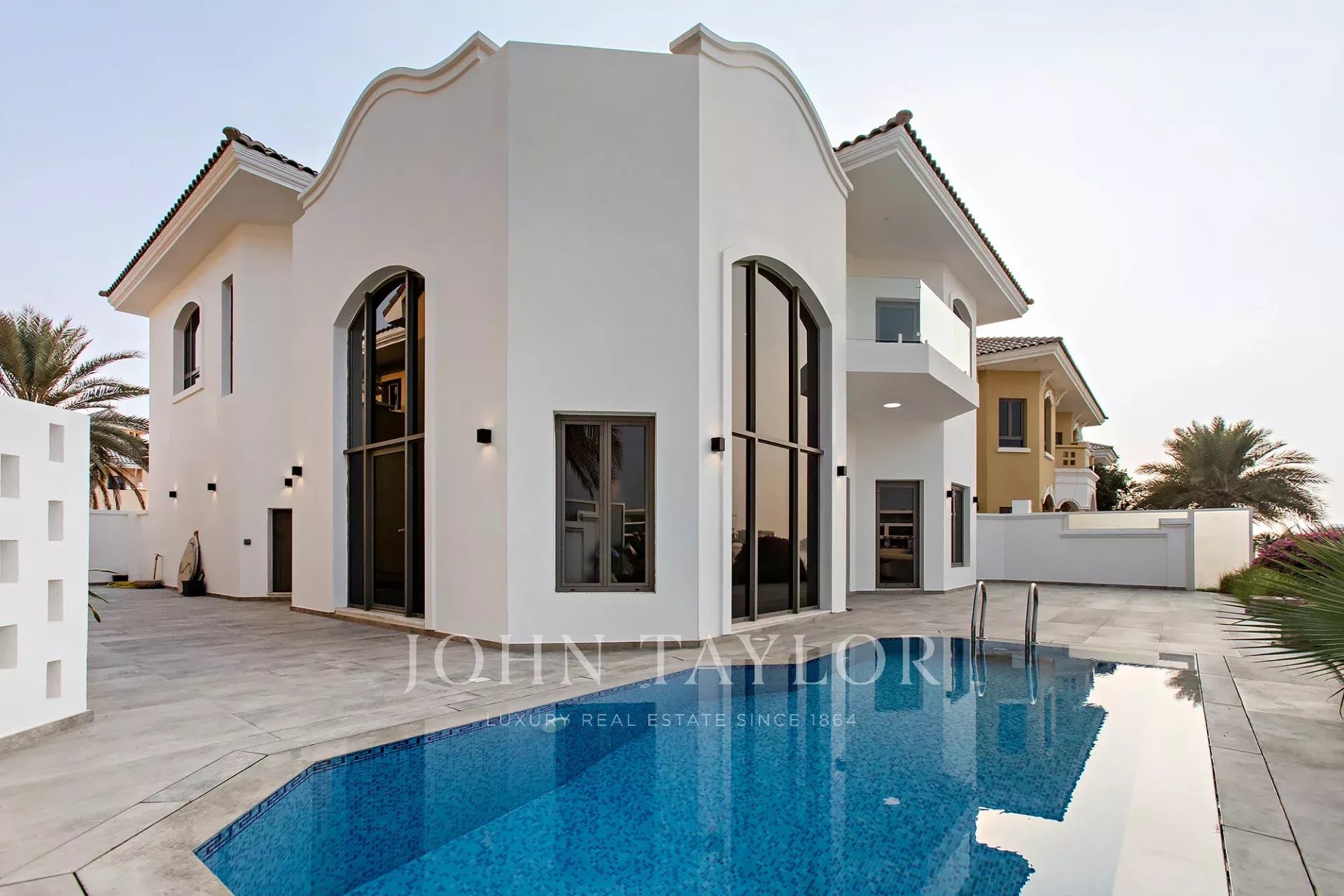 Situata su un terreno di 623 m² con un'area edificata di 465 m², questa raffinata proprietà fonde aggiornamenti moderni con il fascino senza tempo di Palm Jumeirah.