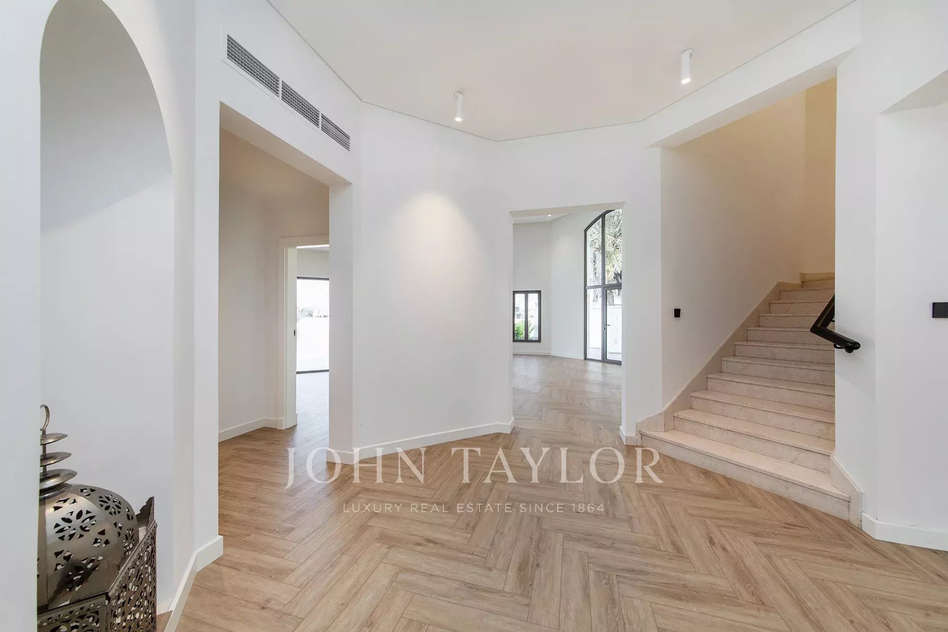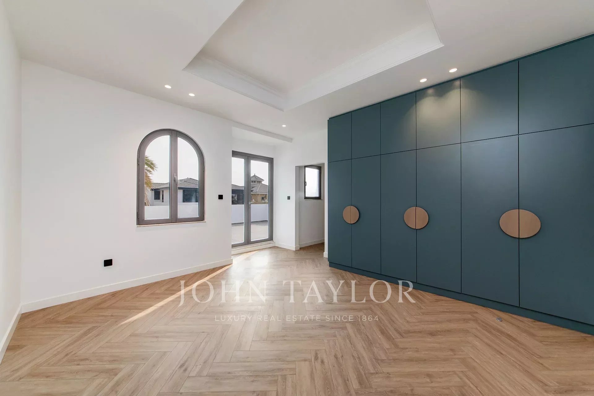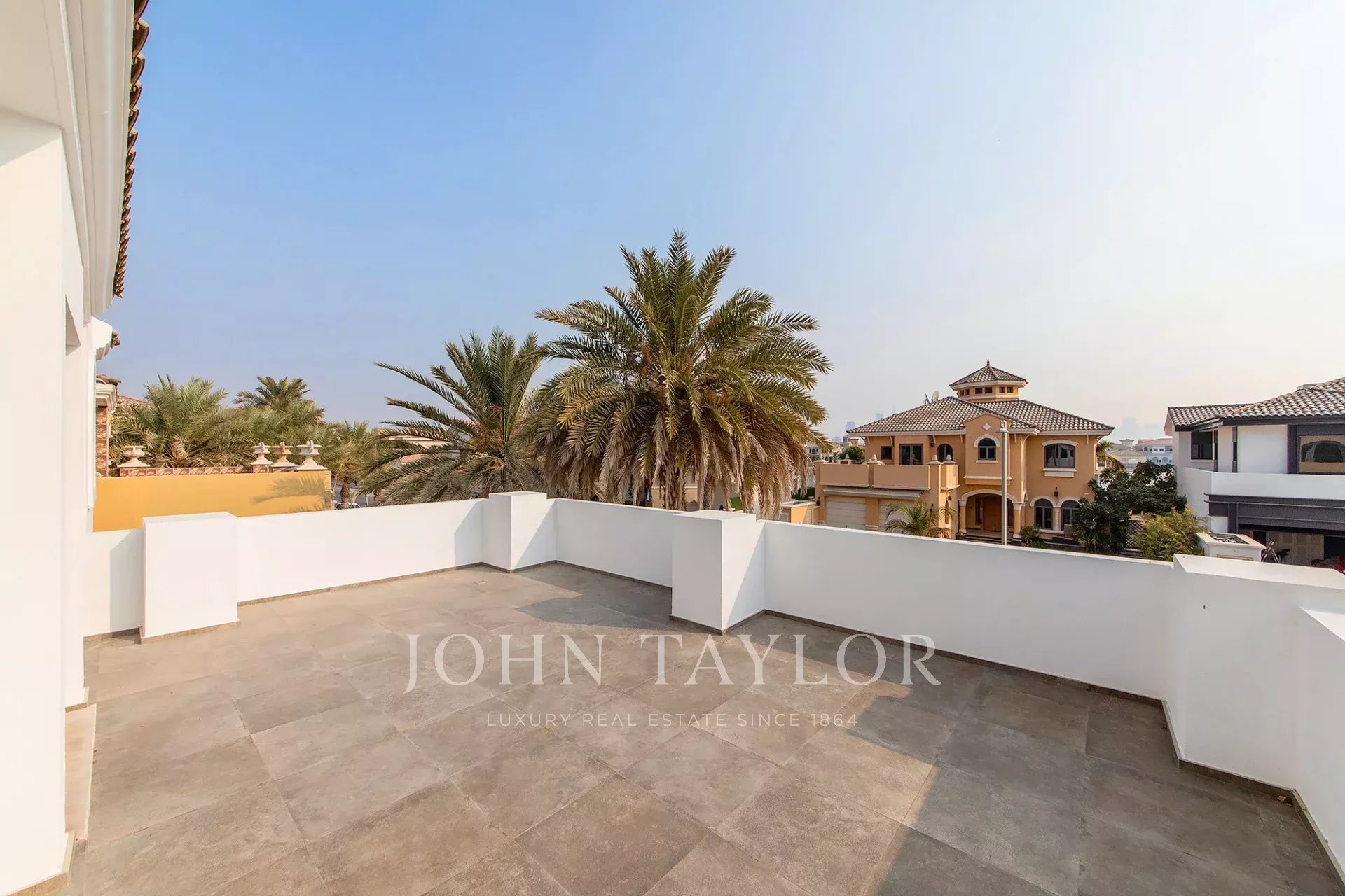 Situata su un terreno di 623 m² con un'area edificata di 465 m², questa raffinata proprietà fonde aggiornamenti moderni con il fascino senza tempo di Palm Jumeirah.
