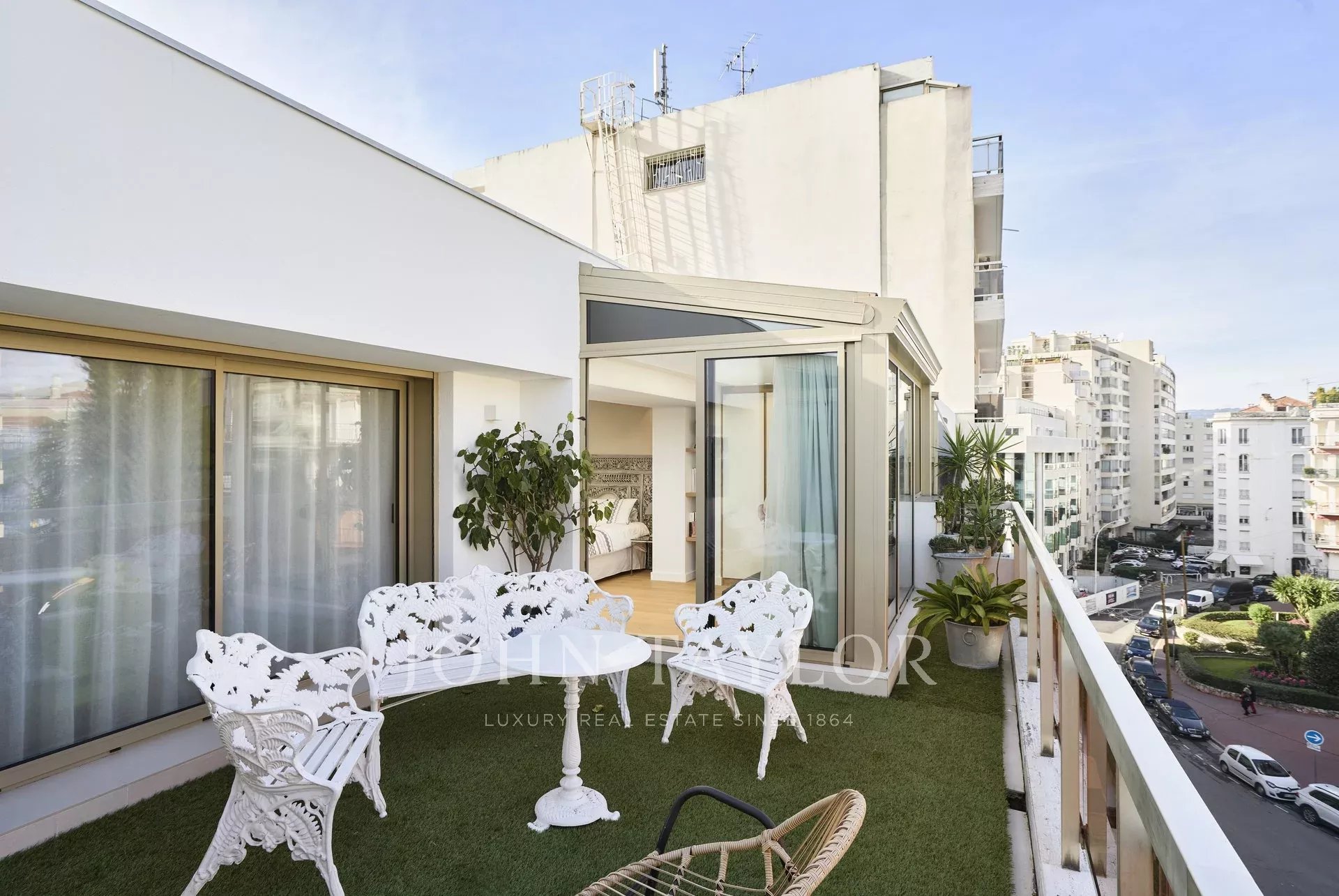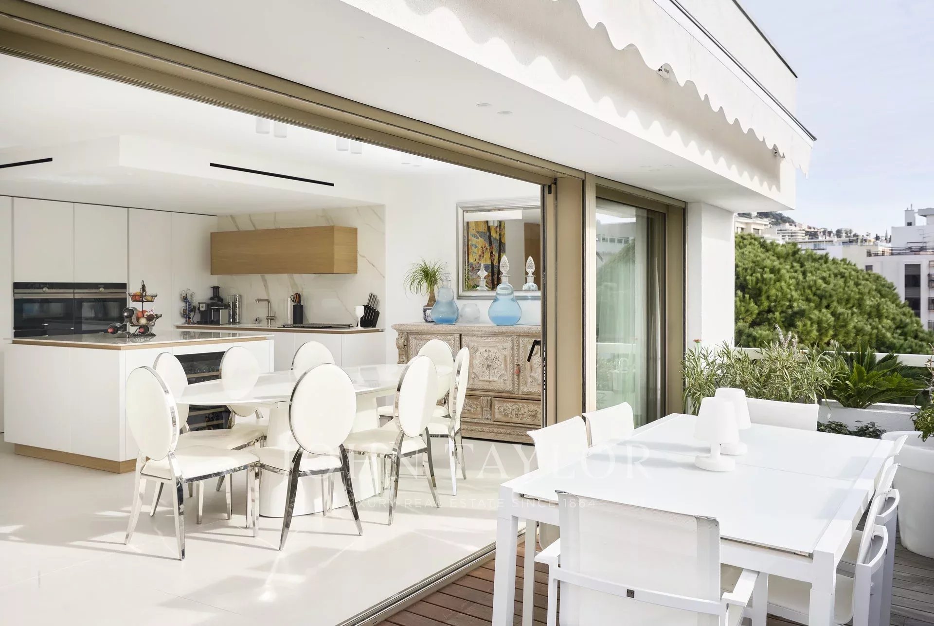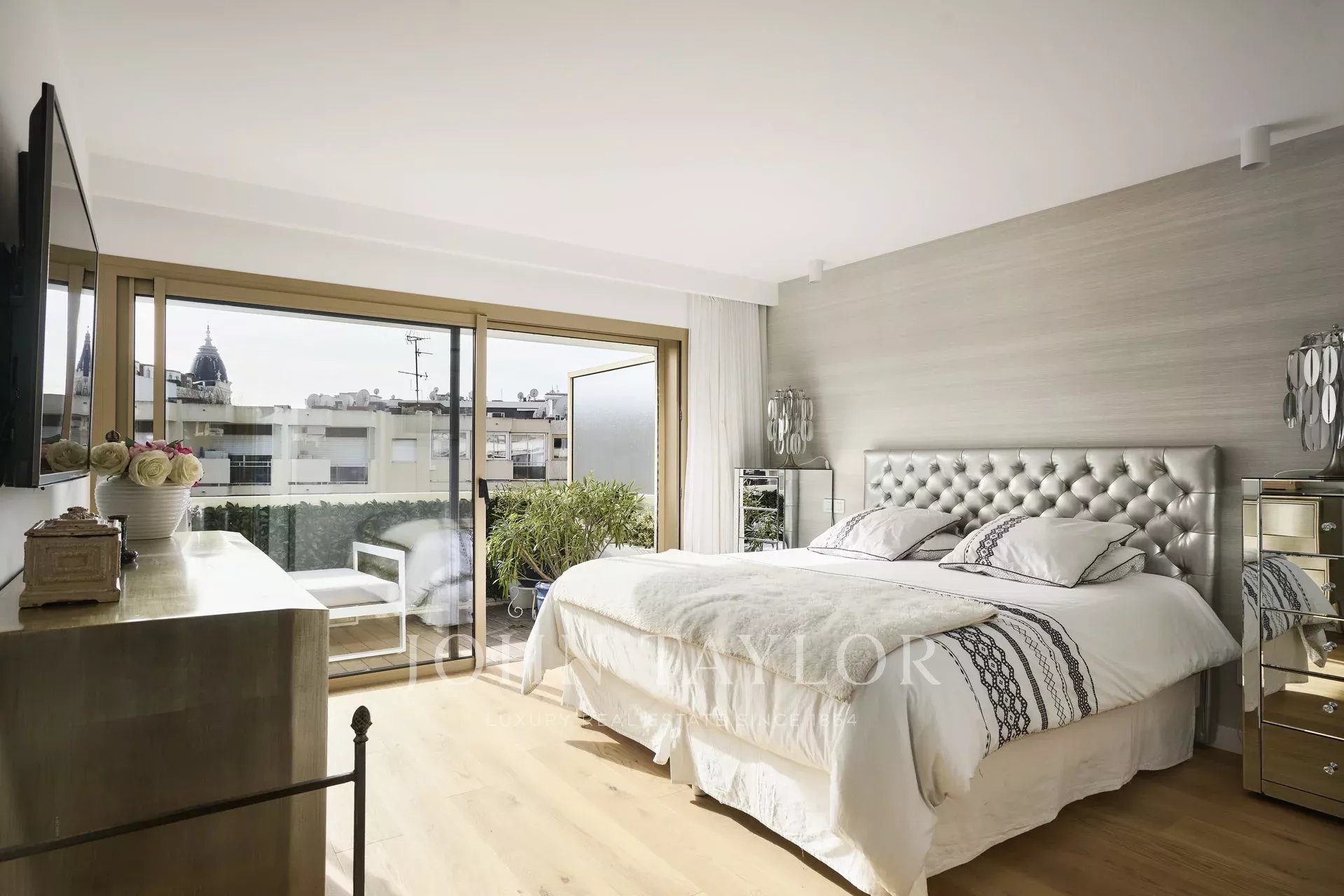 Appartamento esposto a sud, contemporaneo e completamente climatizzato, con 165 m2 di superficie abitabile, all'ultimo piano (5°) di una residenza del centro città, a pochi minuti a piedi dalle spiagge e dal Palais des Festivals.