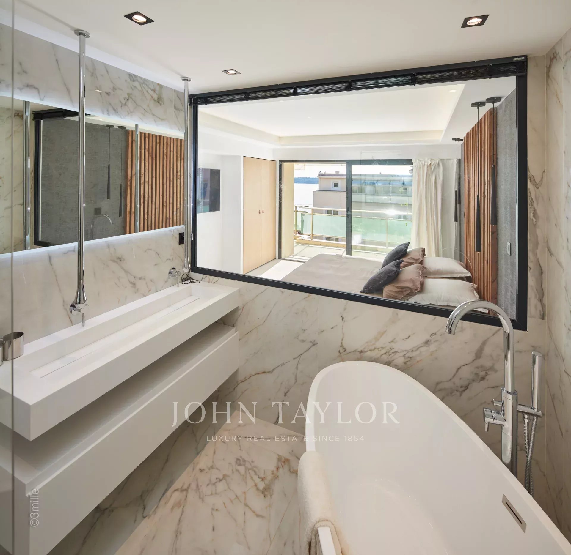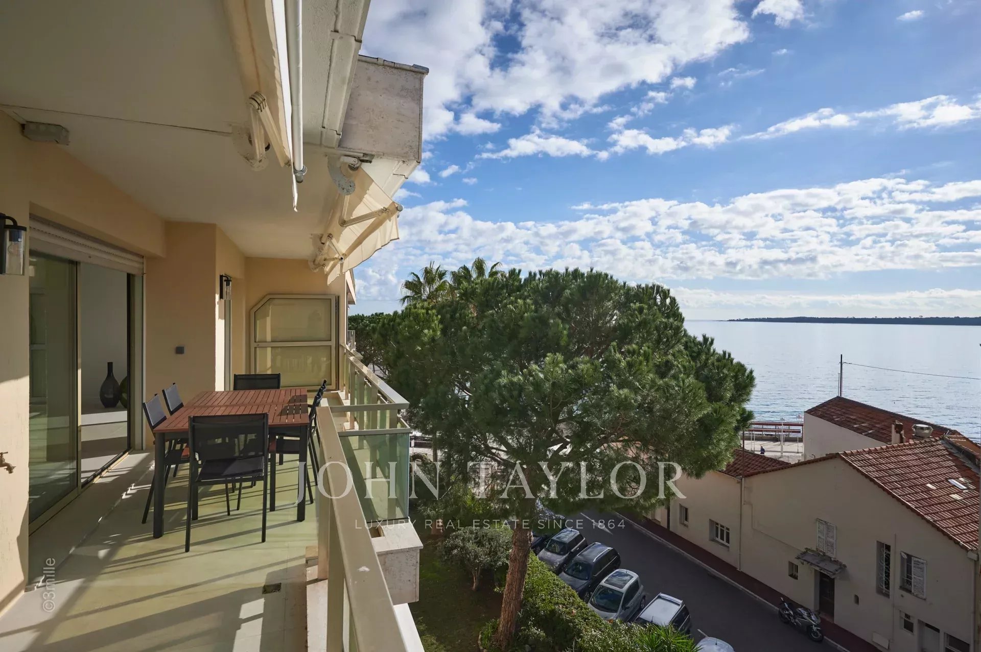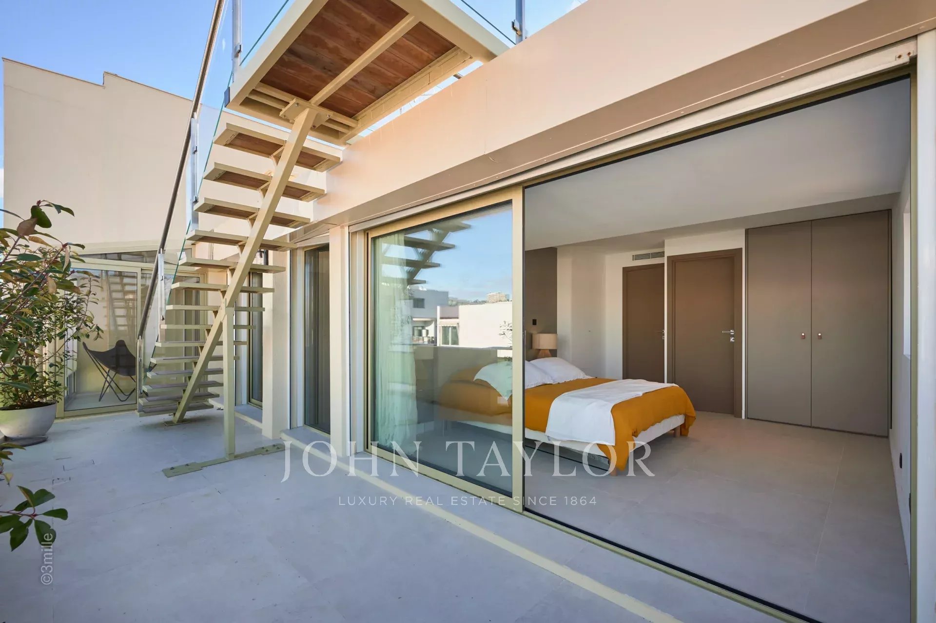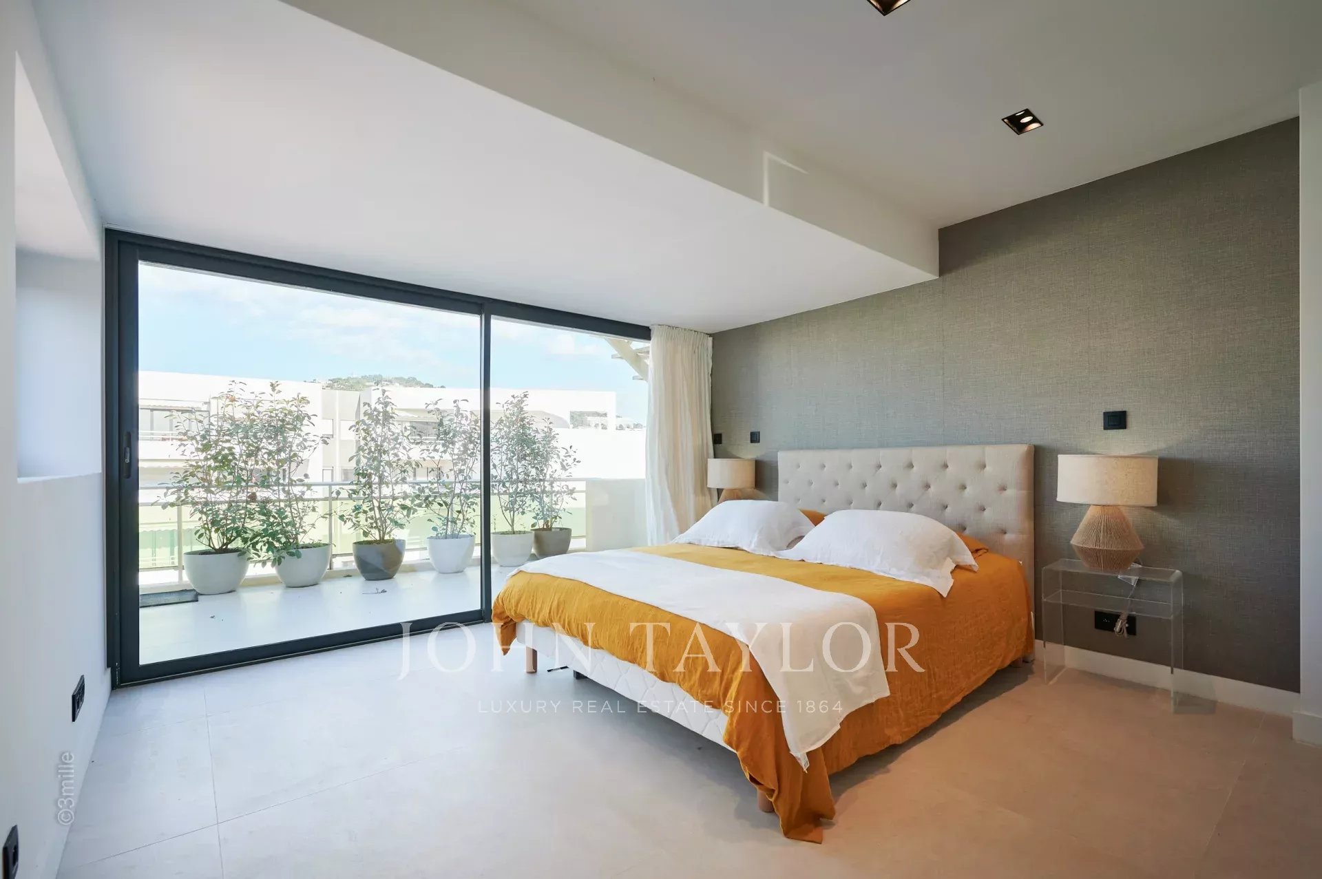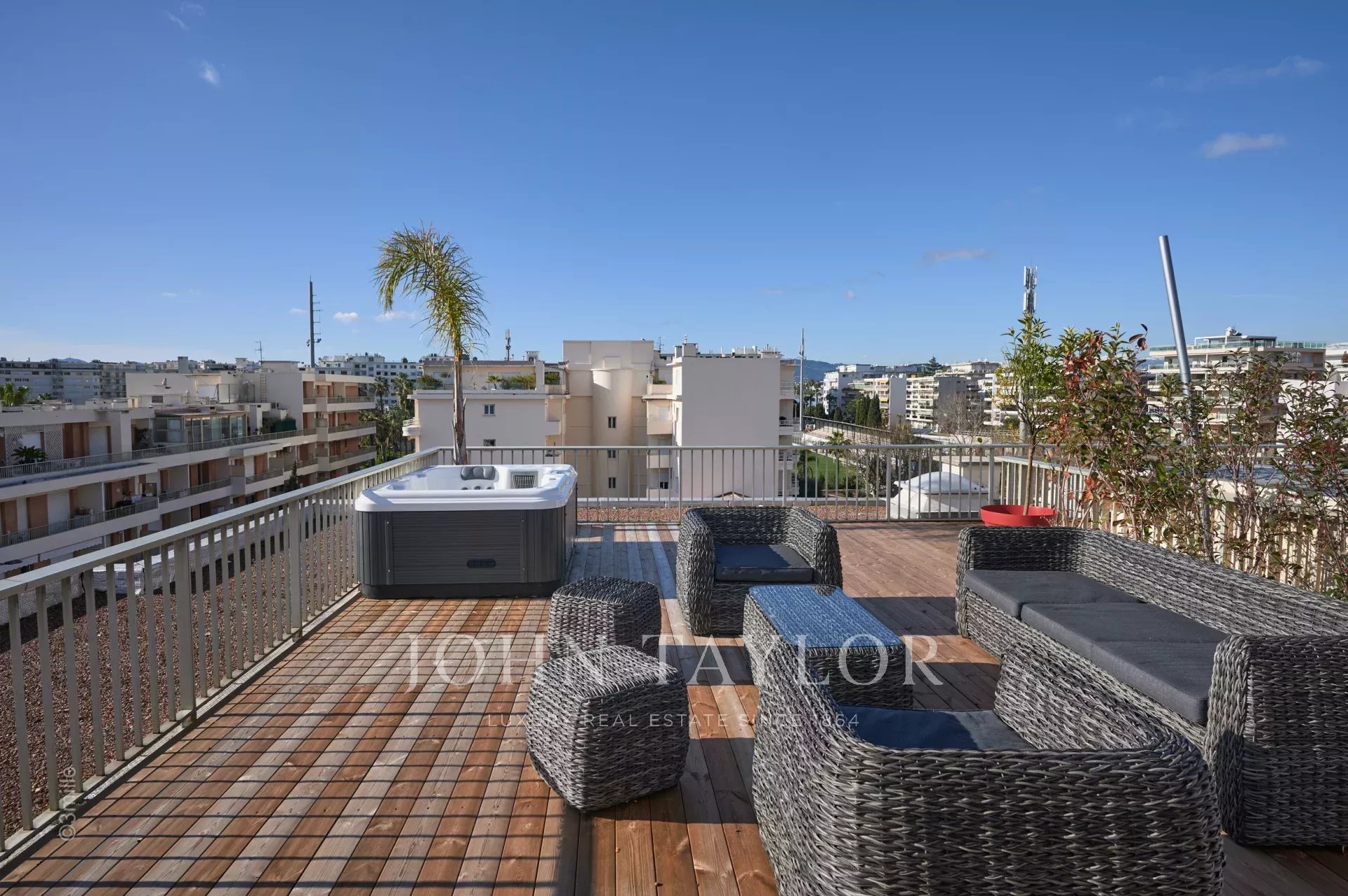 Nel quartiere di Palm Beach, vicino al porto e alle spiagge di "Mouré Rouge", al 4° e ultimo piano, bellissimo appartamento di circa 140 m², con una splendida terrazza sul tetto di 130 m² con salotto estivo, barbecue e vasca idromassaggio, che offre una splendida vista sulla baia di Cannes e sulle isole Lérins (accesso dalla terrazza posteriore dell'appartamento).