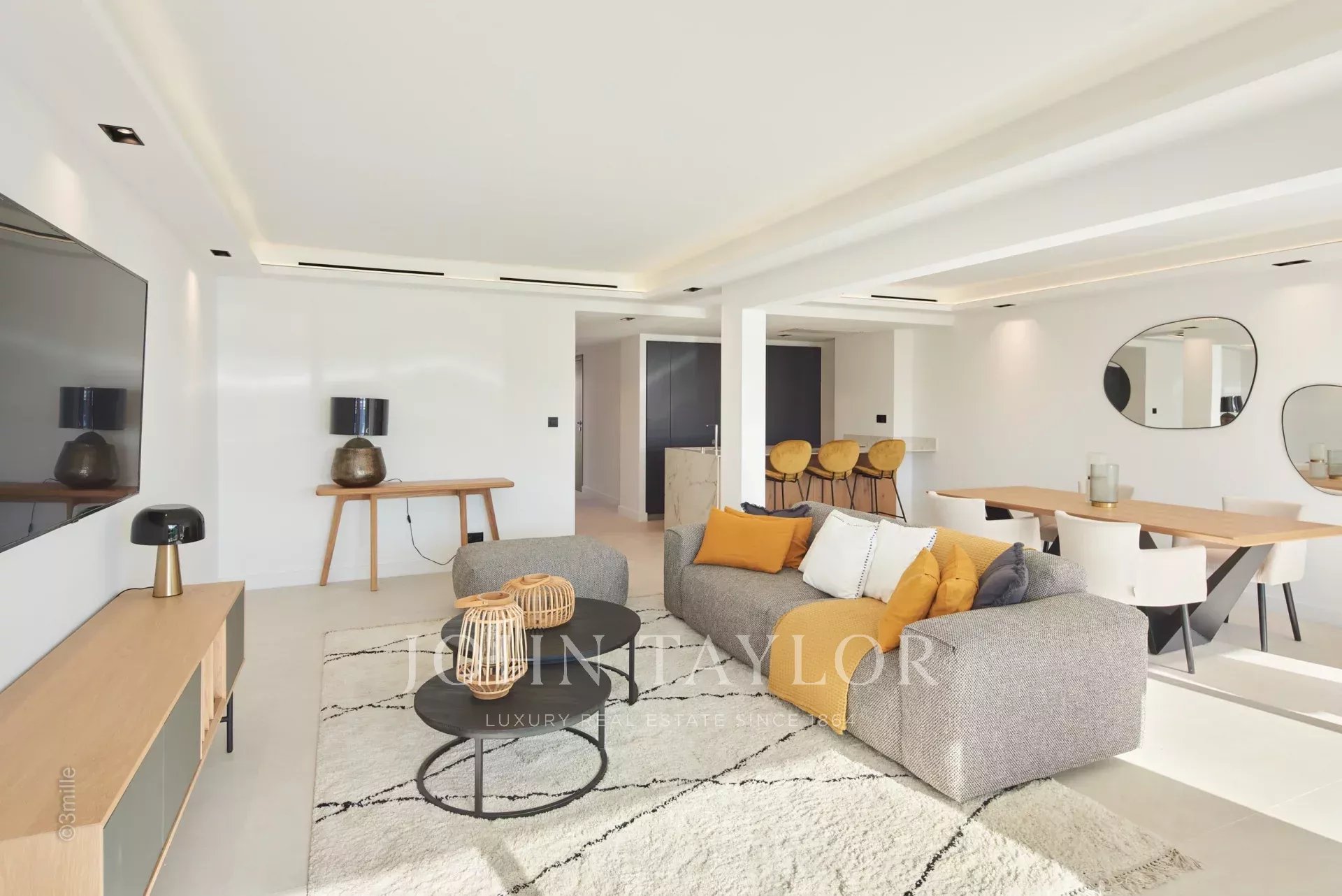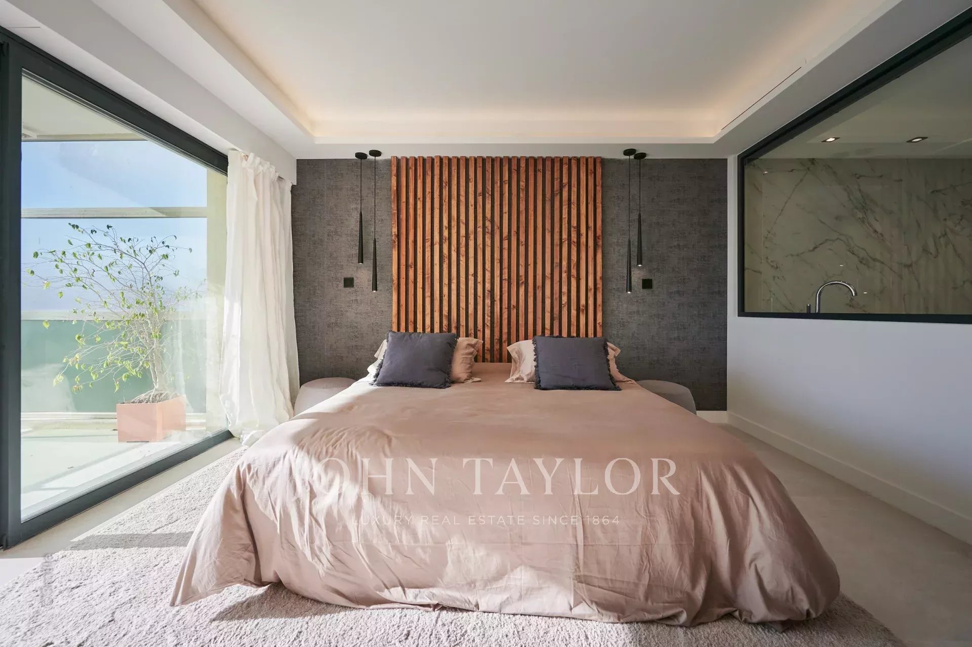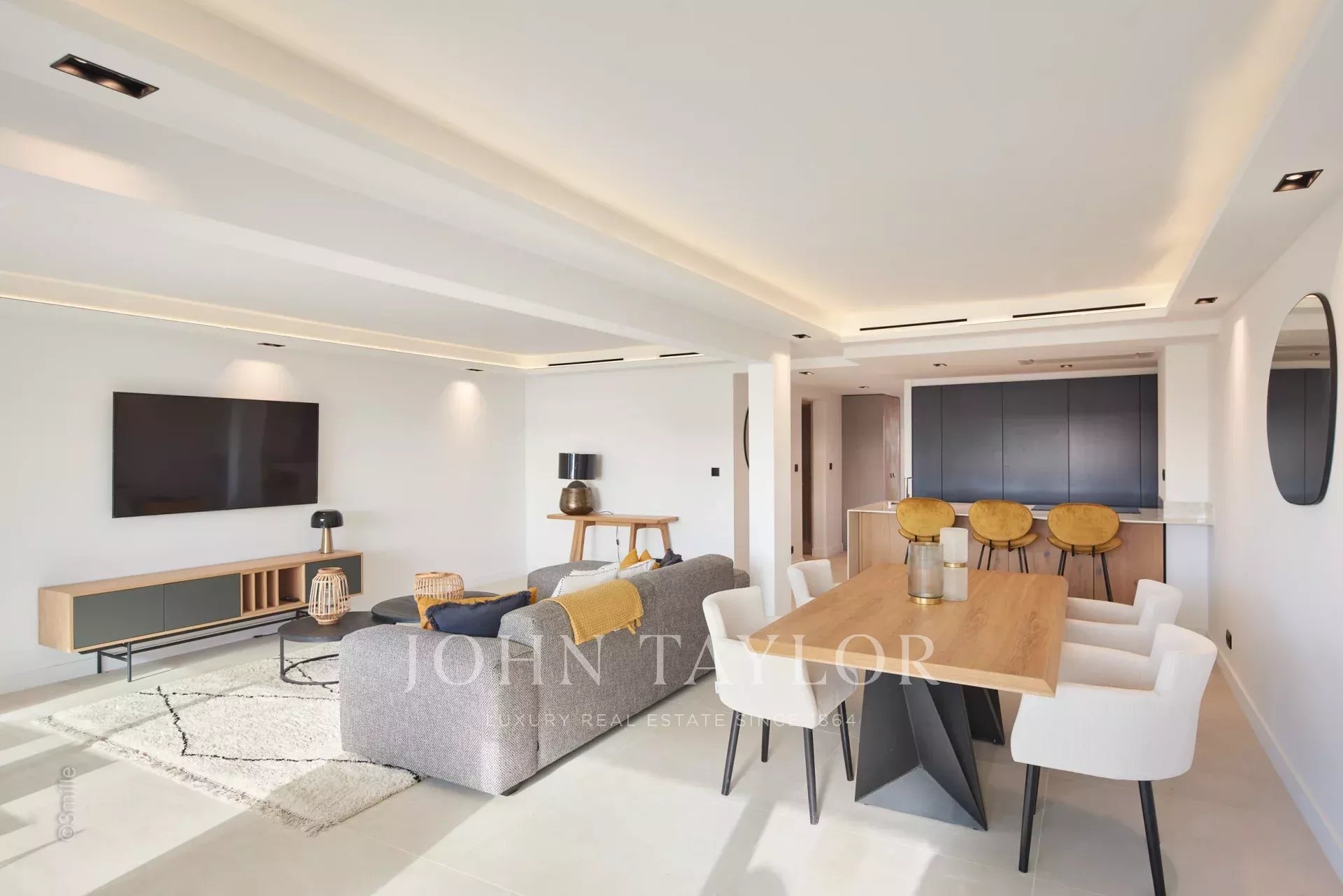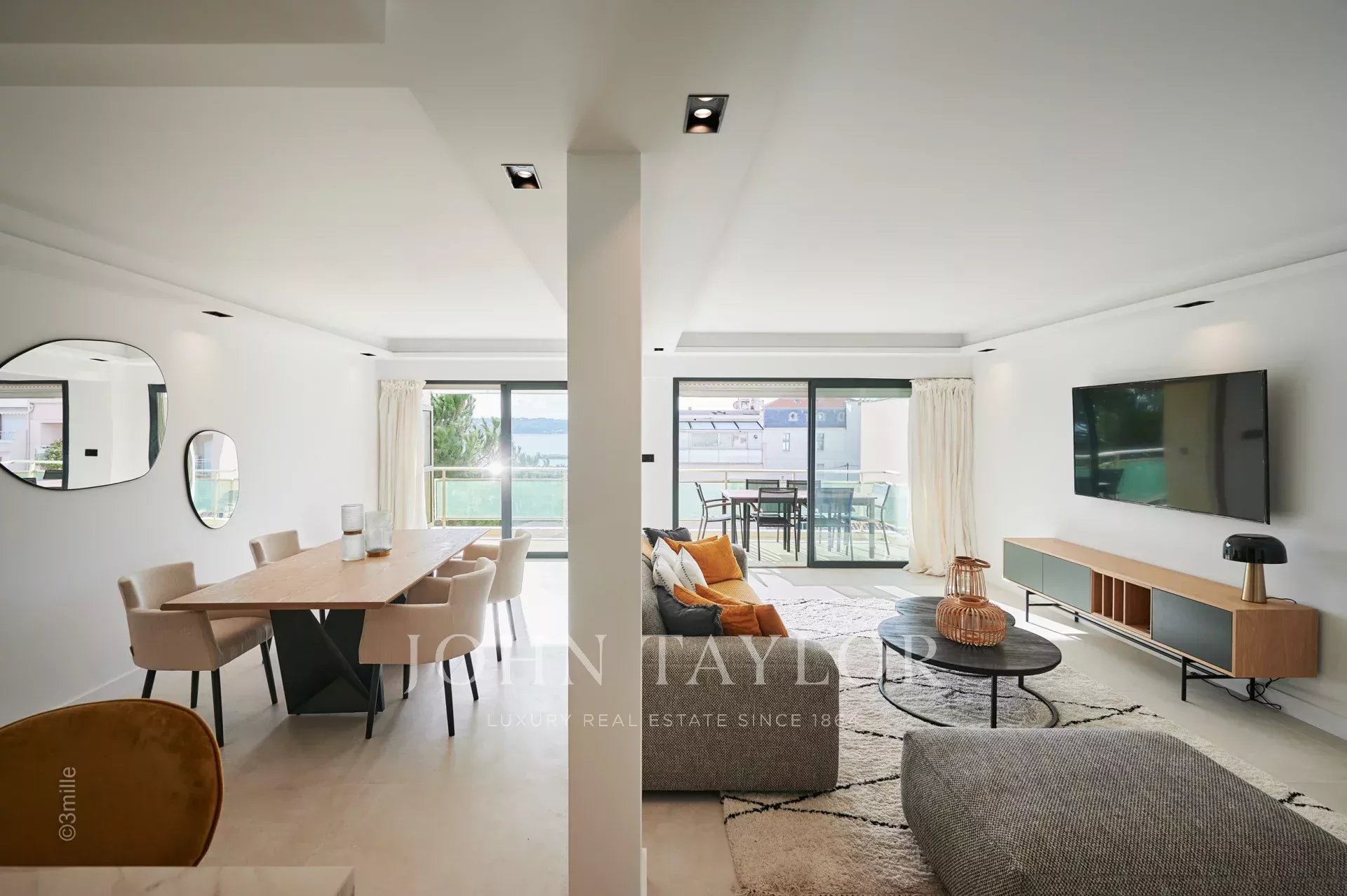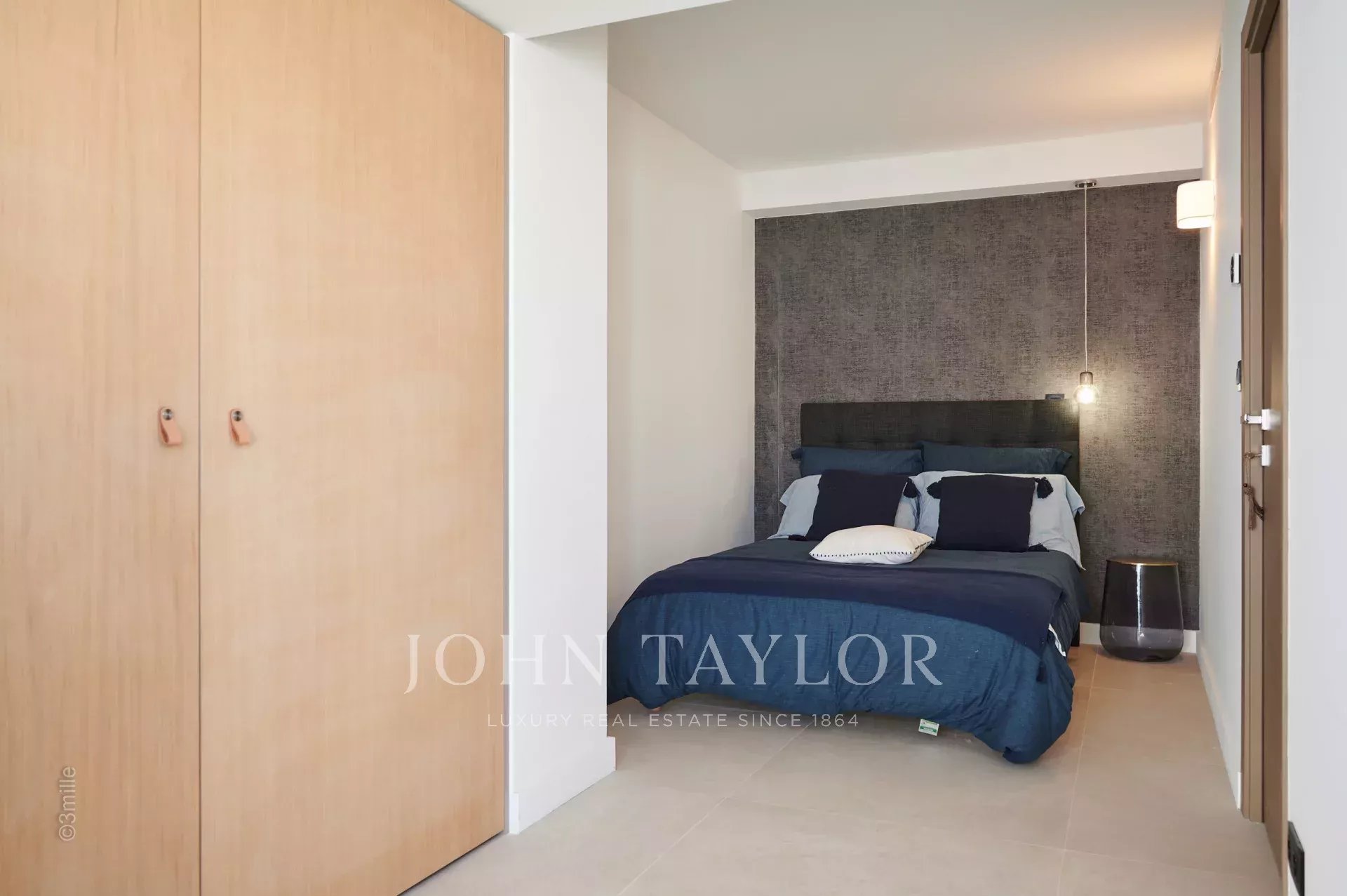 Nel quartiere di Palm Beach, vicino al porto e alle spiagge di "Mouré Rouge", al 4° e ultimo piano, bellissimo appartamento di circa 140 m², con una splendida terrazza sul tetto di 130 m² con salotto estivo, barbecue e vasca idromassaggio, che offre una splendida vista sulla baia di Cannes e sulle isole Lérins (accesso dalla terrazza posteriore dell'appartamento).