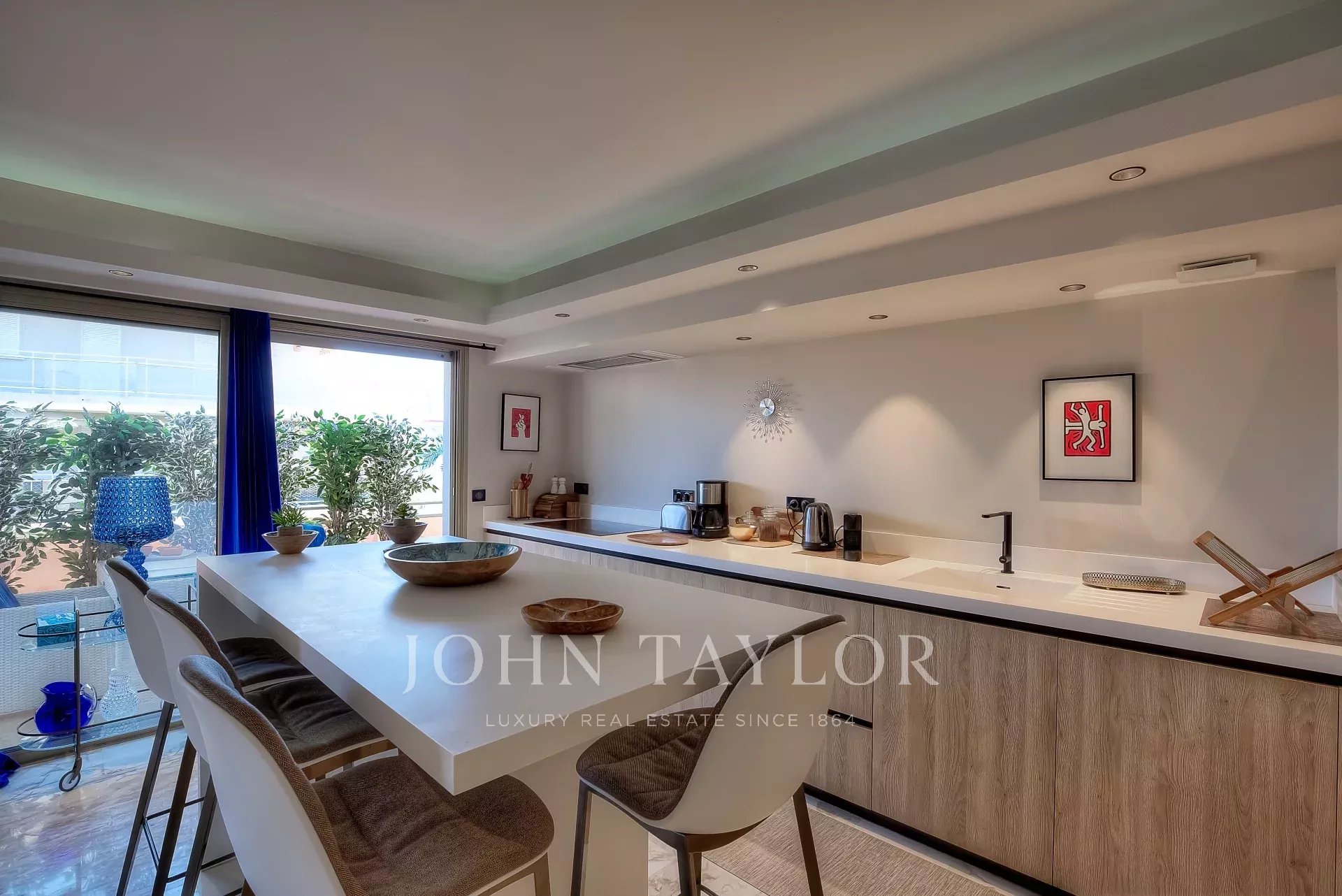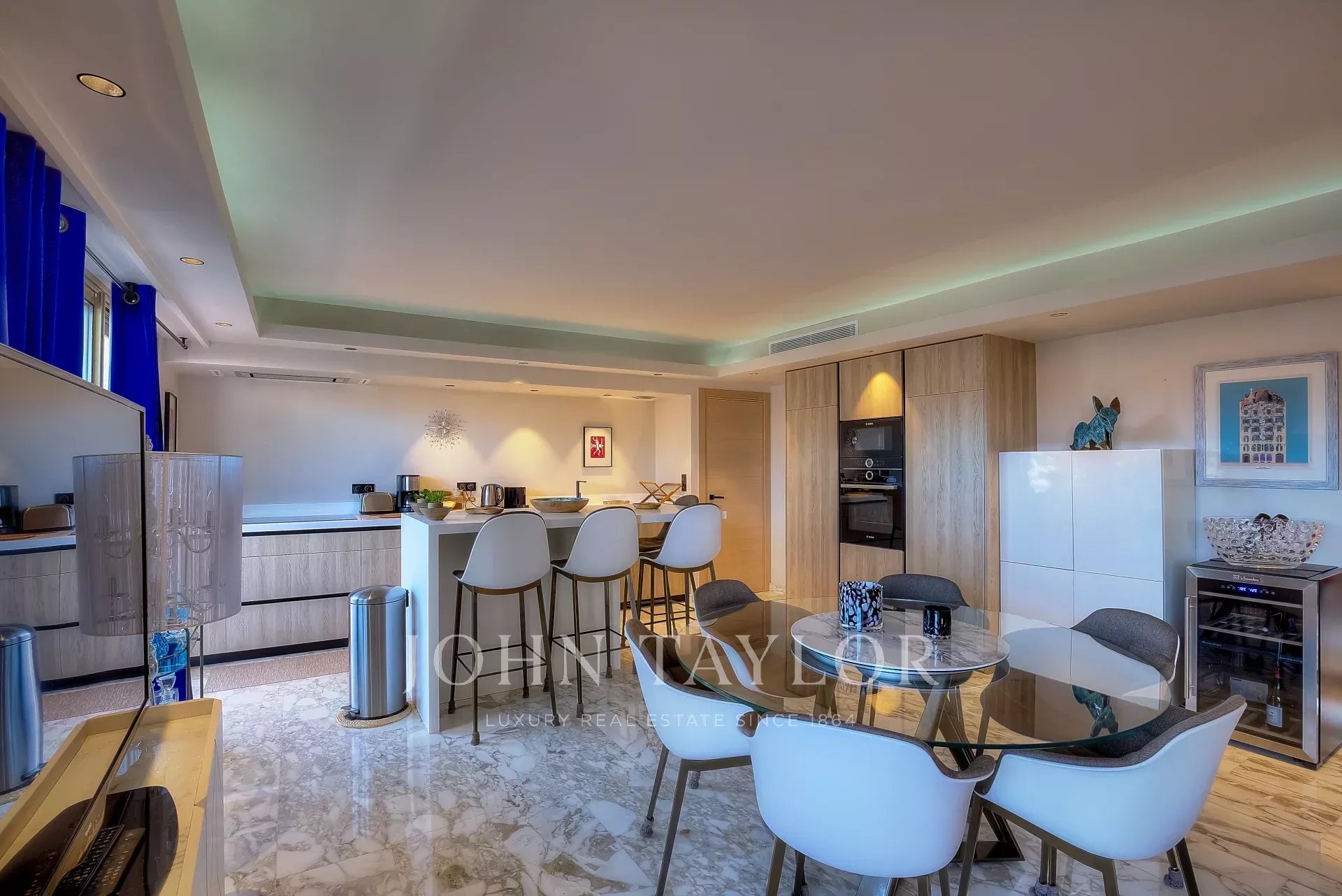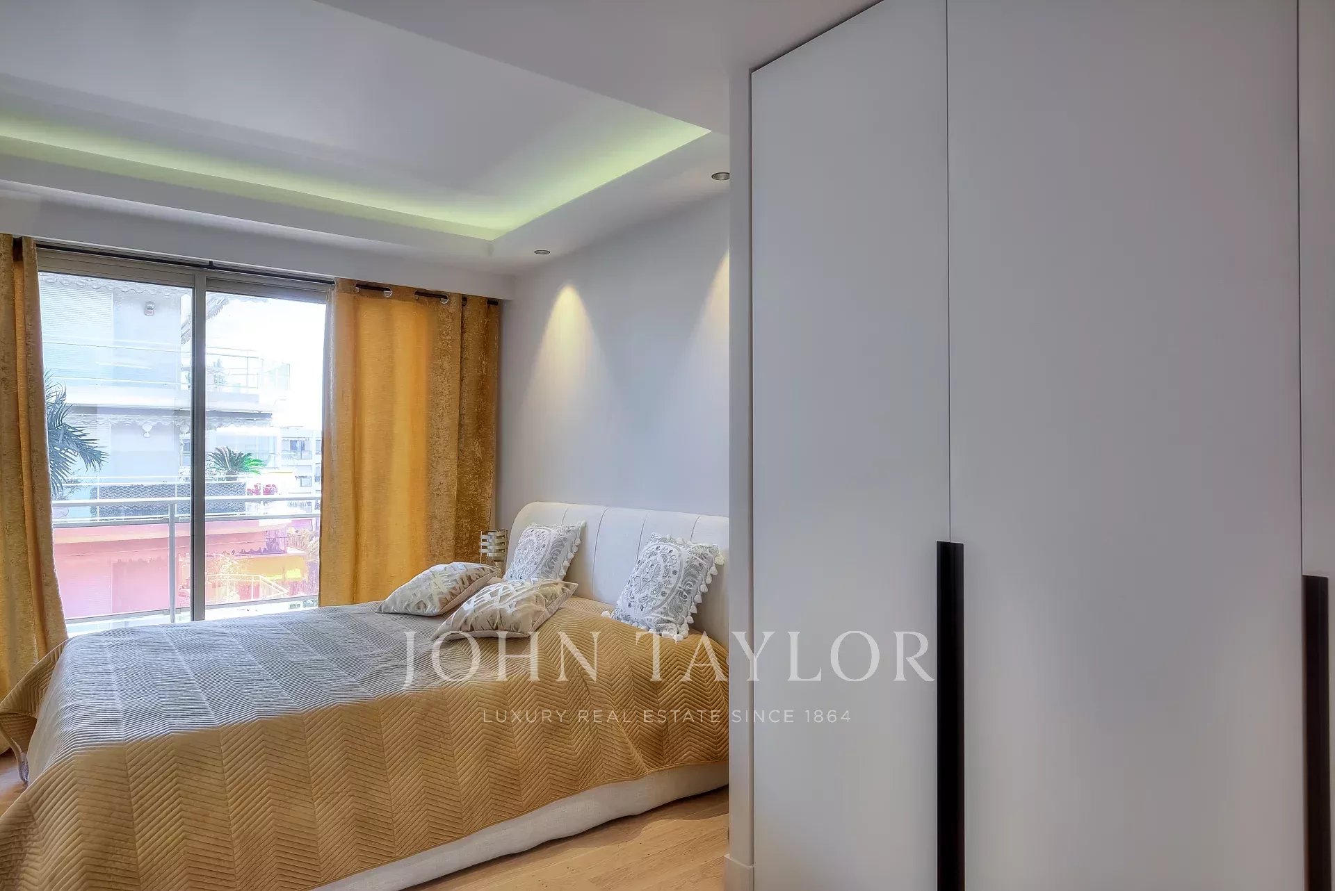 In una residenza di lusso, seconda fila della Croisette, superbo appartamento contemporaneo di 100 m2 con terrazza sul tetto di 176 m2 con piscina privata (5,5 m x 3 m), lettini, salotto, zona pranzo e cucina estiva con barbecue.