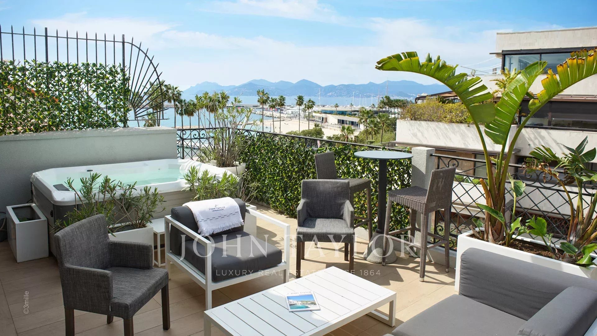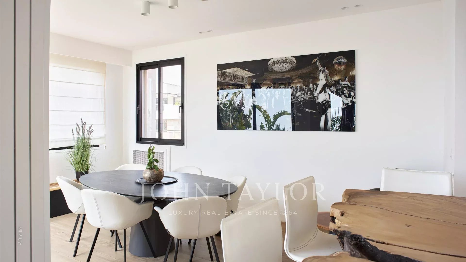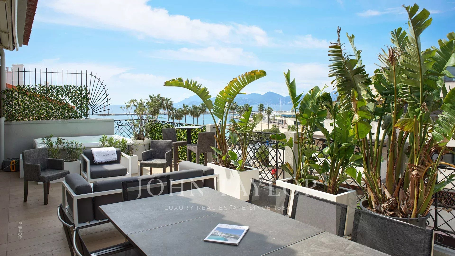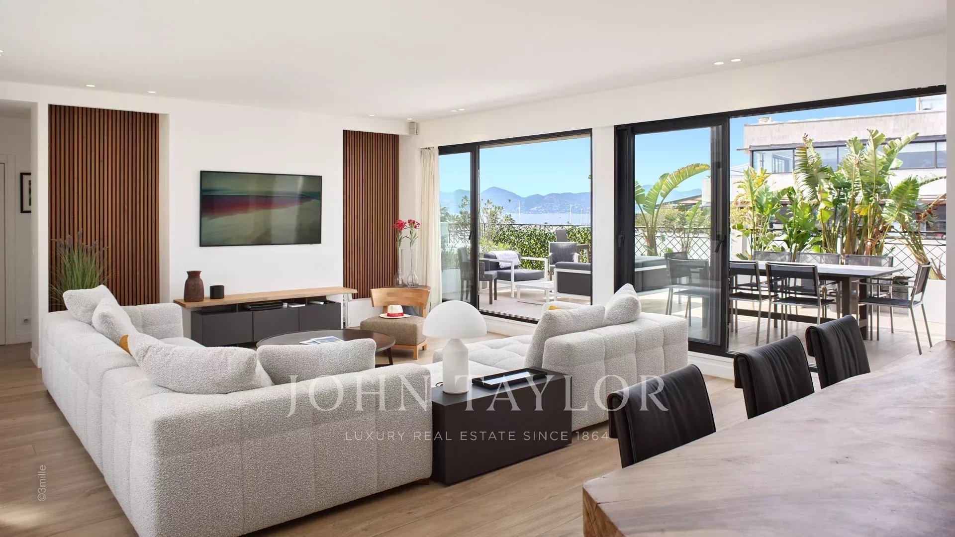 In una posizione tranquilla, vicino al Palais des Festivals, questo superbo appartamento contemporaneo offre 130 m2 di spazio abitativo, completamente climatizzato e ristrutturato secondo standard elevati, con due ampie terrazze e una splendida vista sul mare.