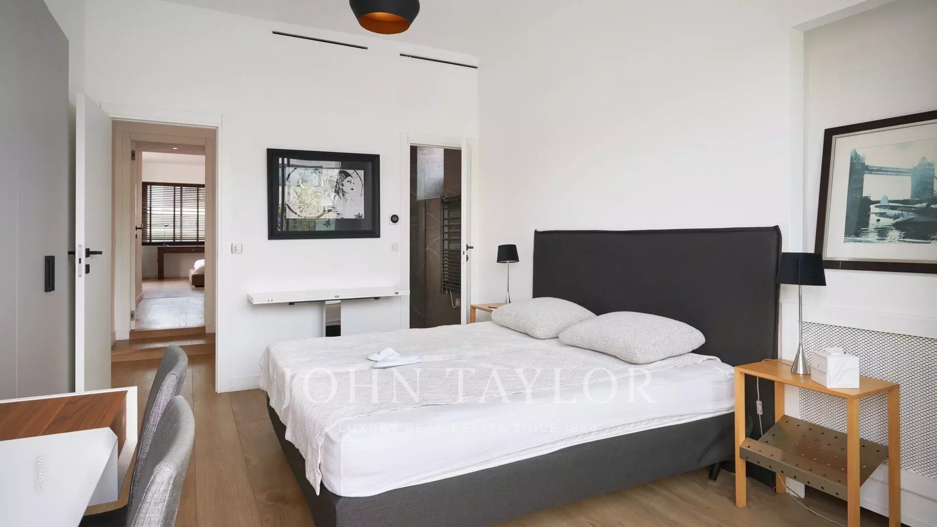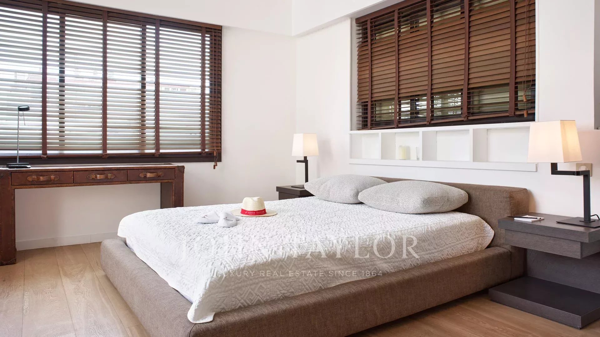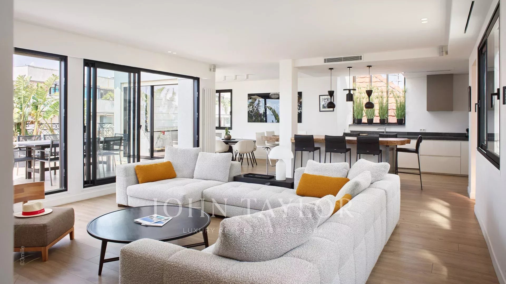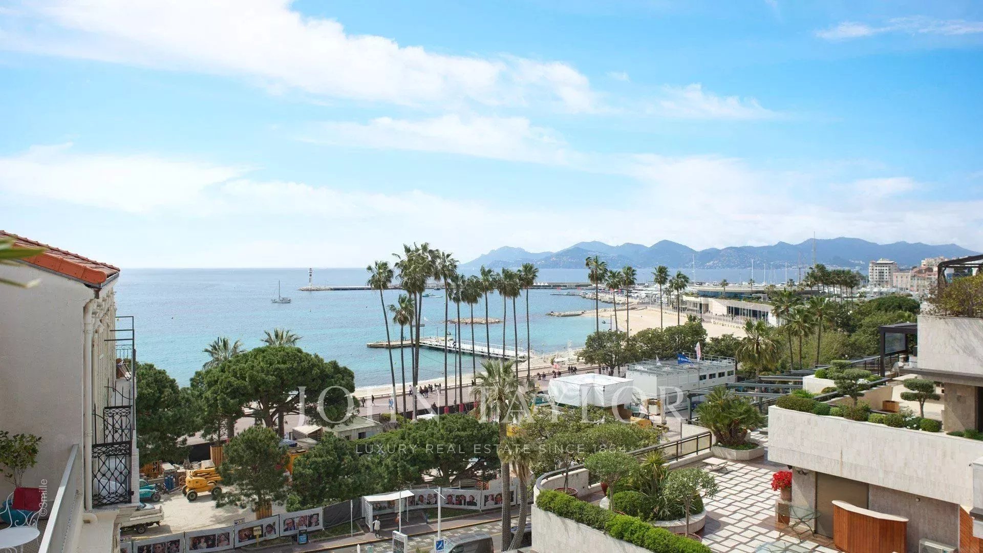 In una posizione tranquilla, vicino al Palais des Festivals, questo superbo appartamento contemporaneo offre 130 m2 di spazio abitativo, completamente climatizzato e ristrutturato secondo standard elevati, con due ampie terrazze e una splendida vista sul mare.