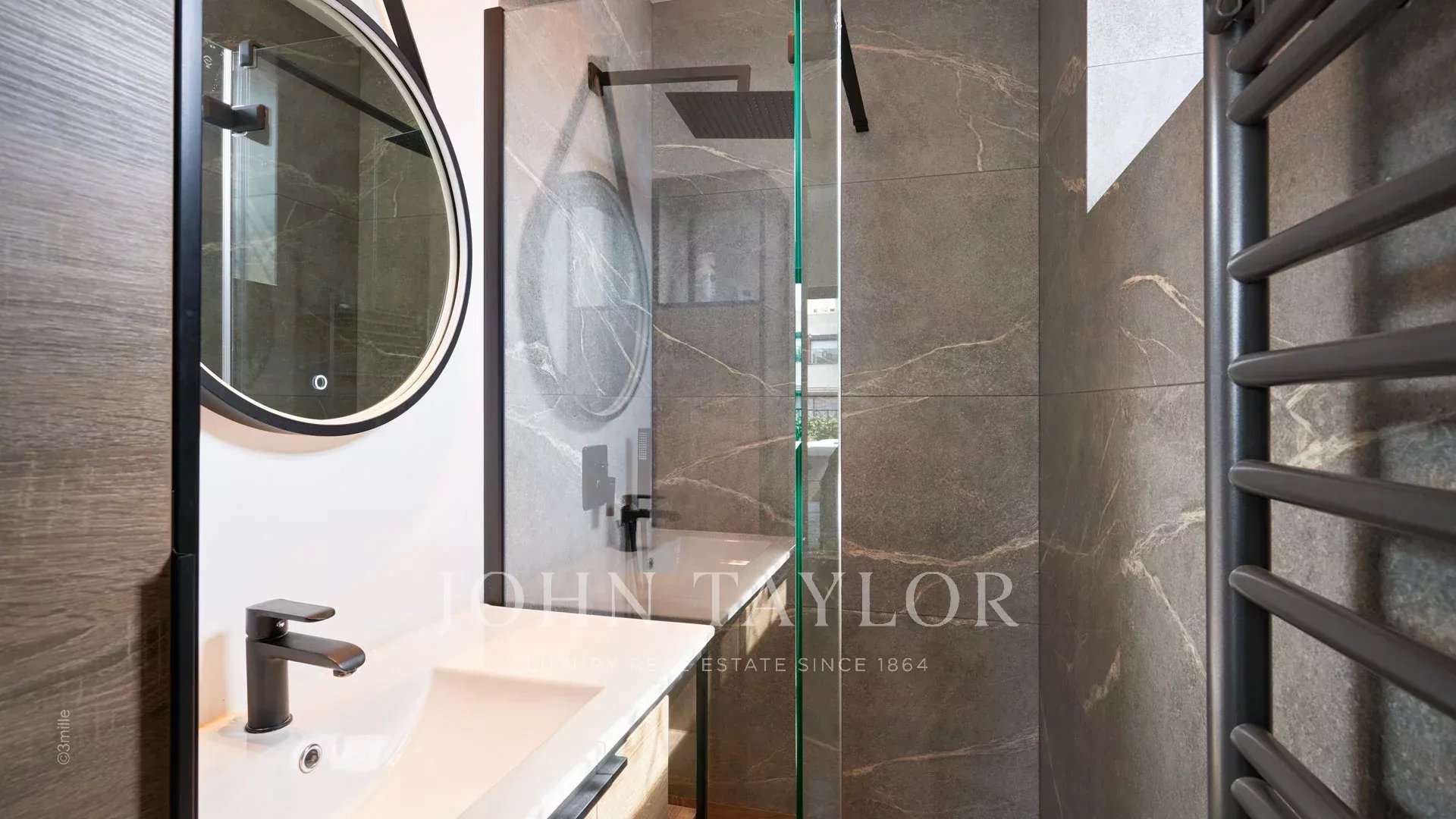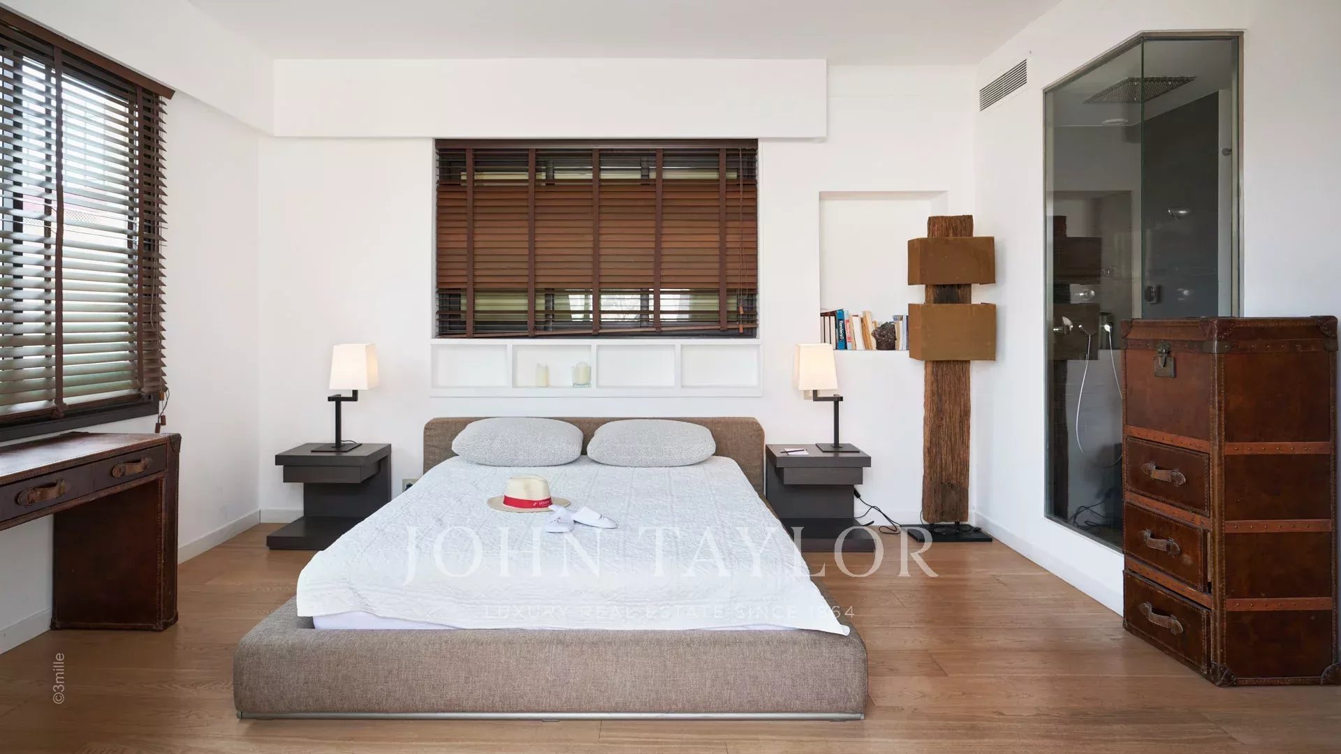 Camera da letto principale (letto da 180 cm - armadi) che si apre su una terrazza di 50 m² con bagno privato con doccia.