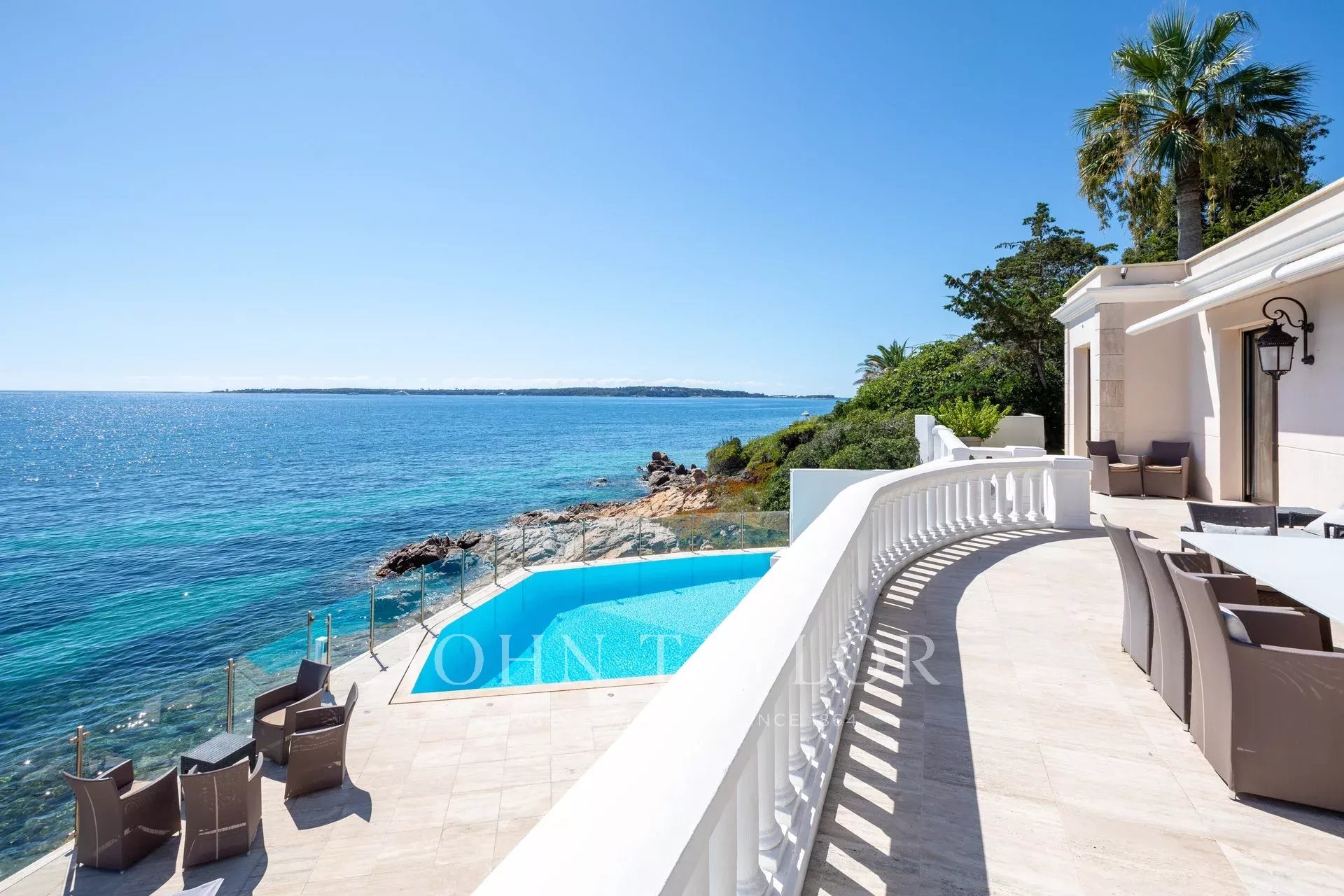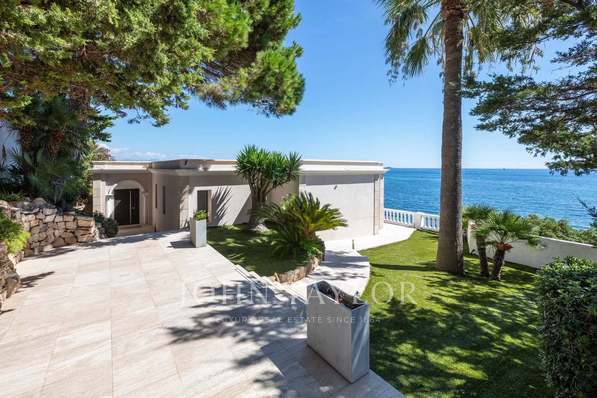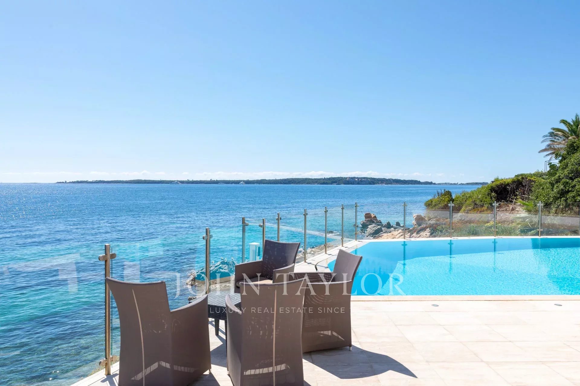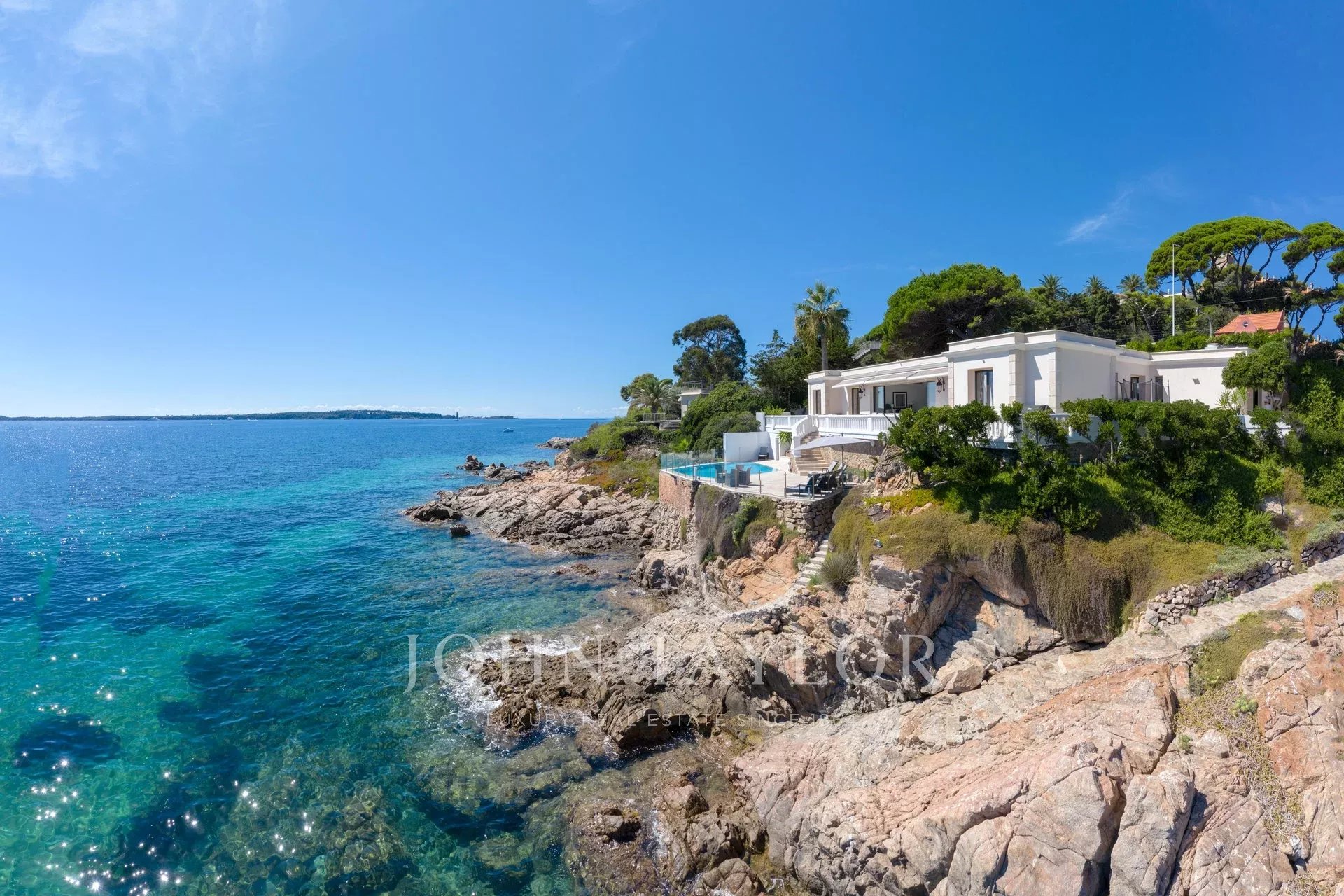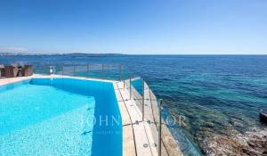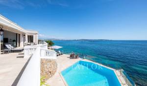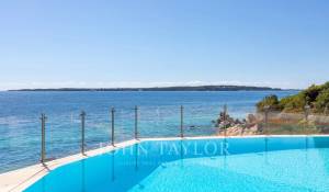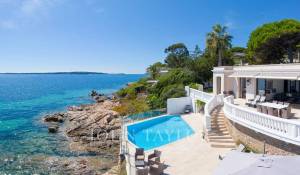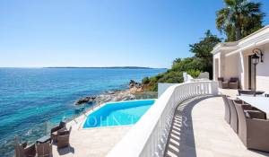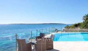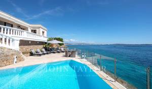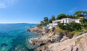 Splendida villa "waterfront" a un piano con oltre 300 m2 di superficie abitabile, completamente e recentemente ristrutturata e ridecorata, con accesso diretto e privato al mare. Vista panoramica sul mare delle Isole Lérins e di Cap d'Antibes.