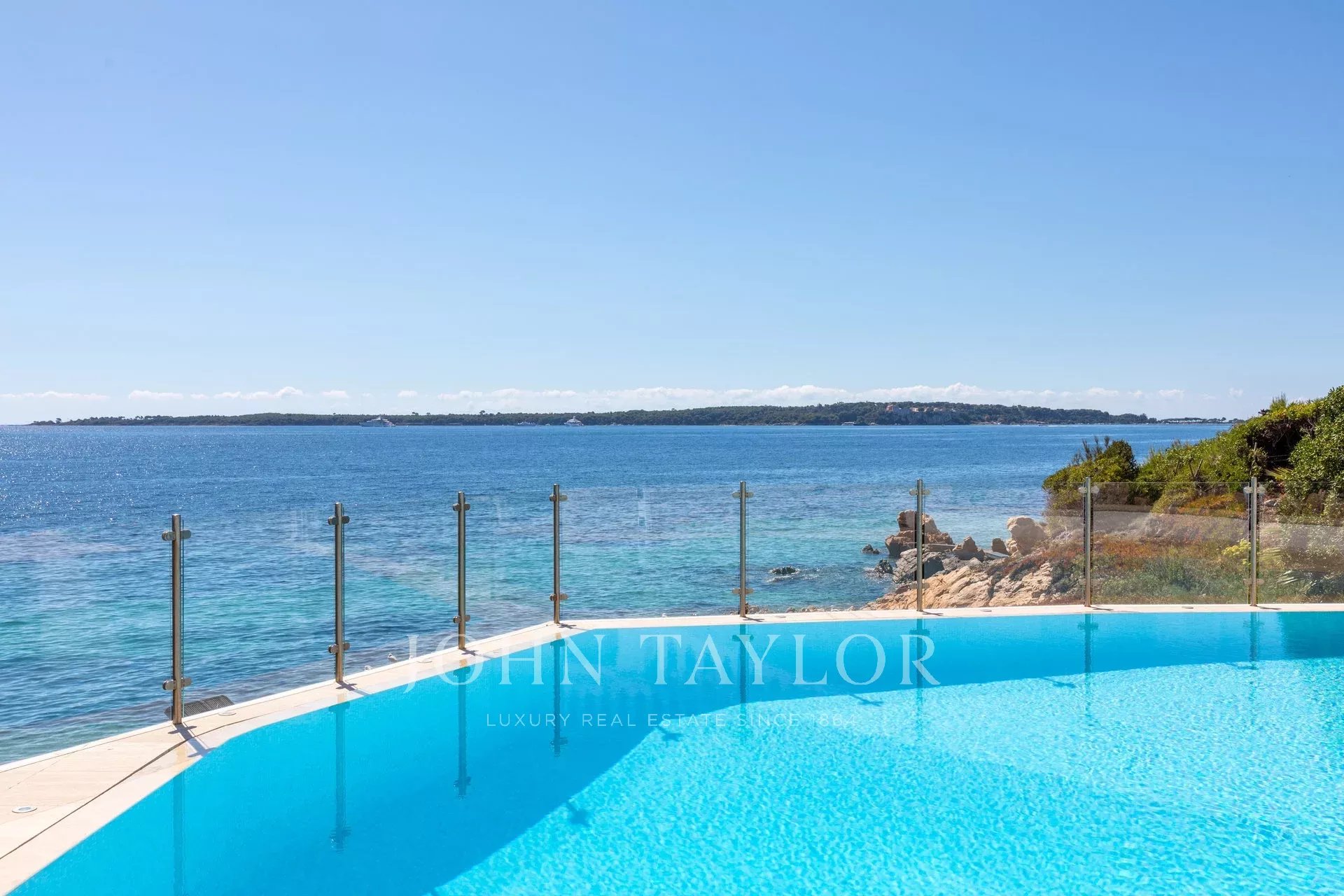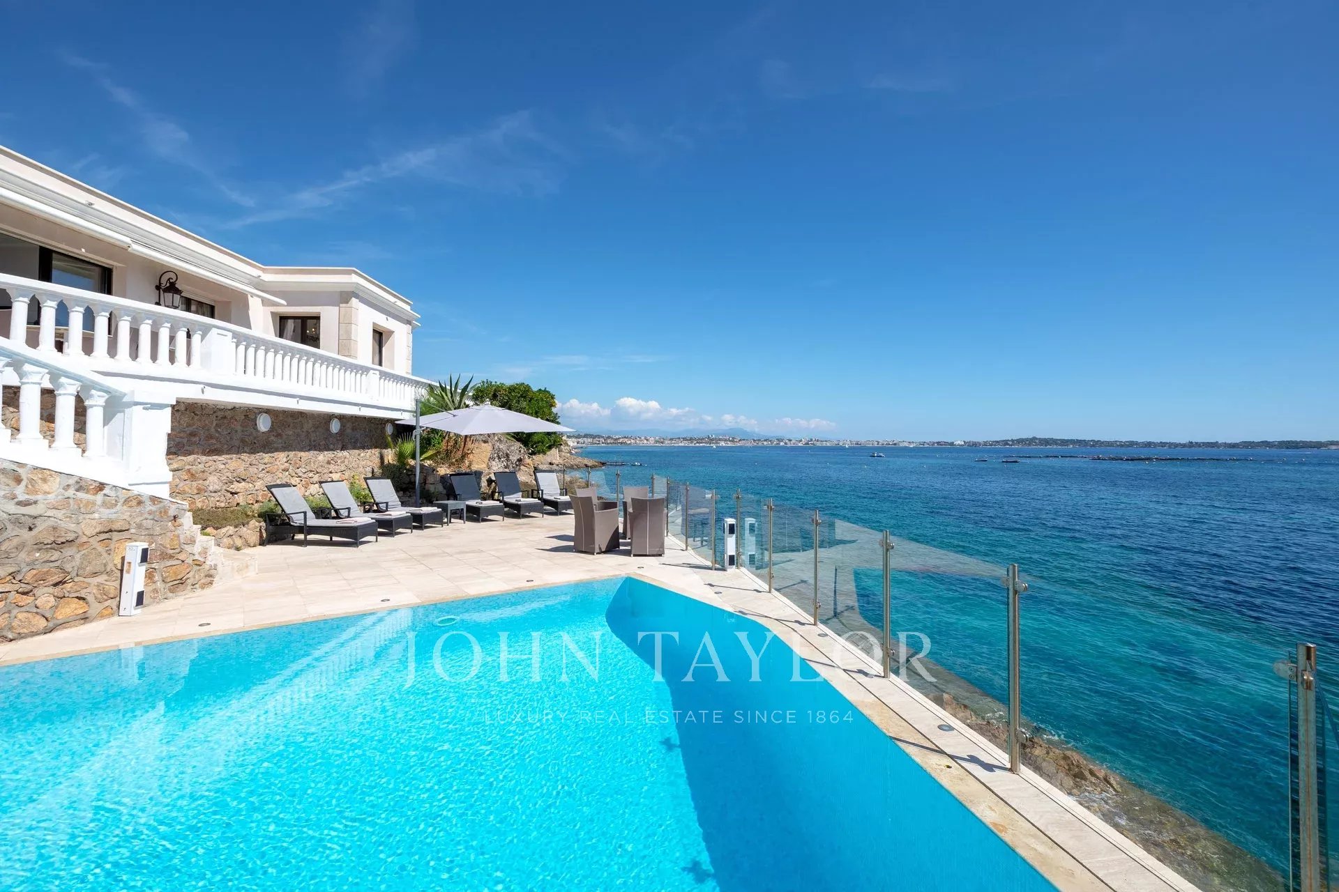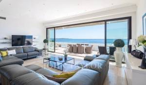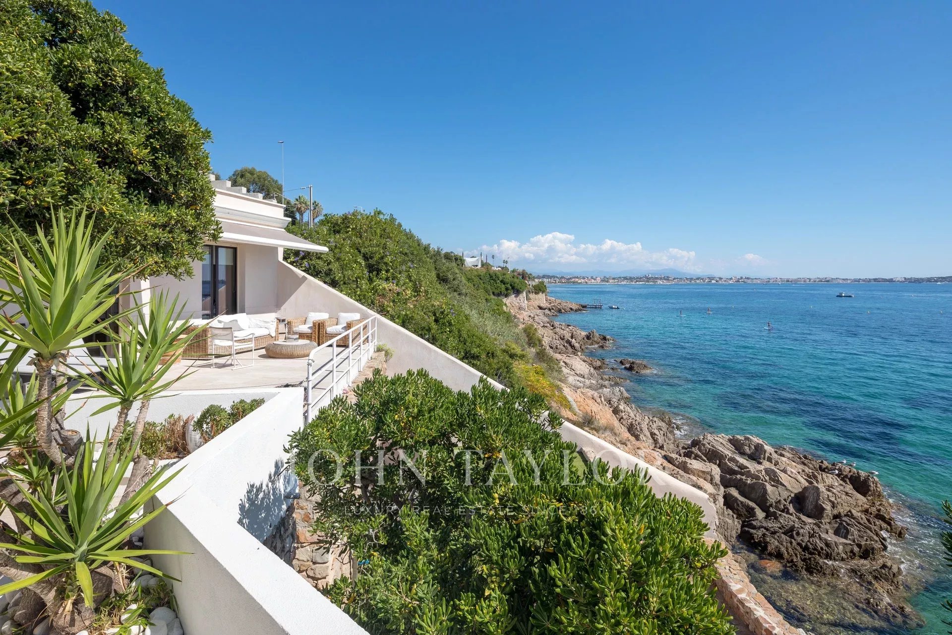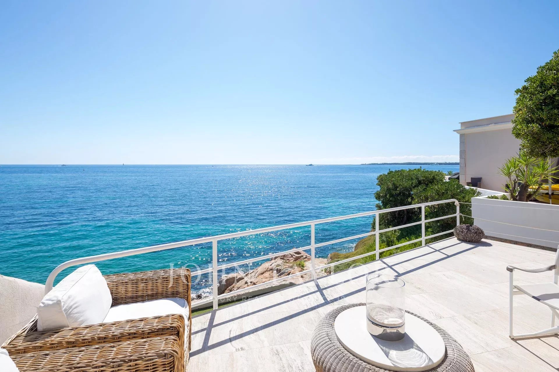 Splendida villa "waterfront" a un piano con oltre 300 m2 di superficie abitabile, completamente e recentemente ristrutturata e ridecorata, con accesso diretto e privato al mare. Vista panoramica sul mare delle Isole Lérins e di Cap d'Antibes.