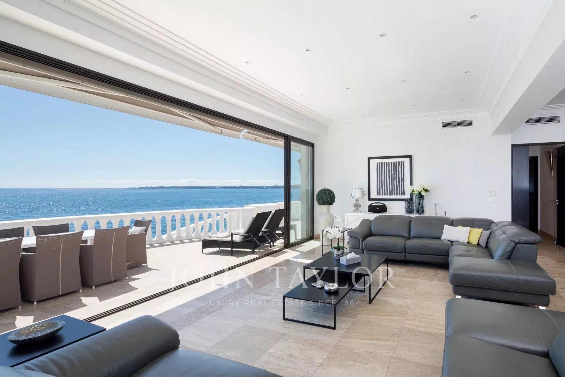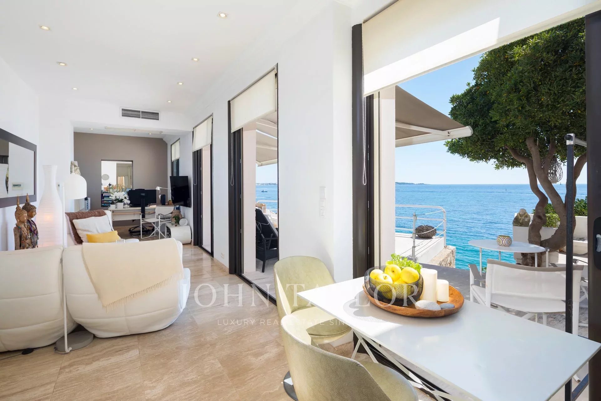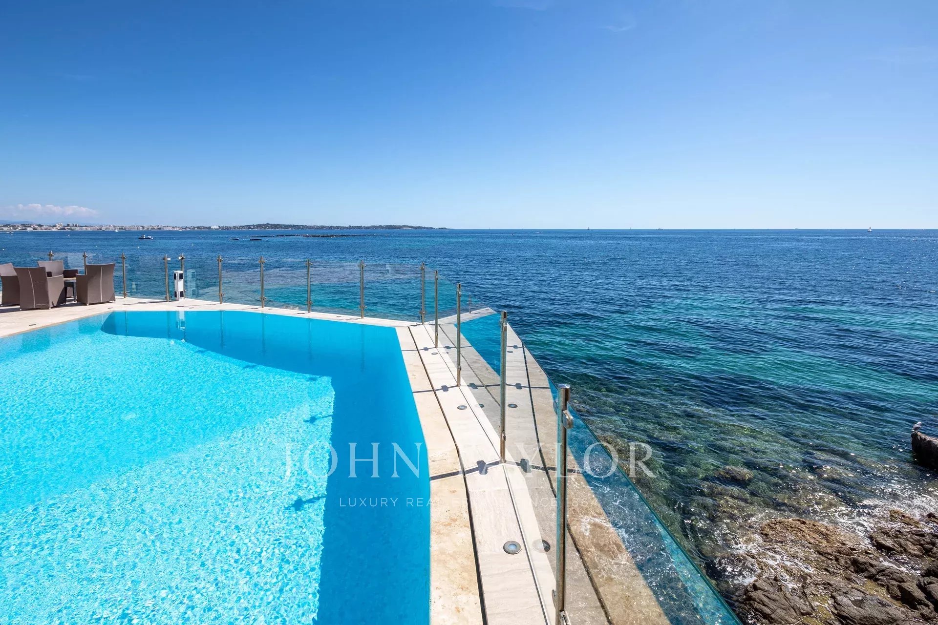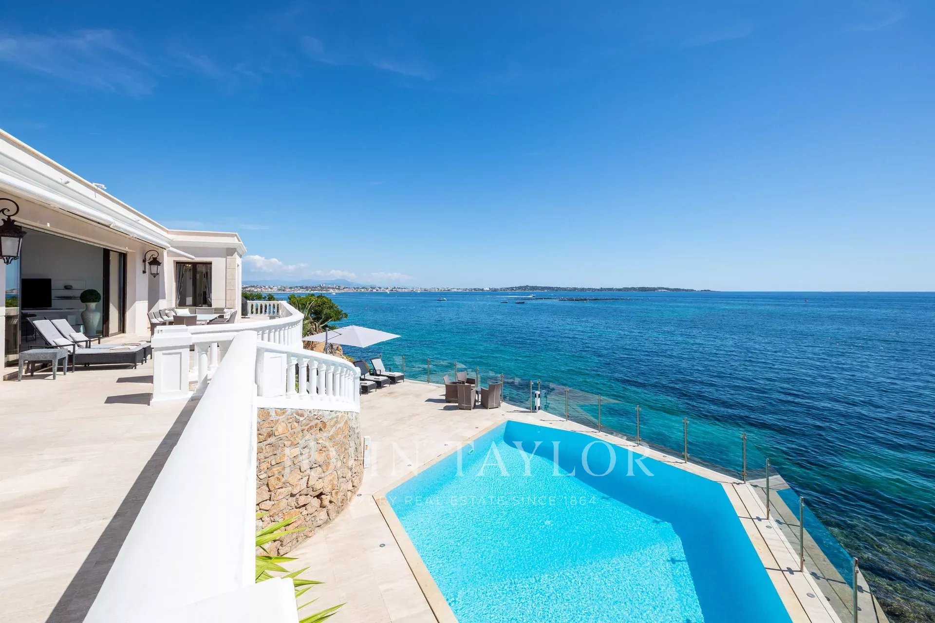Splendida villa "waterfront" a un piano con oltre 300 m2 di superficie abitabile, completamente e recentemente ristrutturata e ridecorata, con accesso diretto e privato al mare. Vista panoramica sul mare delle Isole Lérins e di Cap d'Antibes.