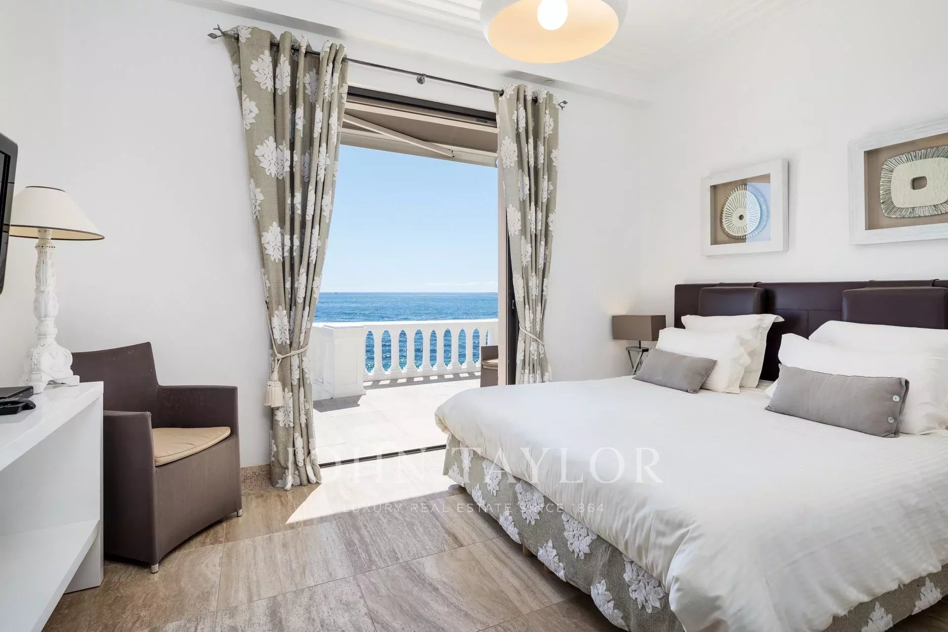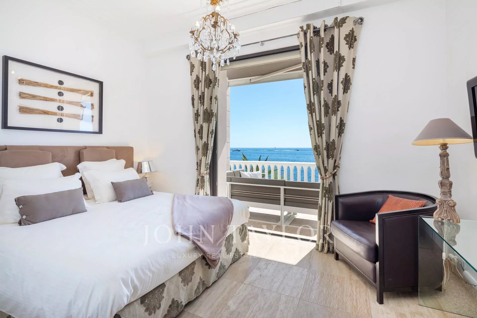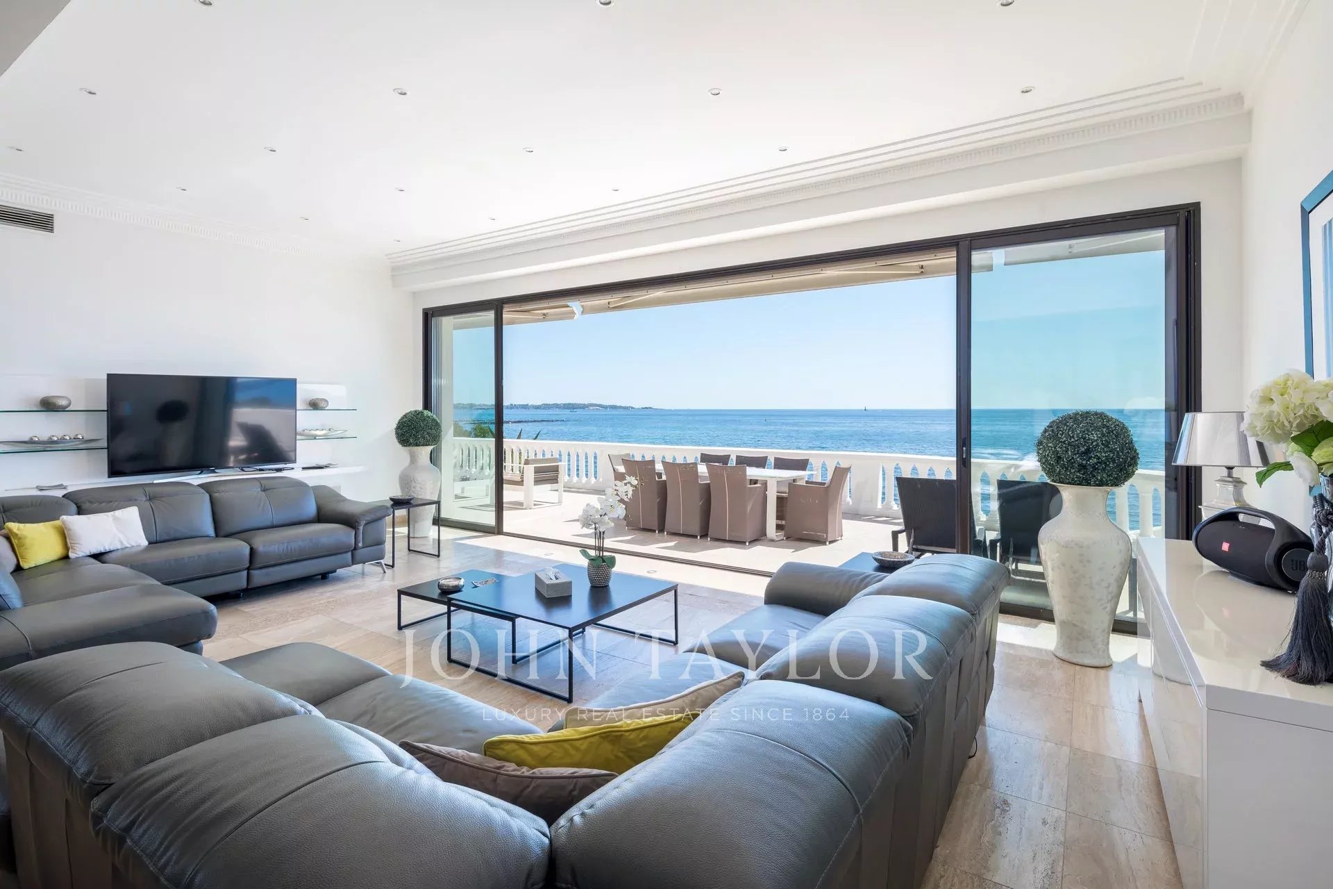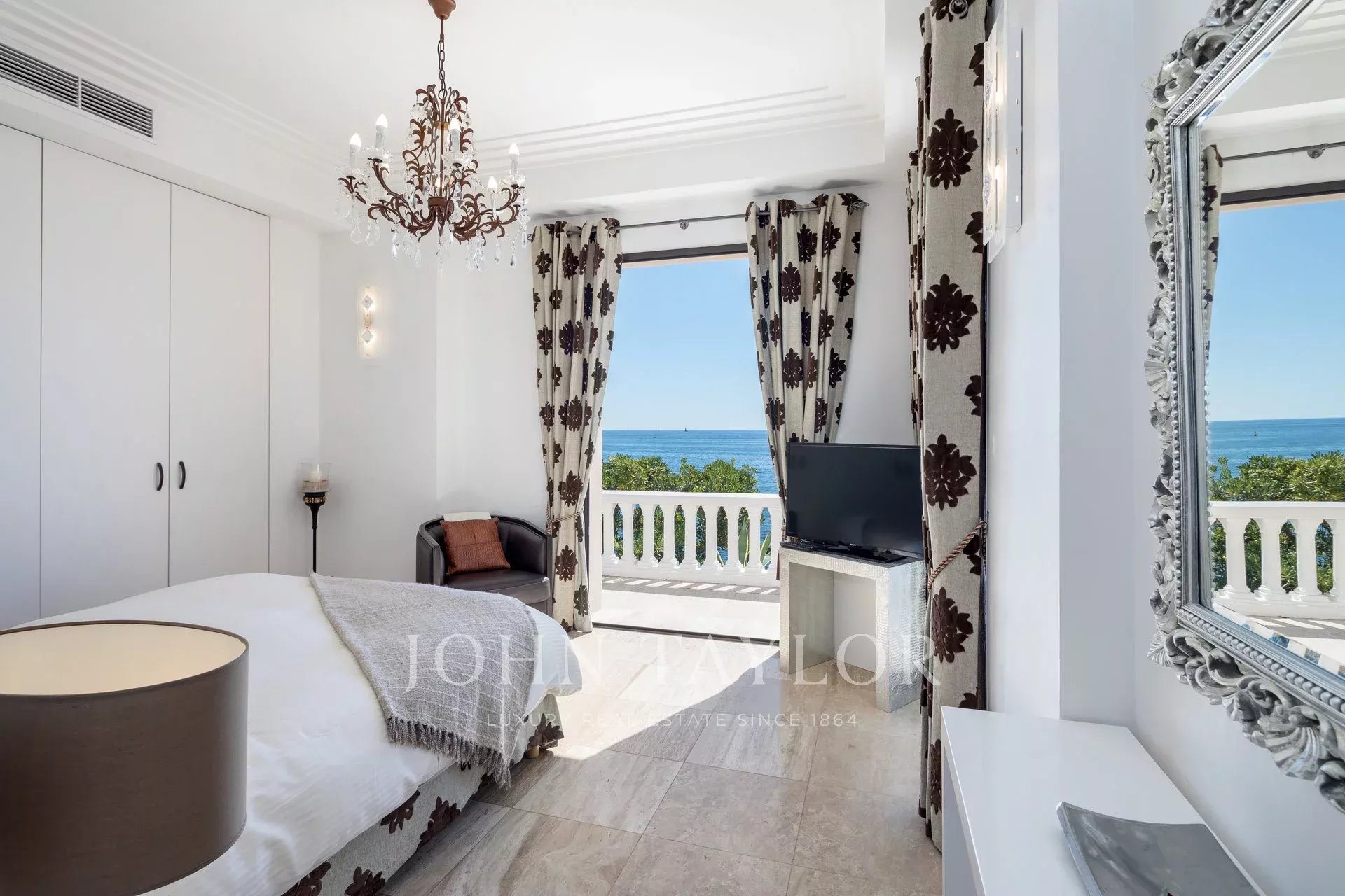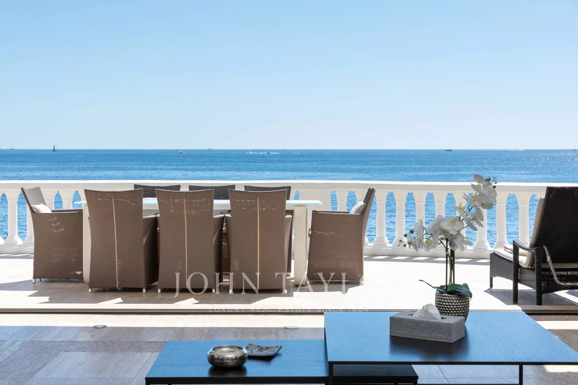 Splendida villa "waterfront" a un piano con oltre 300 m2 di superficie abitabile, completamente e recentemente ristrutturata e ridecorata, con accesso diretto e privato al mare. Vista panoramica sul mare delle Isole Lérins e di Cap d'Antibes.