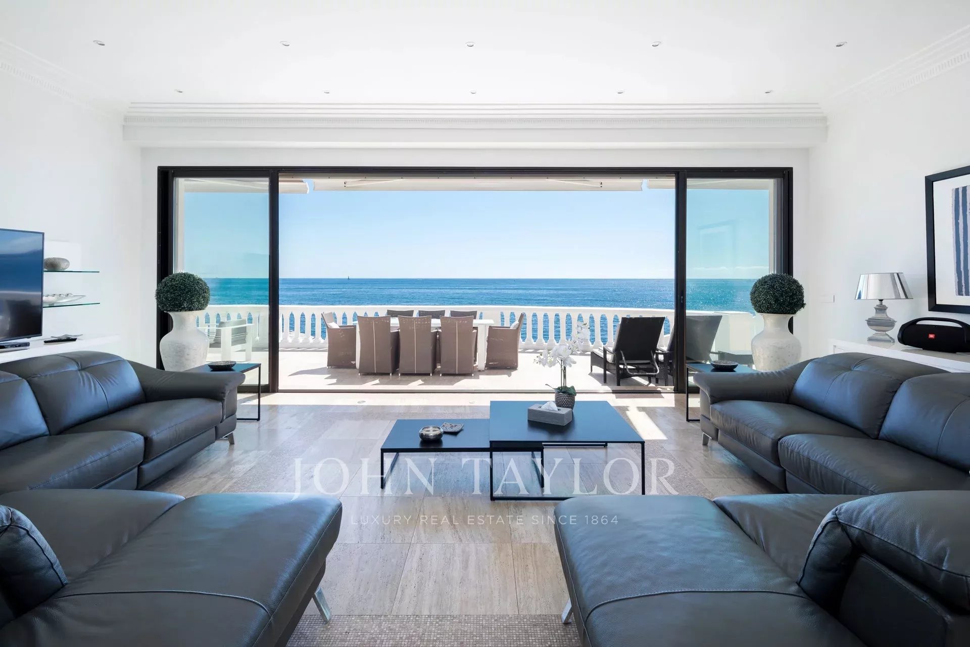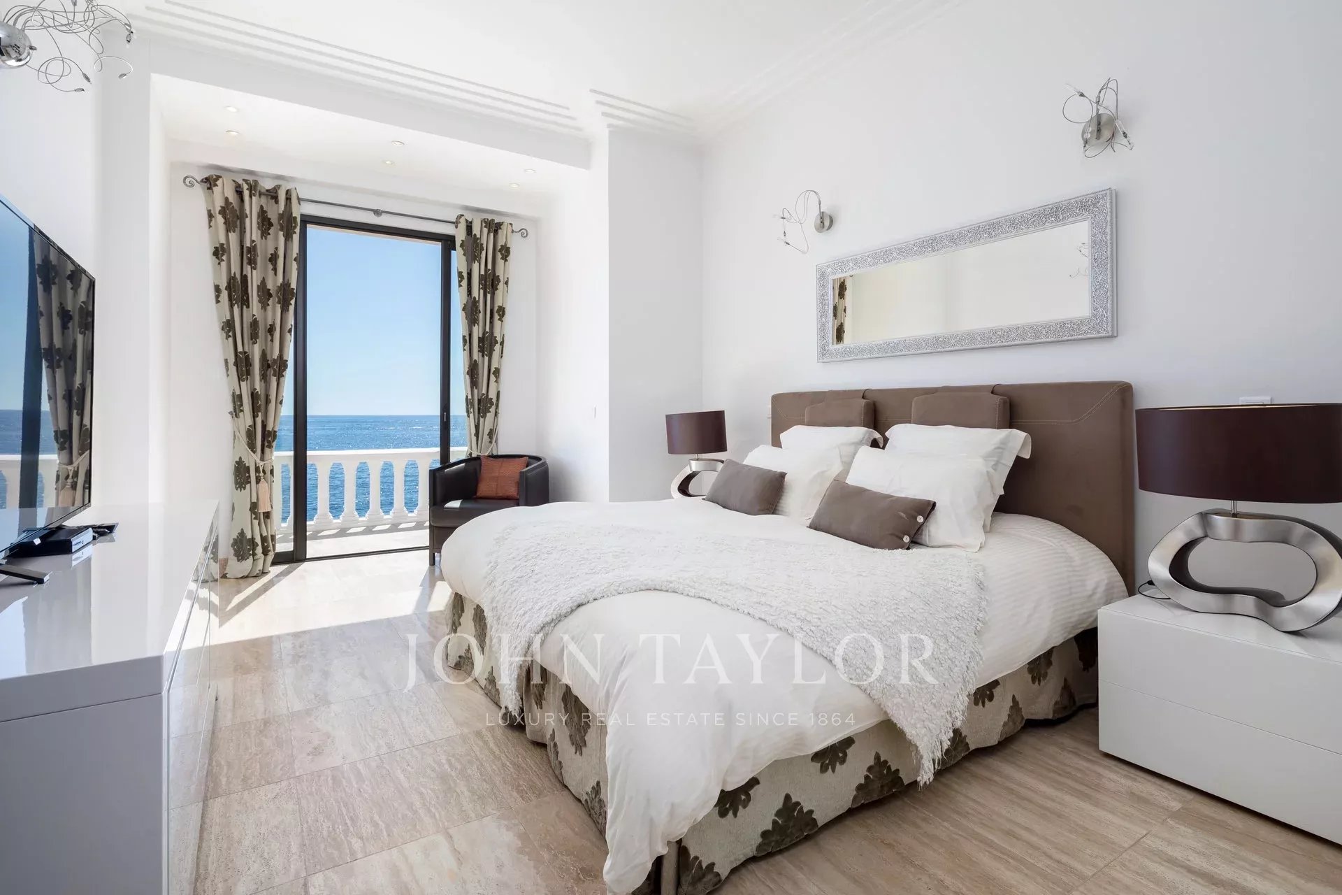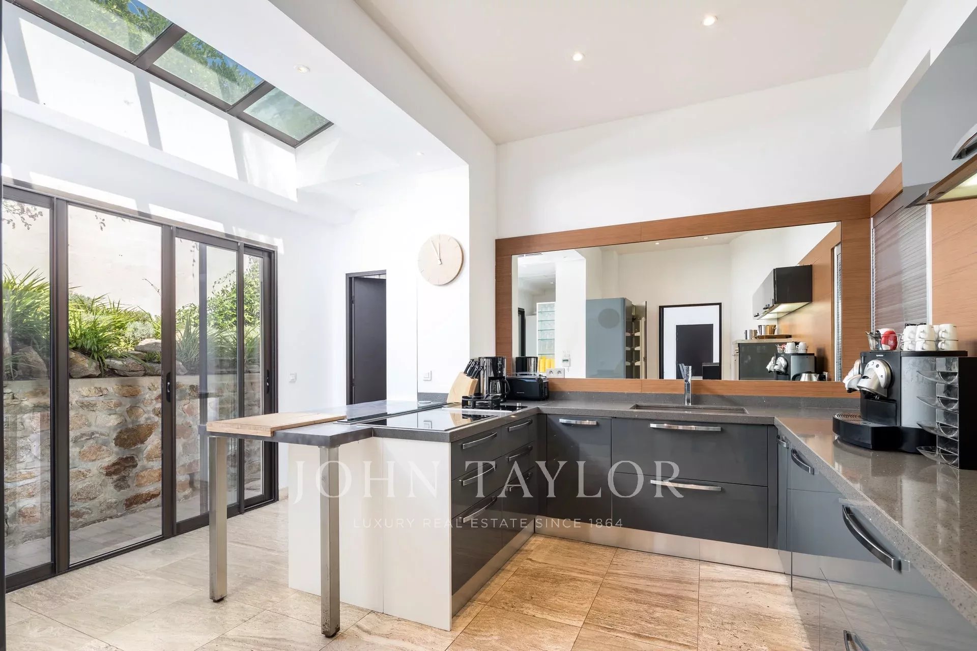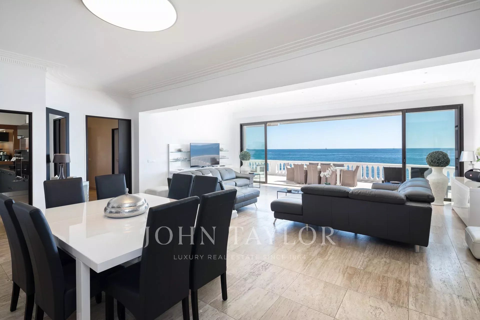 Splendida villa "waterfront" a un piano con oltre 300 m2 di superficie abitabile, completamente e recentemente ristrutturata e ridecorata, con accesso diretto e privato al mare. Vista panoramica sul mare delle Isole Lérins e di Cap d'Antibes.