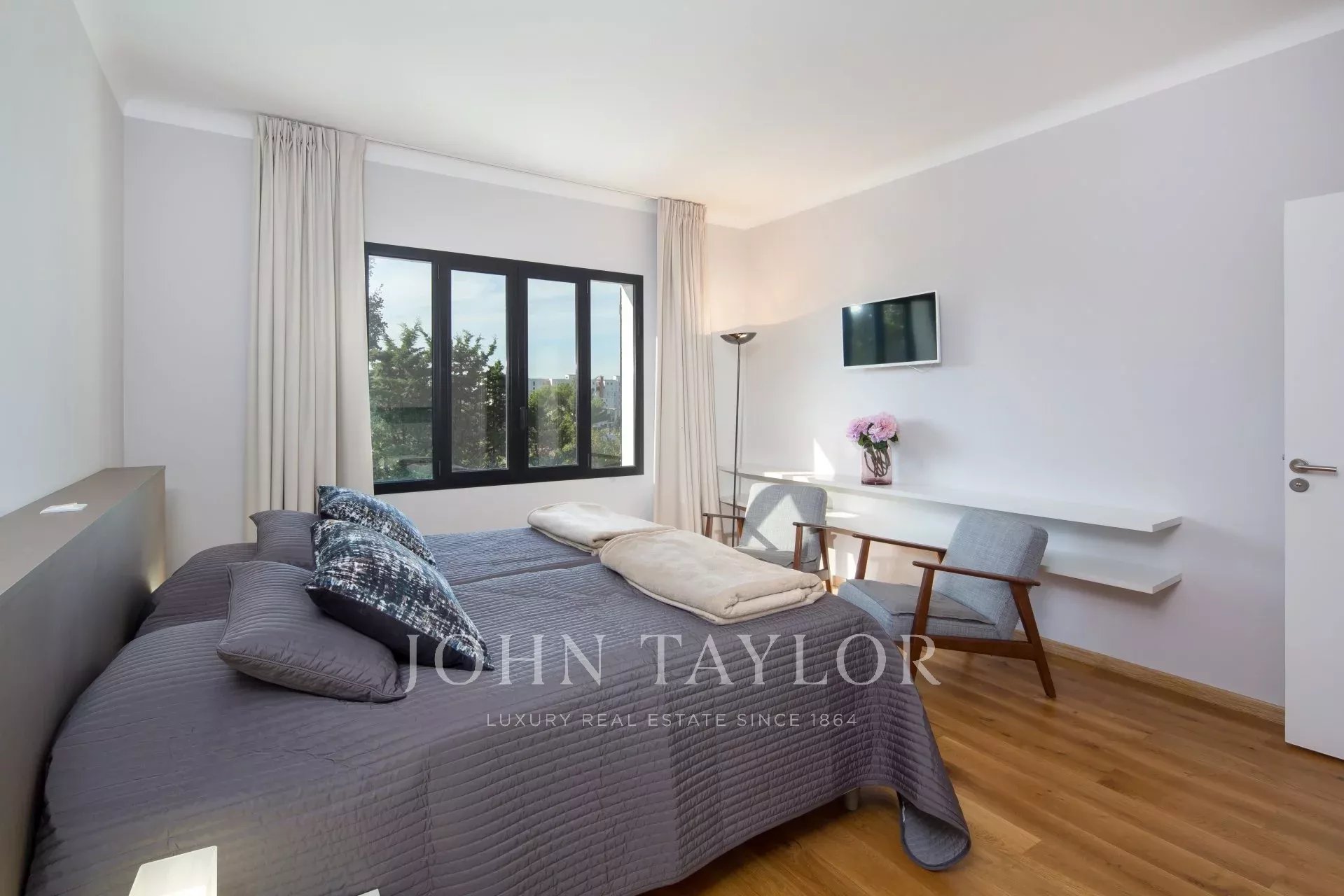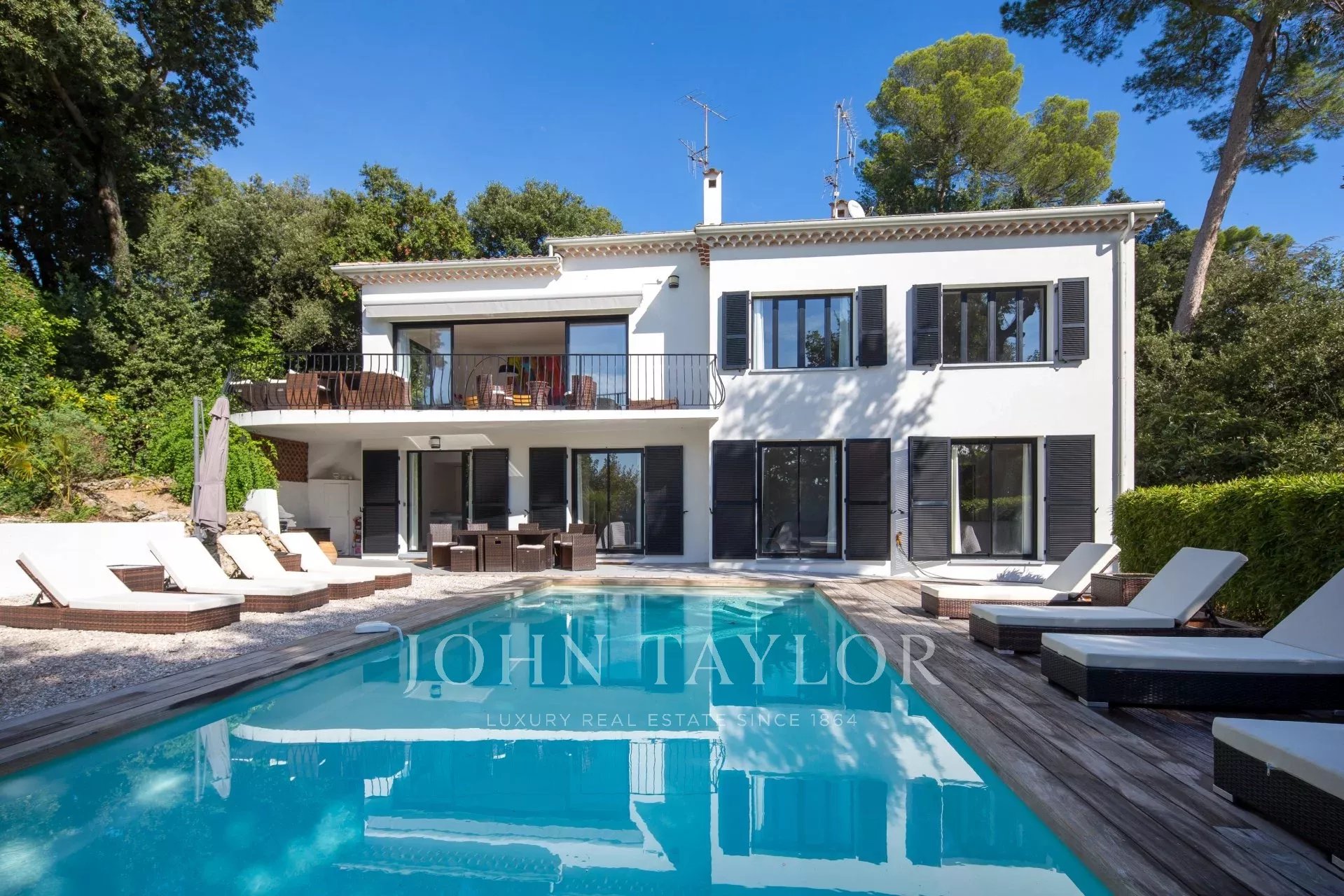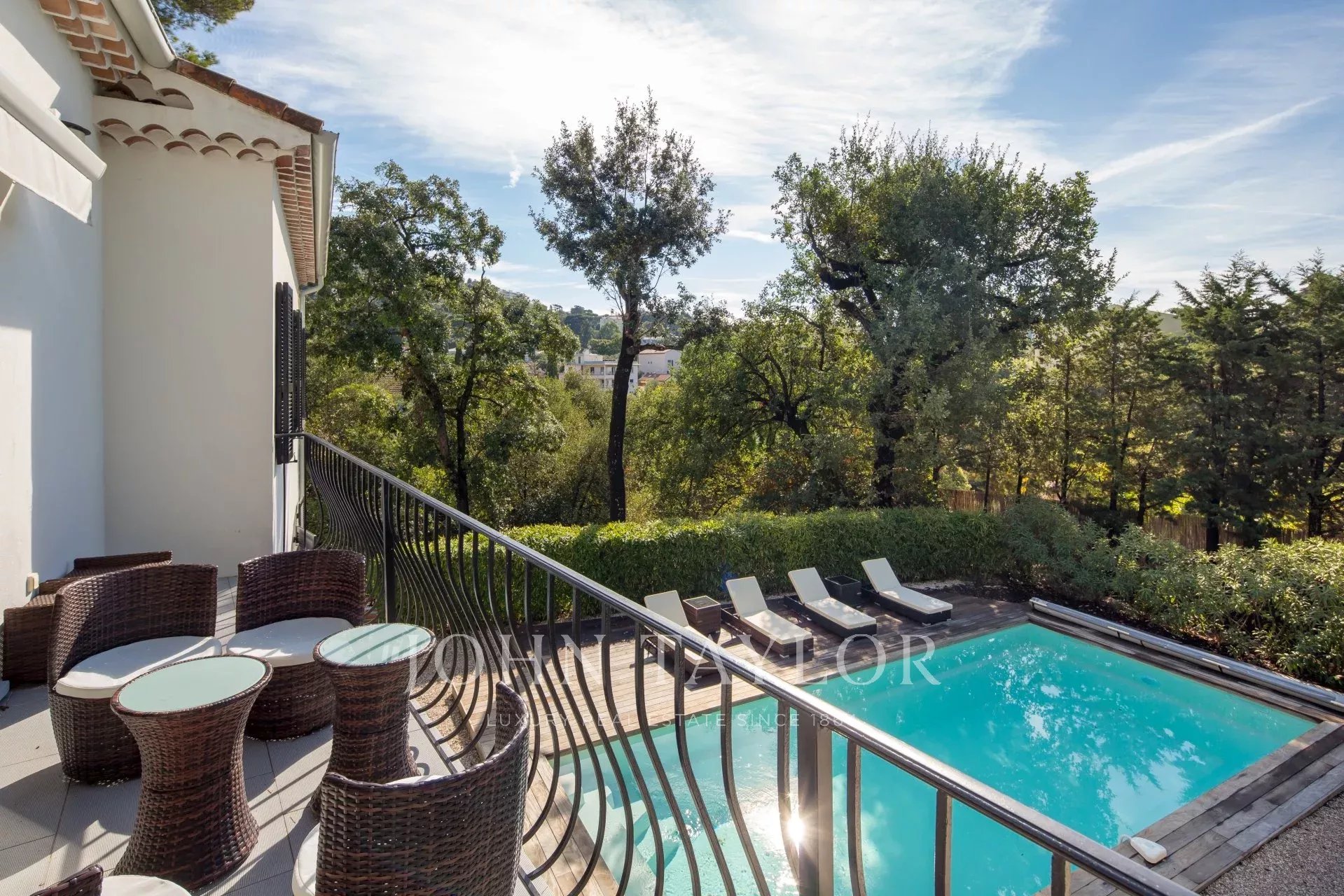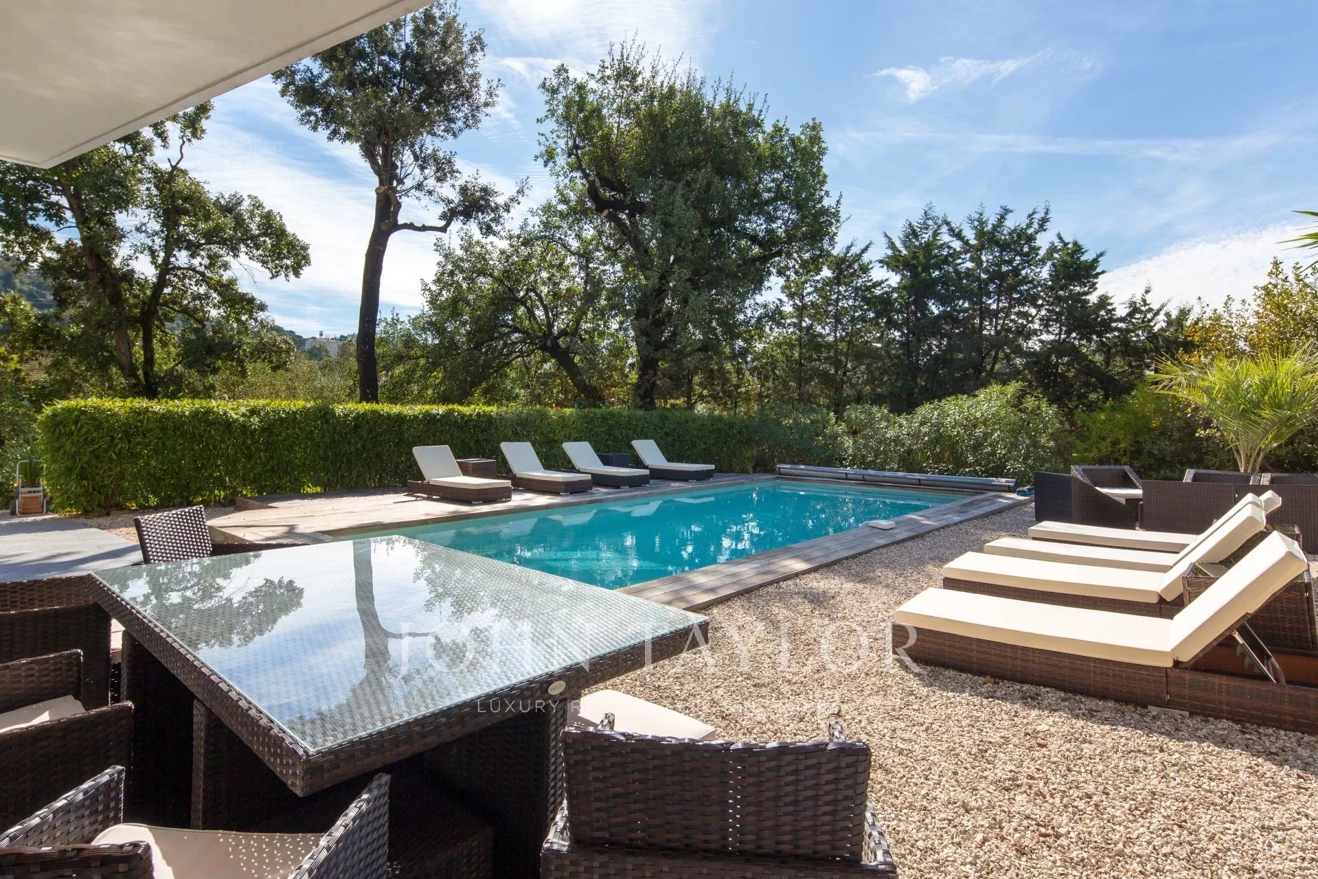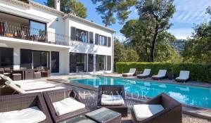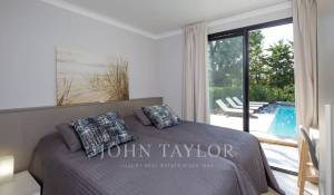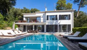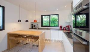 Vicino al centro di Cannes, in una proprietà privata, villa contemporanea climatizzata esposta a sud con 255 m2 di superficie abitabile immersa in 1.300 m2 di giardino.