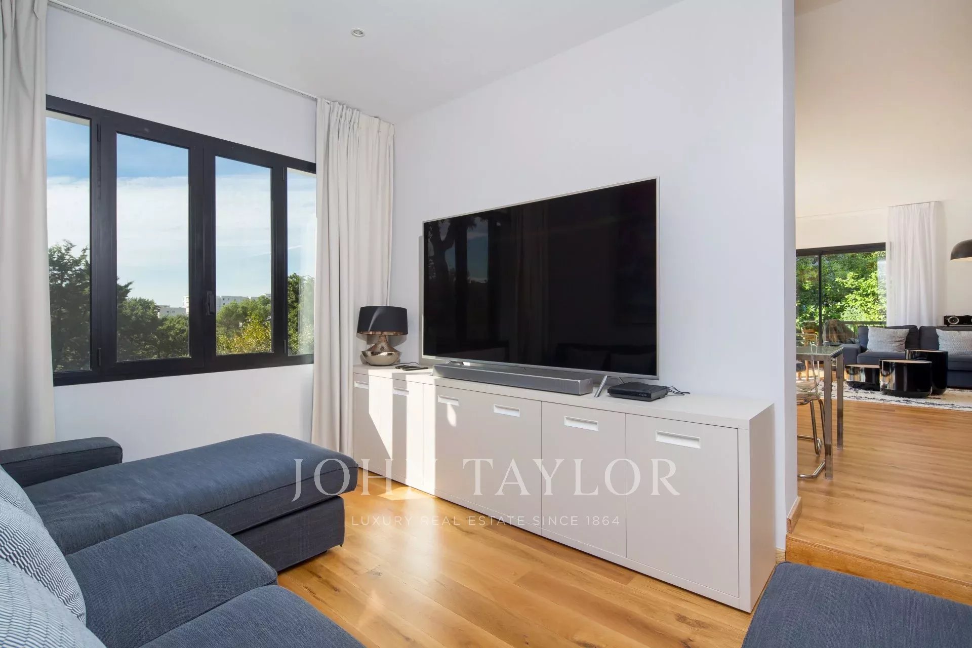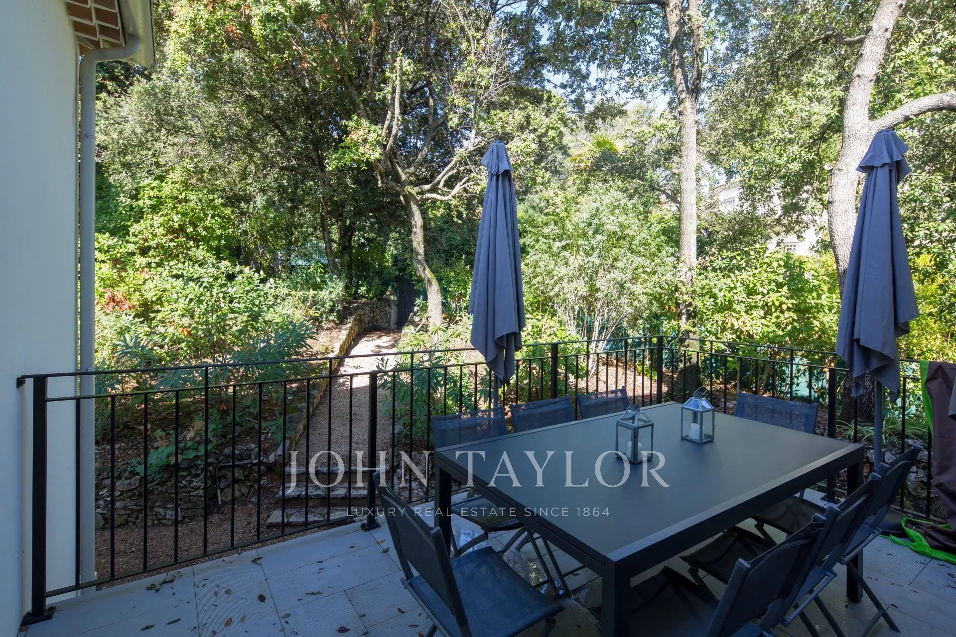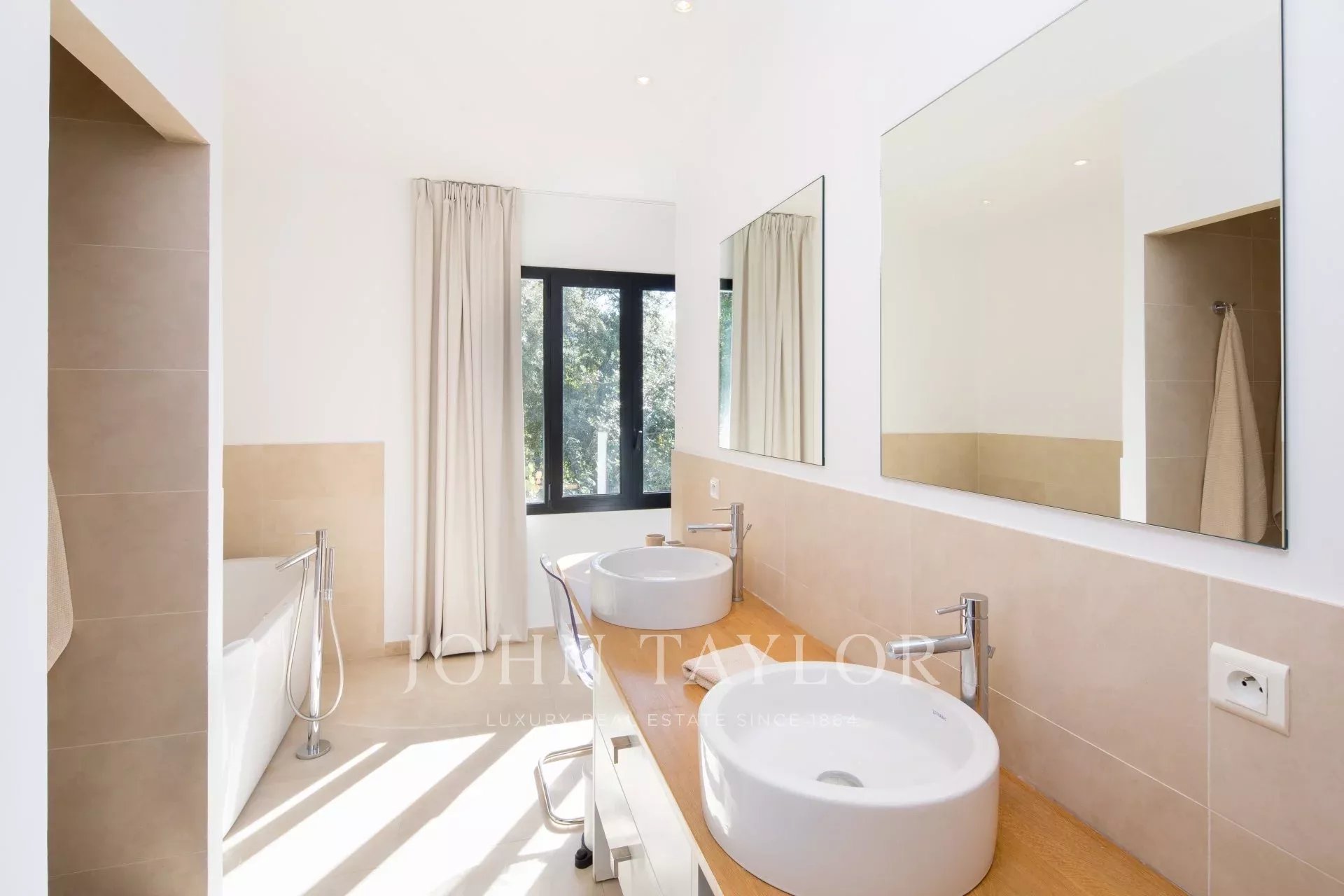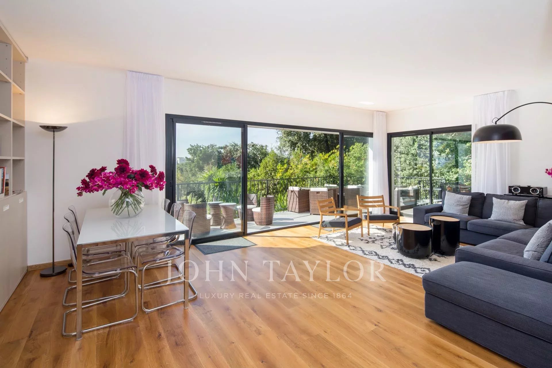 Vicino al centro di Cannes, in una proprietà privata, villa contemporanea climatizzata esposta a sud con 255 m2 di superficie abitabile immersa in 1.300 m2 di giardino.
