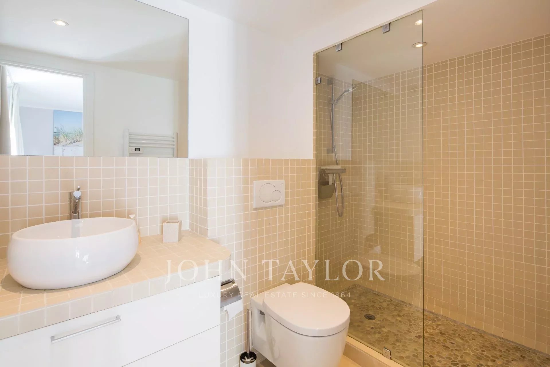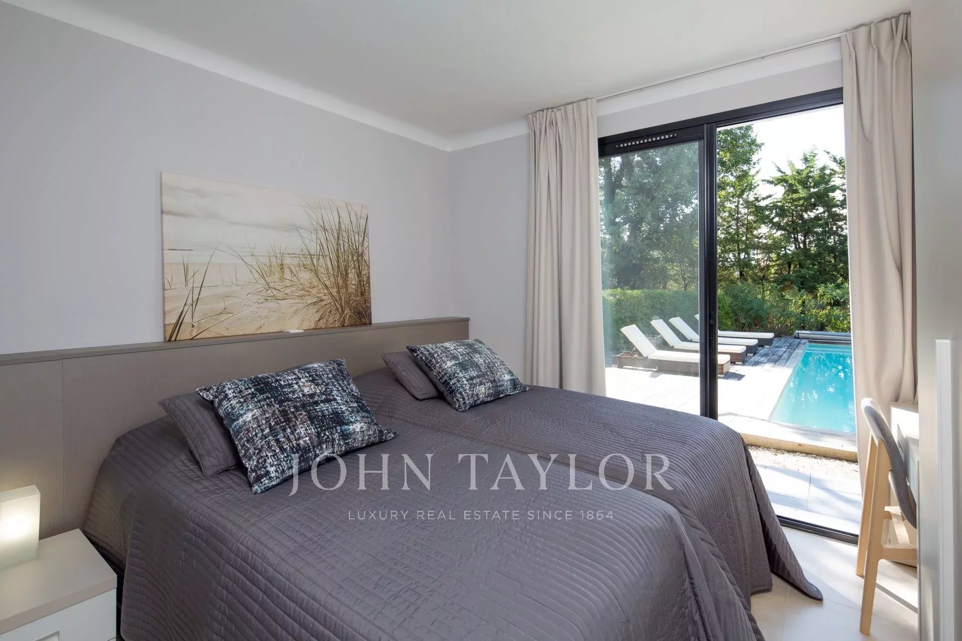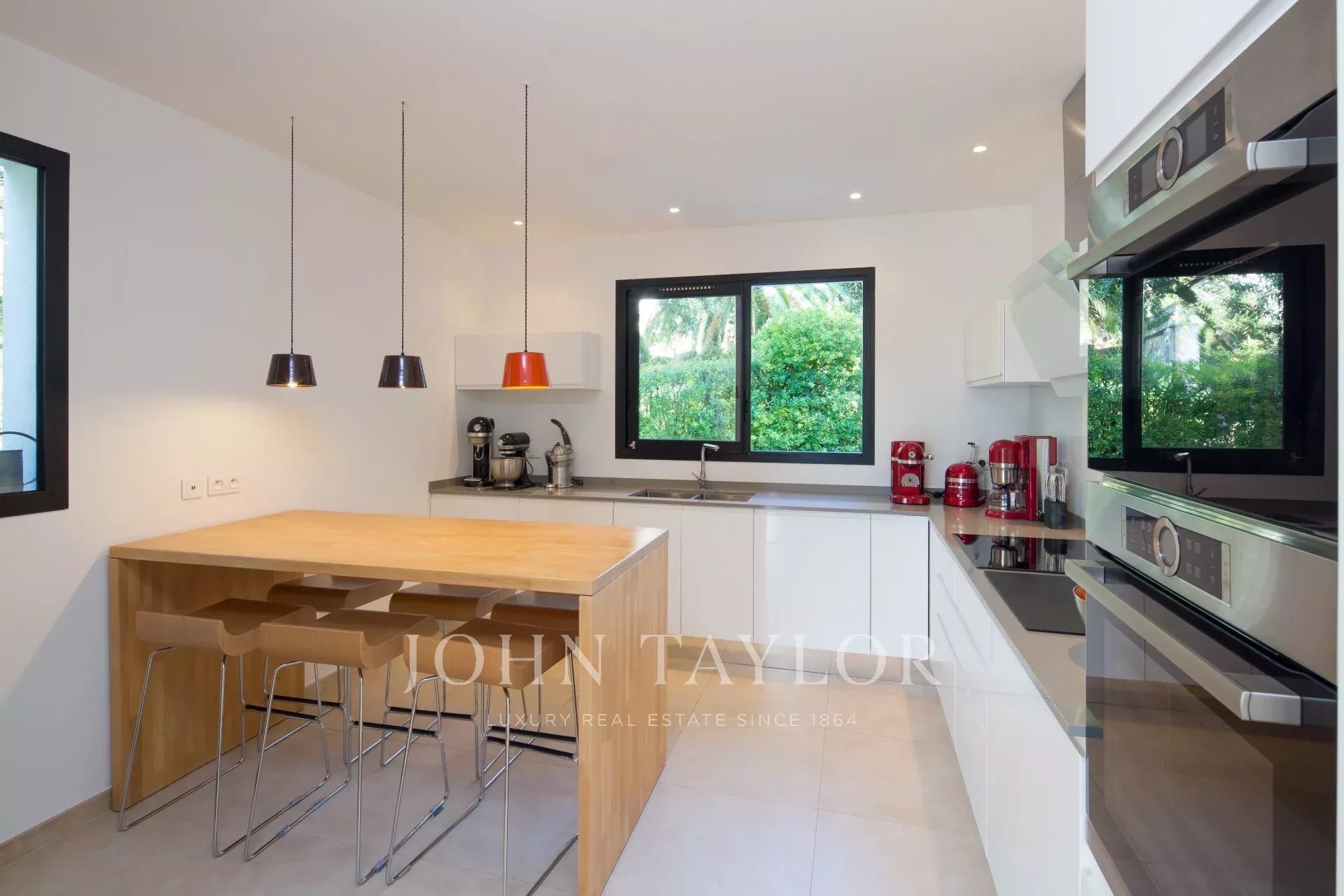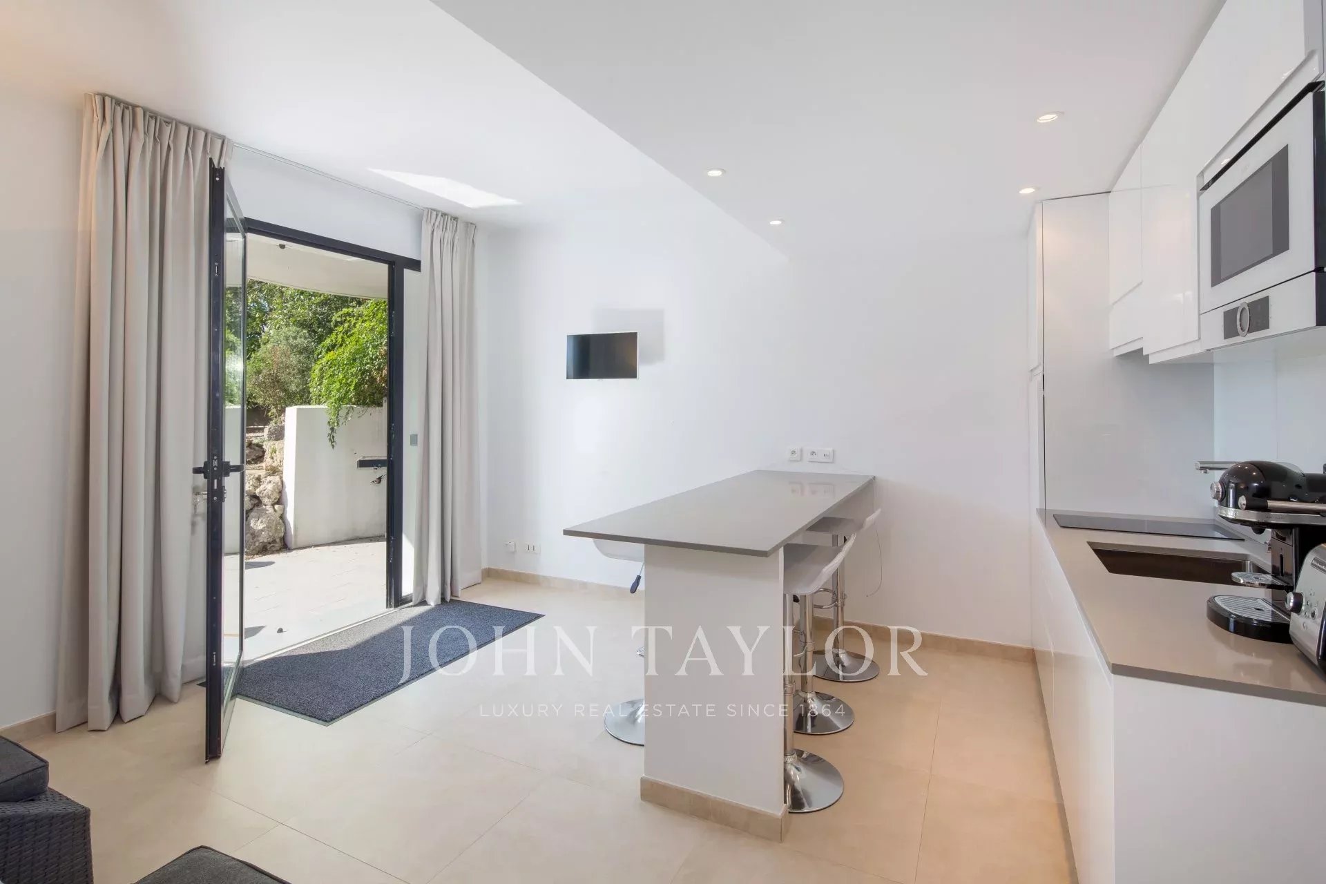 Vicino al centro di Cannes, in una proprietà privata, villa contemporanea climatizzata esposta a sud con 255 m2 di superficie abitabile immersa in 1.300 m2 di giardino.