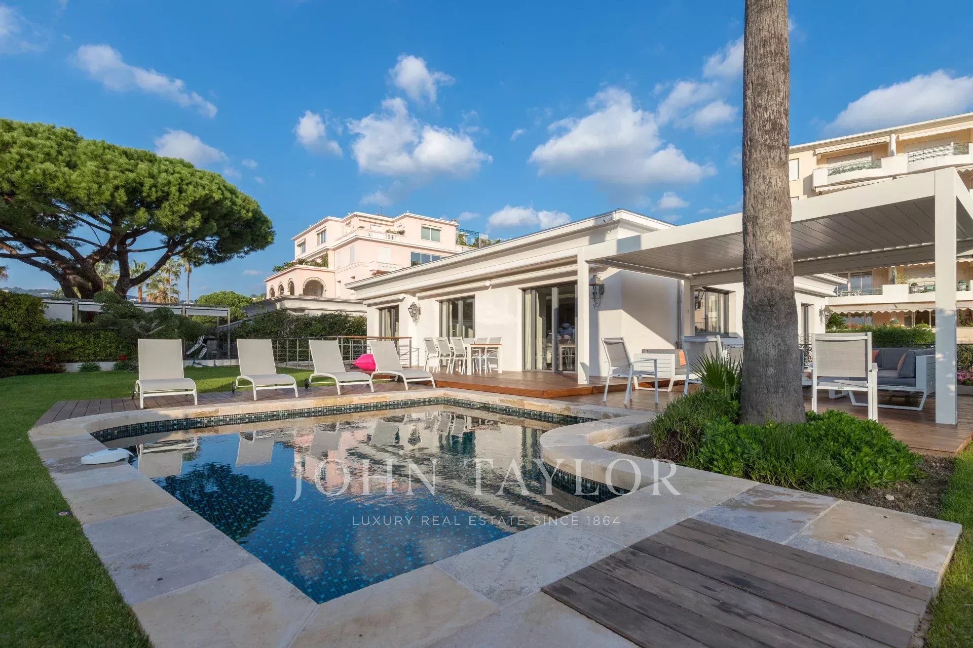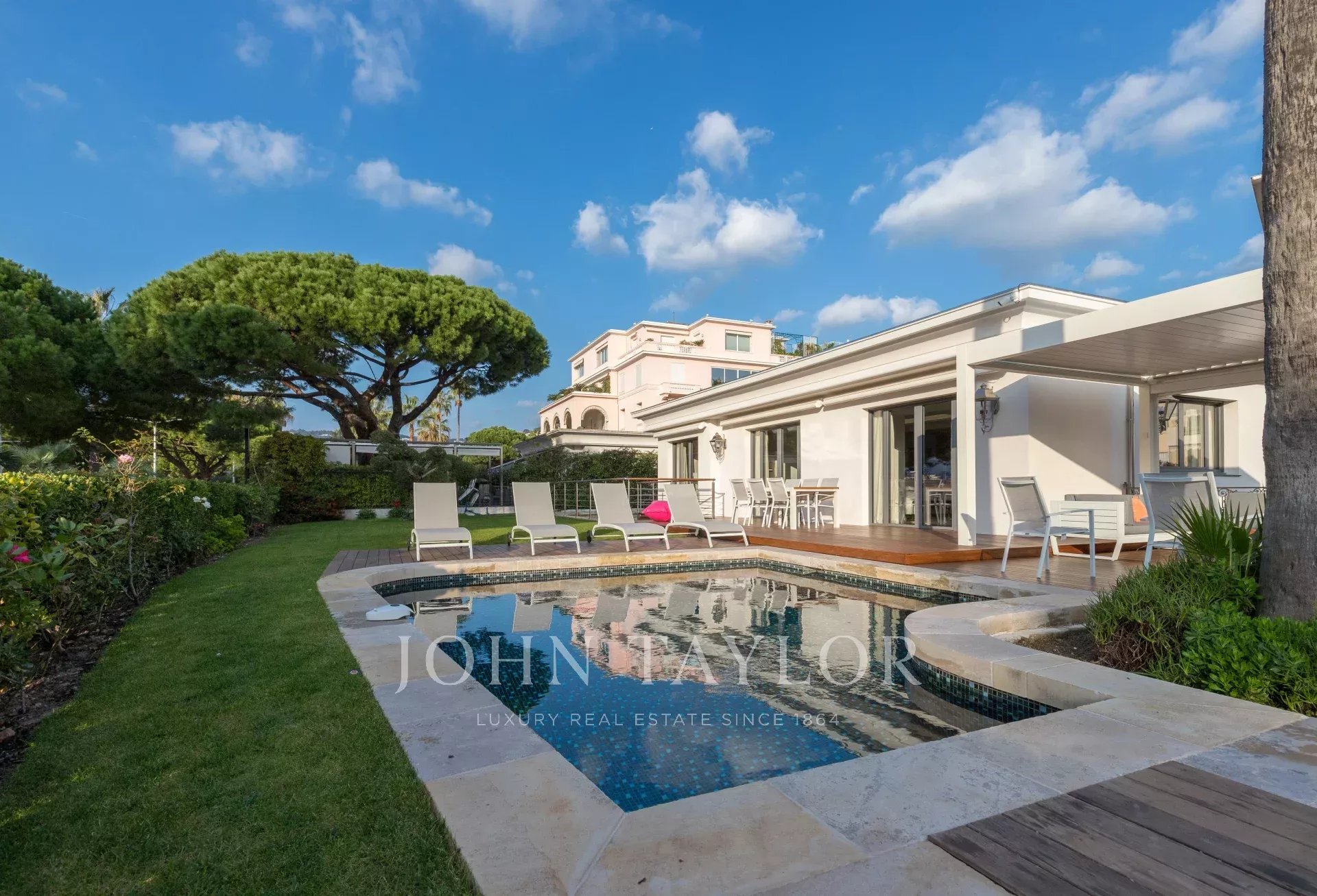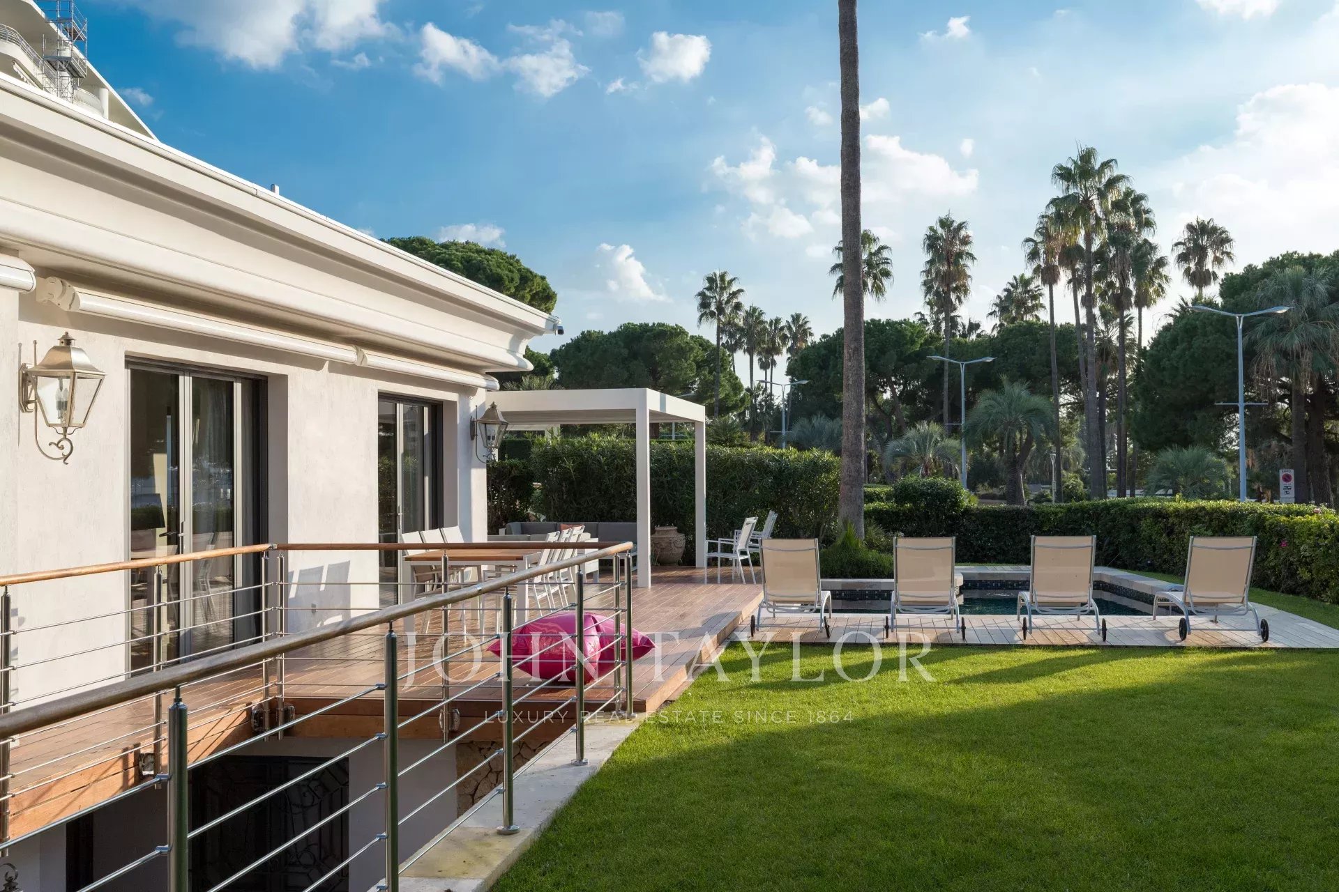 In una proprietà privata sulla Croisette, bella villa climatizzata con 340 m2 di superficie abitabile su 2 livelli, completamente e recentemente ristrutturata, immersa in 650 m2 di giardino pianeggiante (con terrazze).