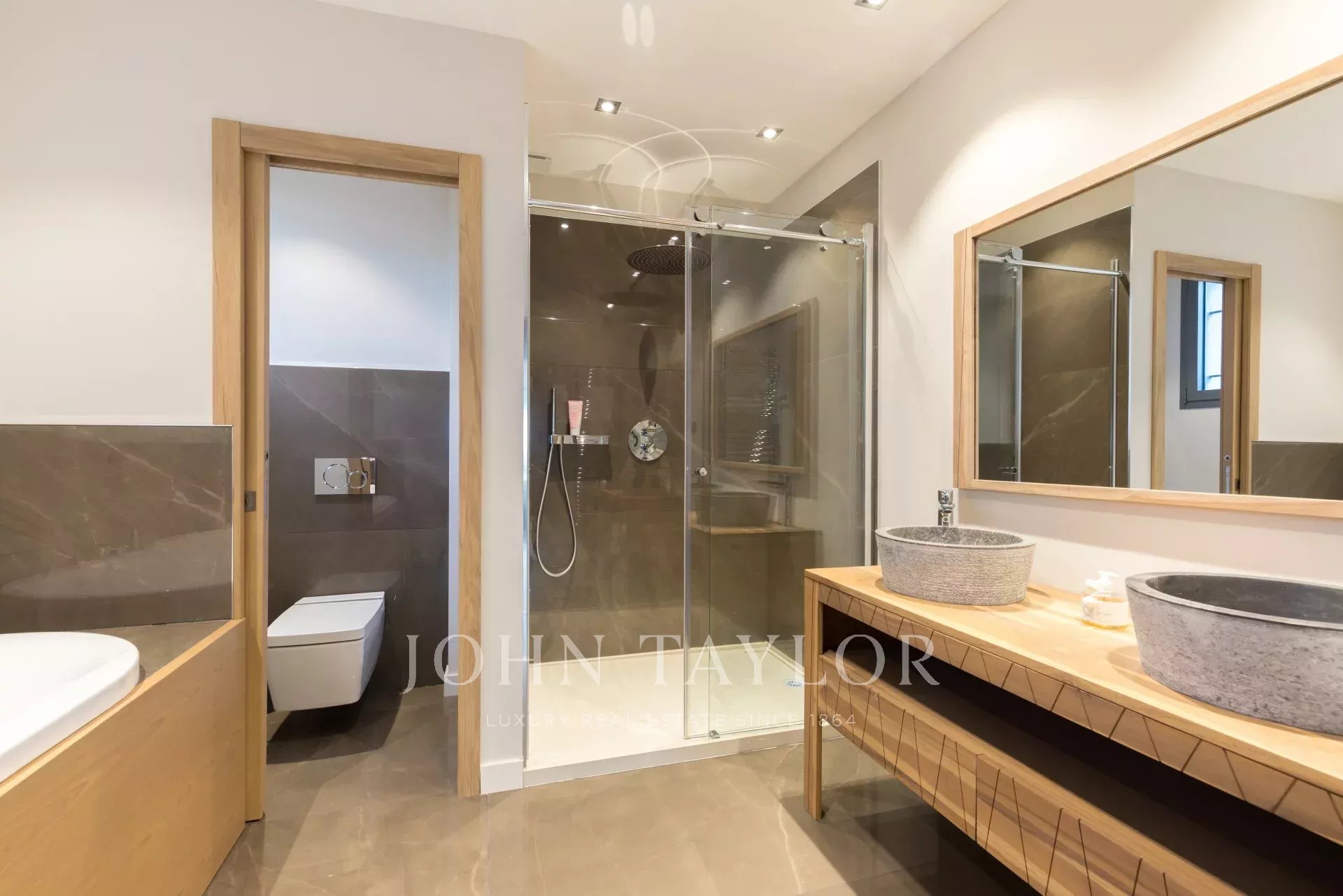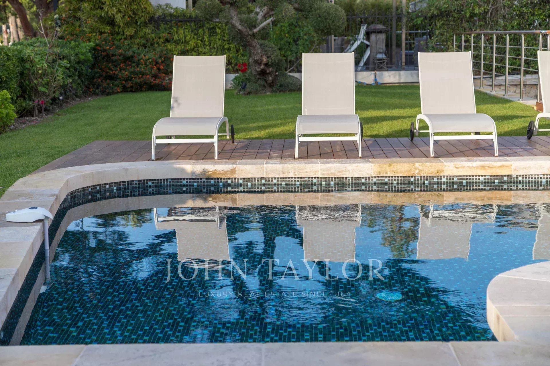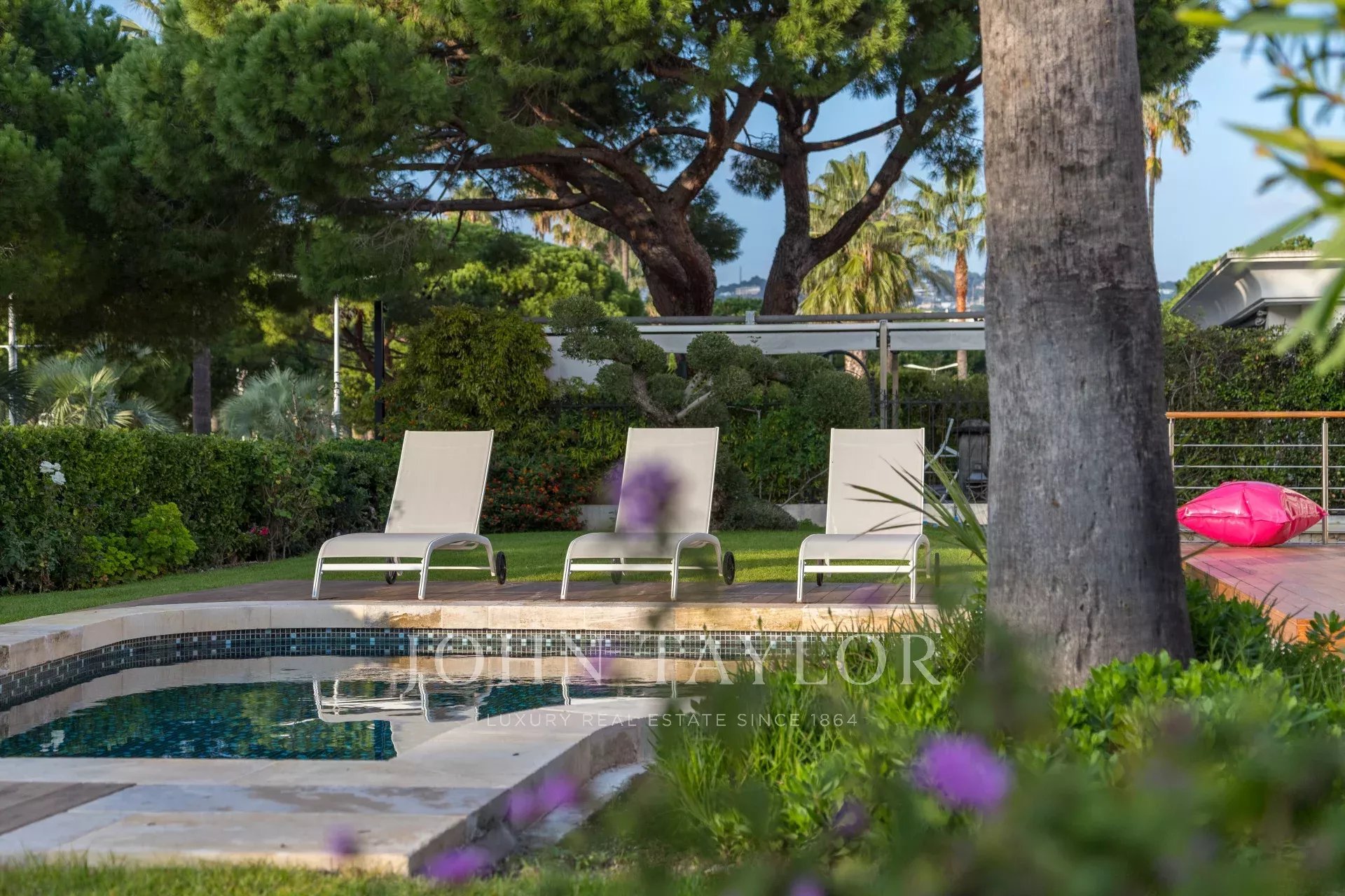 In una proprietà privata sulla Croisette, bella villa climatizzata con 340 m2 di superficie abitabile su 2 livelli, completamente e recentemente ristrutturata, immersa in 650 m2 di giardino pianeggiante (con terrazze).
