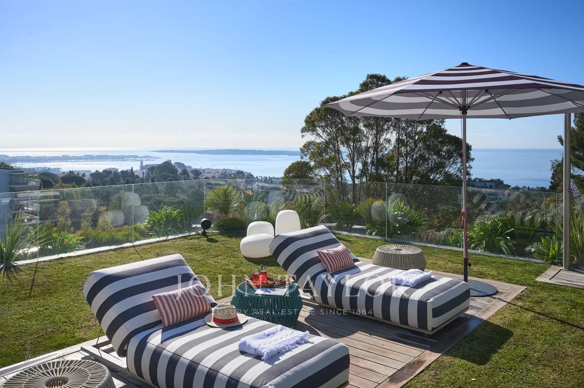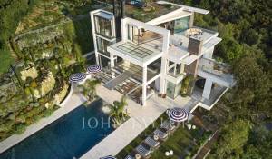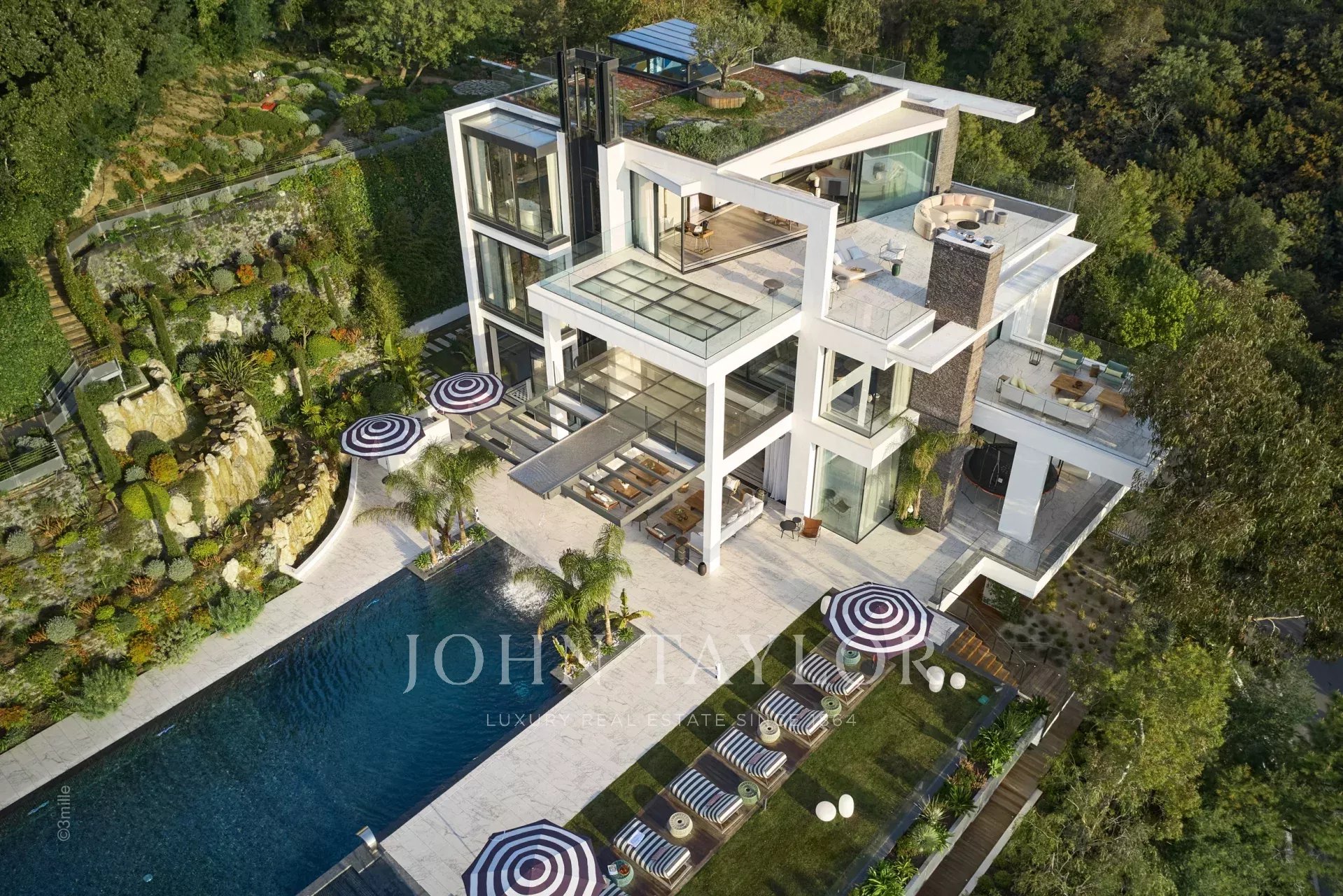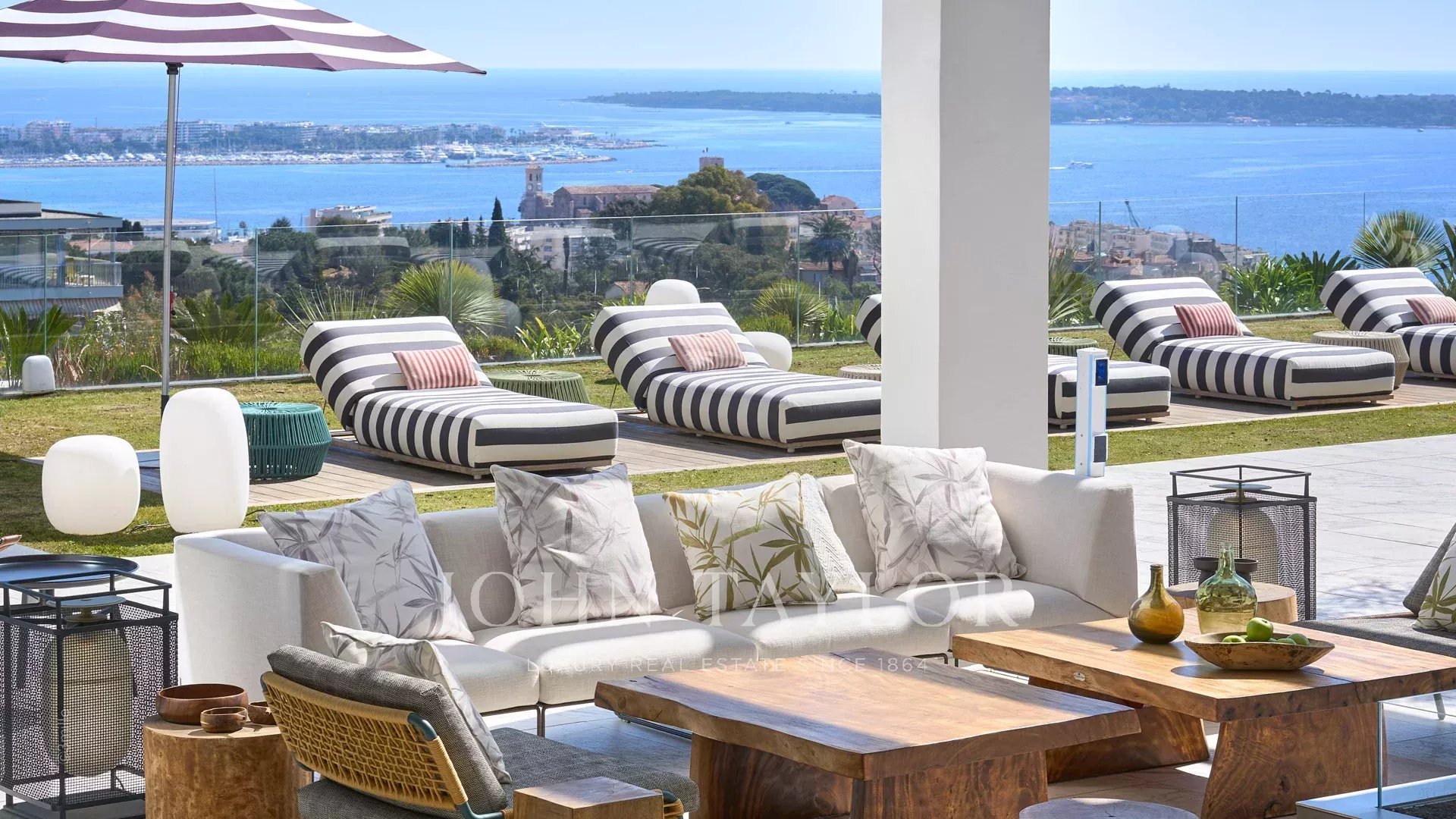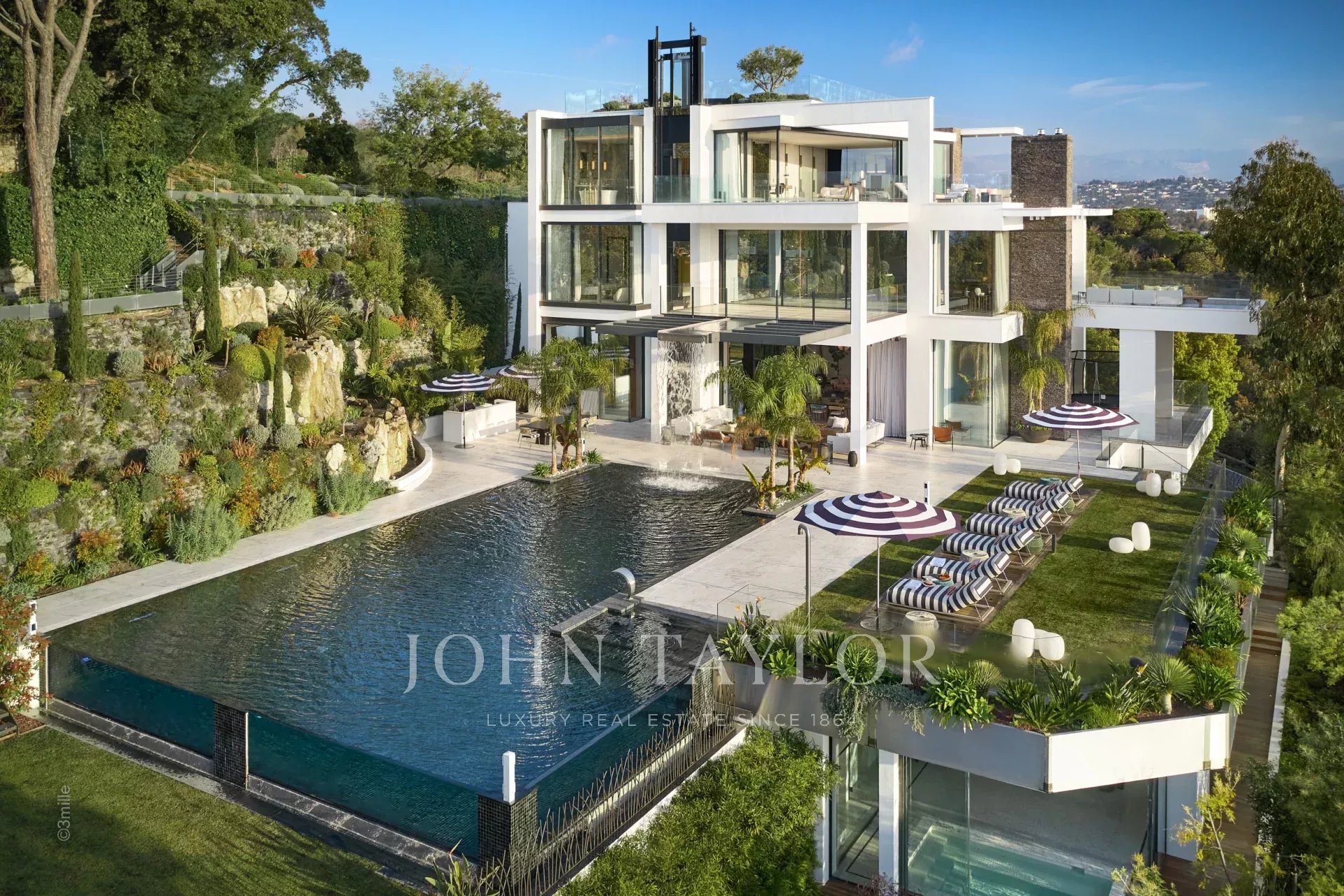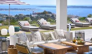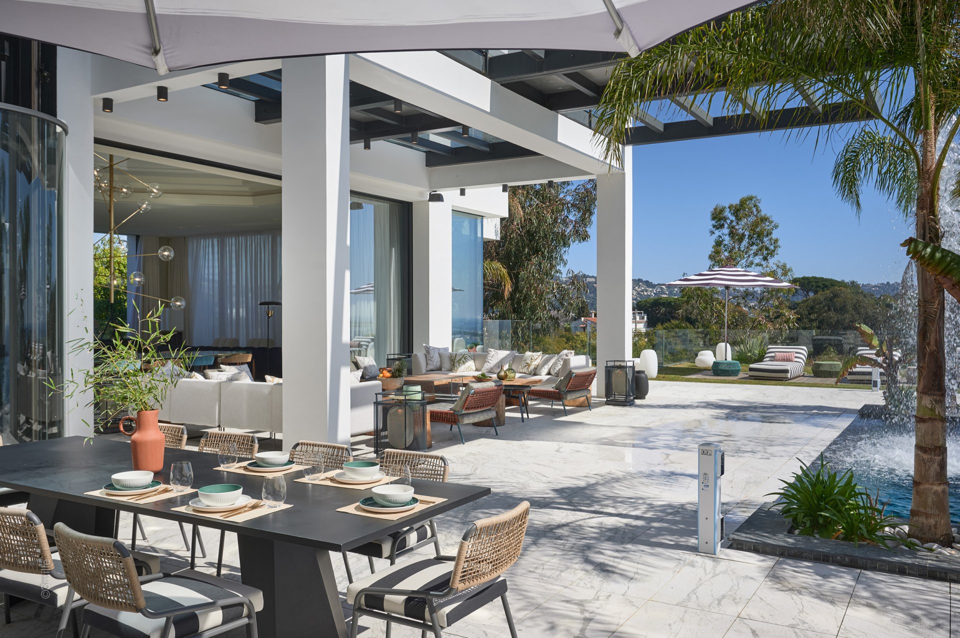 Gli spazi esterni sono altrettanto sontuosi, con una terrazza al piano terra che presenta un ponte a bordo piscina con vista panoramica sul mare, un braciere, un barbecue e una zona pranzo, con vista sulla piscina riscaldata e due cascate. I piani superiori offrono terrazze panoramiche attrezzate con sedie a sdraio e un braciere, mentre il giardino mediterraneo terrazzato comprende un campo da pétanque e un orto.