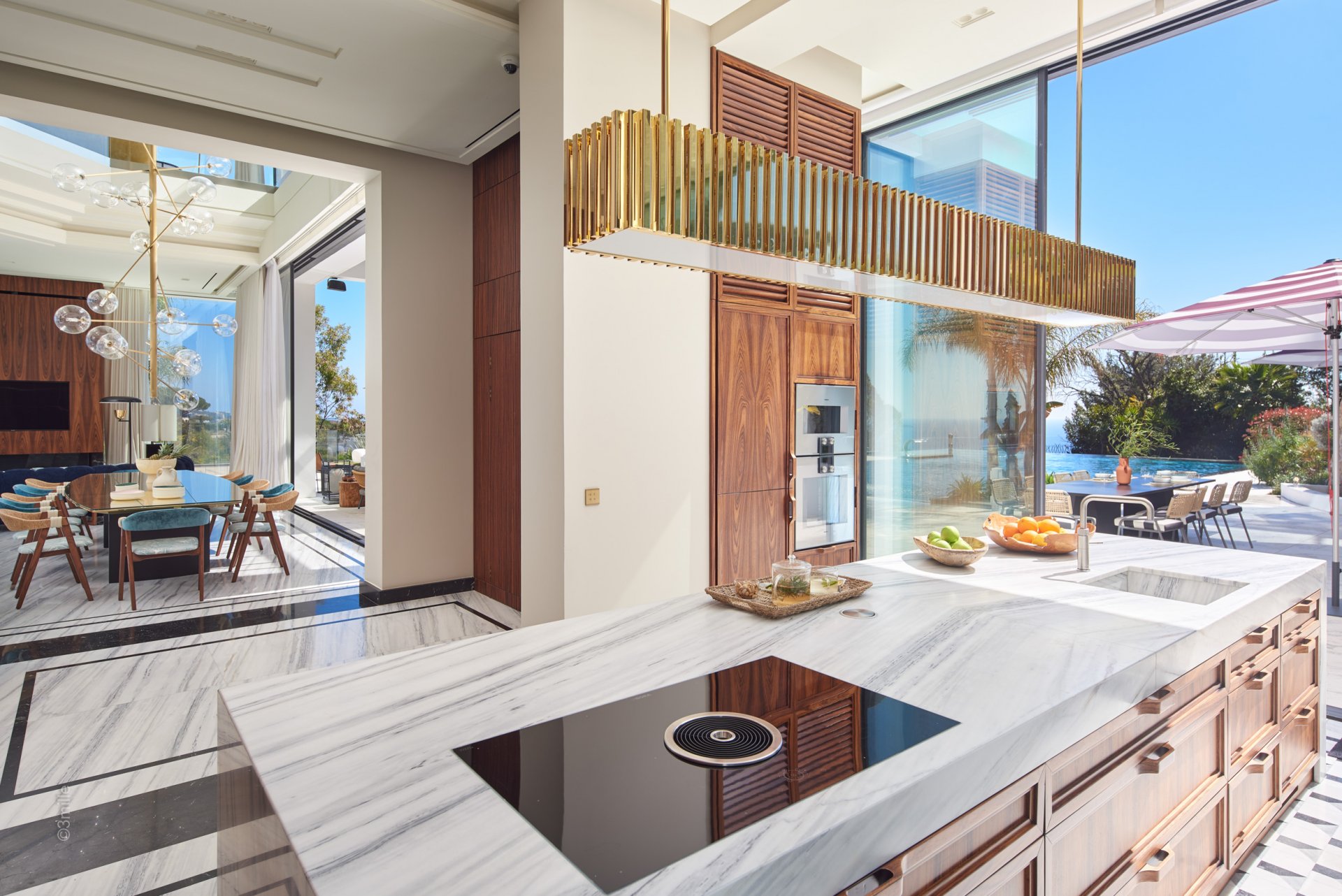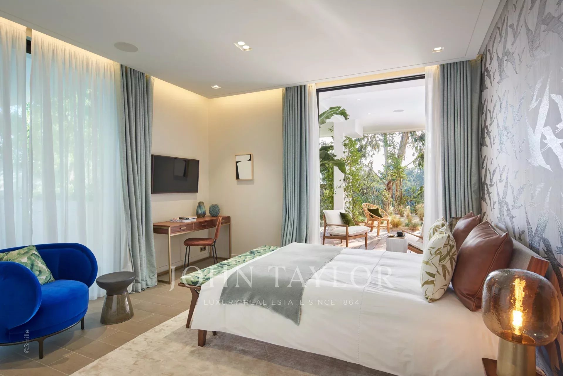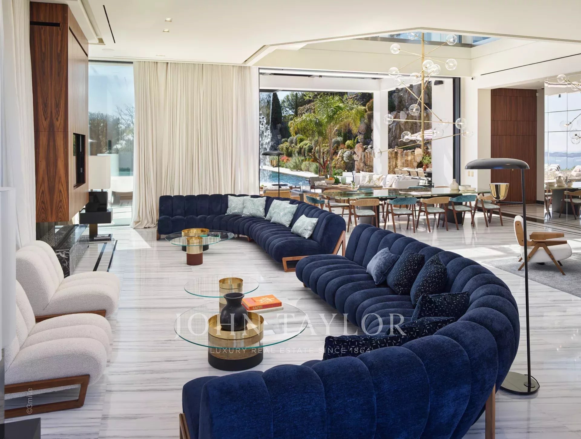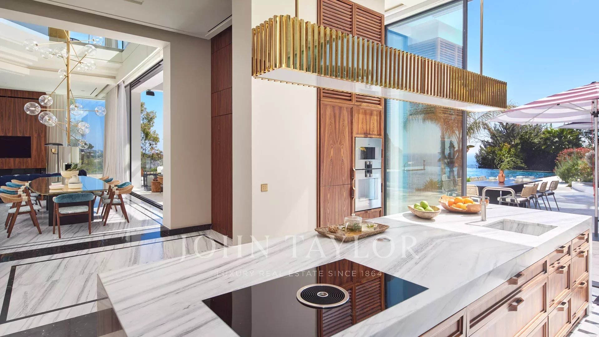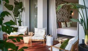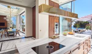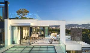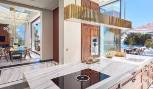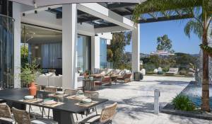 Gli spazi esterni sono altrettanto sontuosi, con una terrazza al piano terra che presenta un ponte a bordo piscina con vista panoramica sul mare, un braciere, un barbecue e una zona pranzo, con vista sulla piscina riscaldata e due cascate. I piani superiori offrono terrazze panoramiche attrezzate con sedie a sdraio e un braciere, mentre il giardino mediterraneo terrazzato comprende un campo da pétanque e un orto.