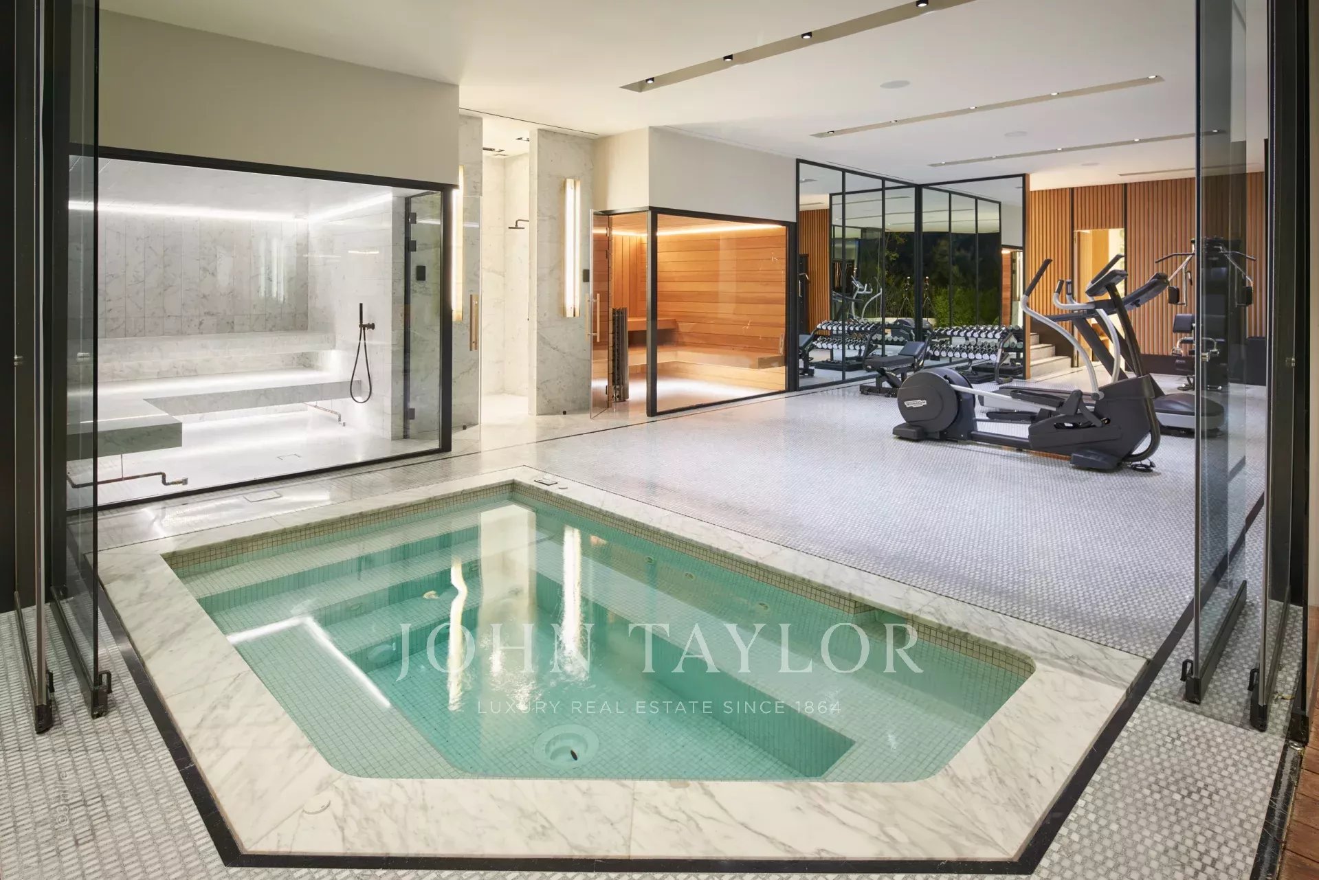 - Il piano giardino comprende due camere da letto con bagno privato, due camere da letto che condividono un bagno, una sala cinema e una spa completa di hammam, sauna, sala massaggi e jacuzzi, oltre a una sala fitness per gli amanti del benessere.