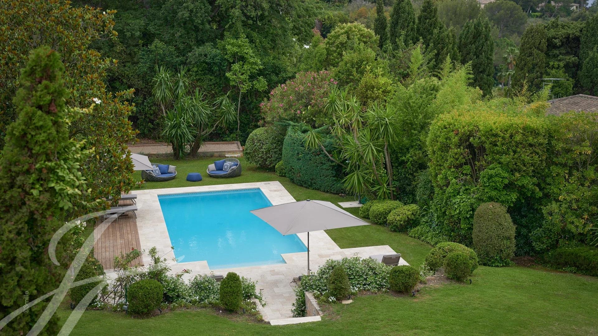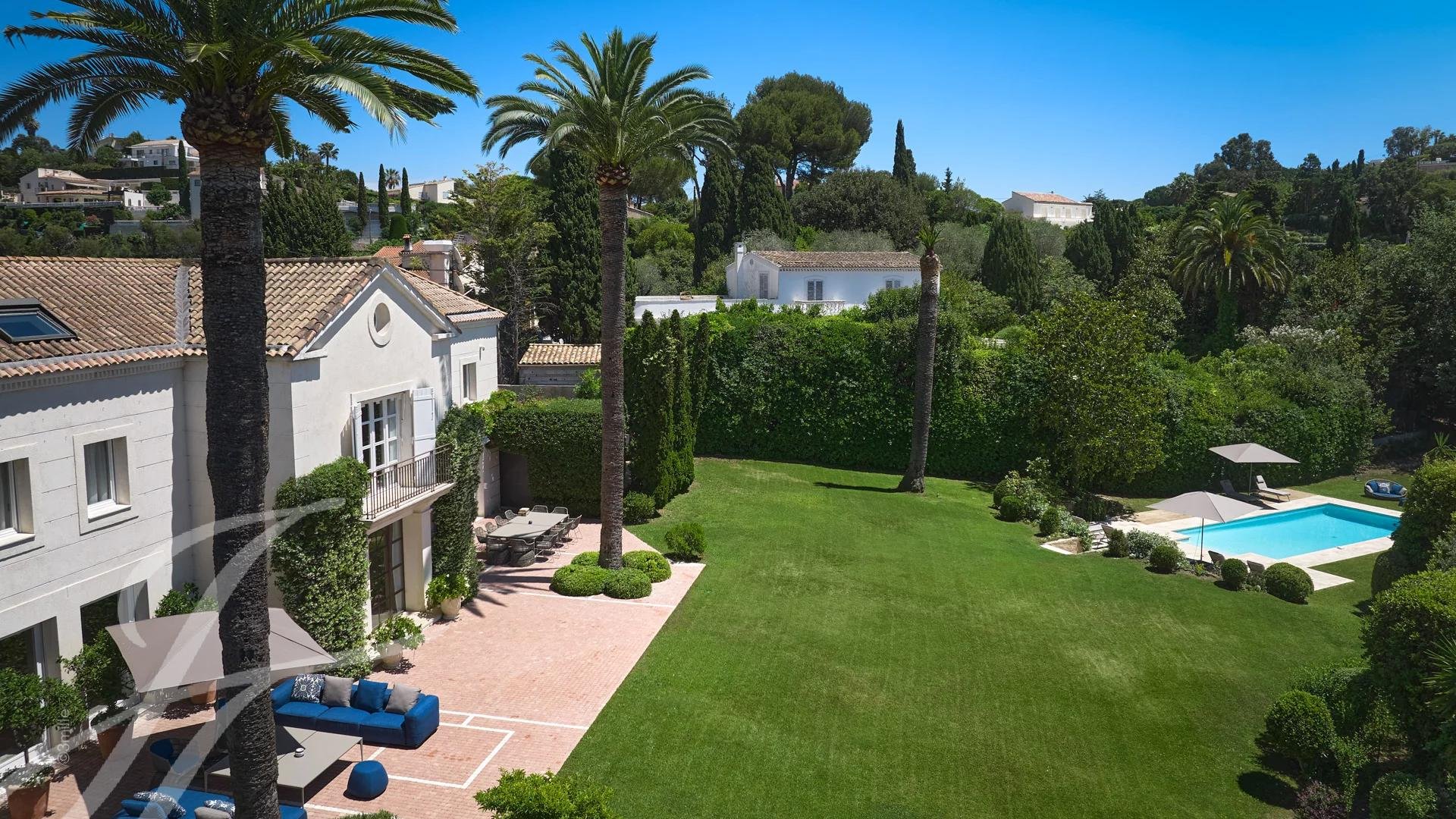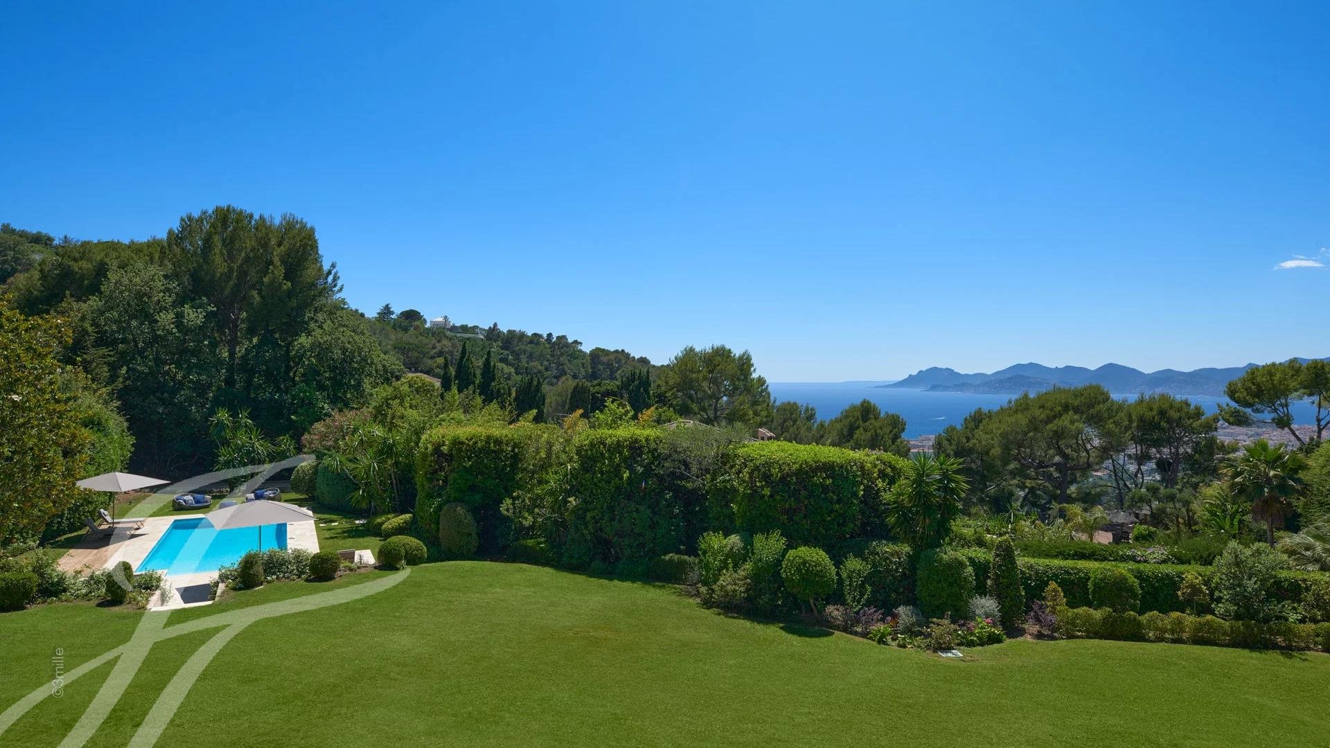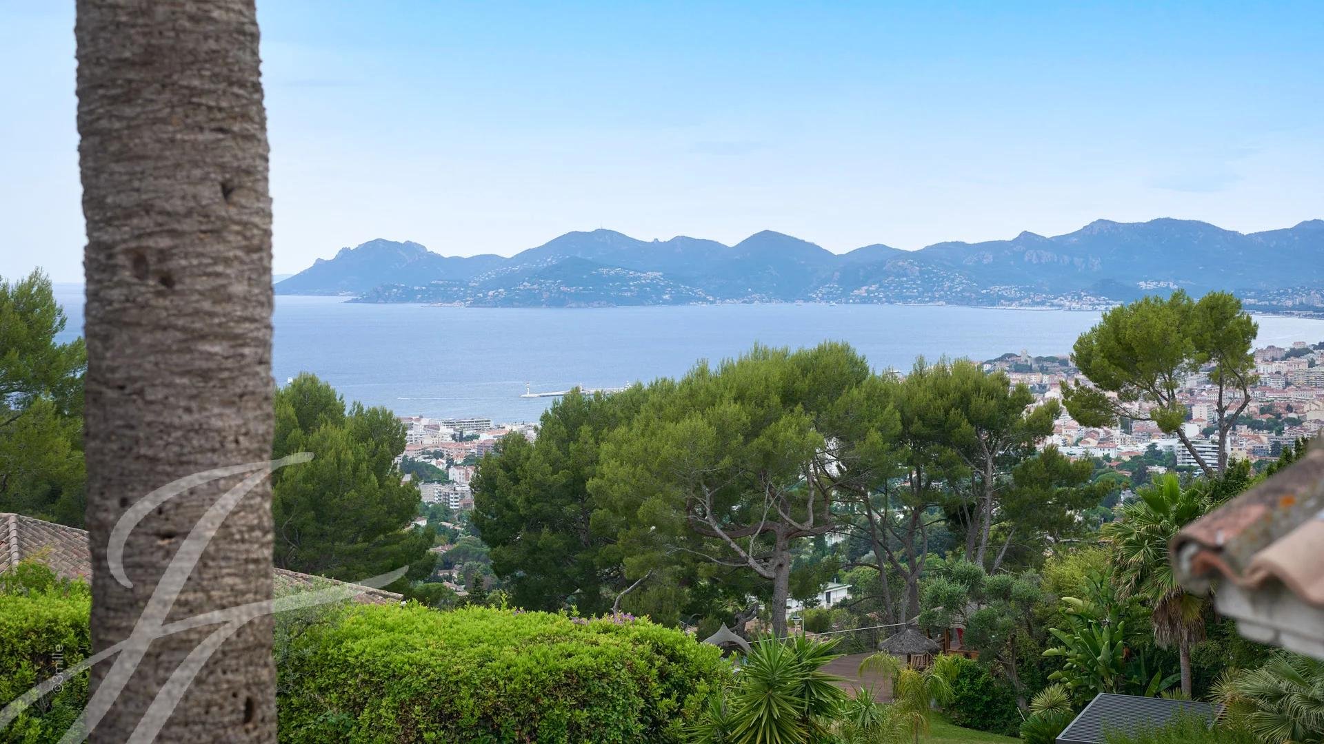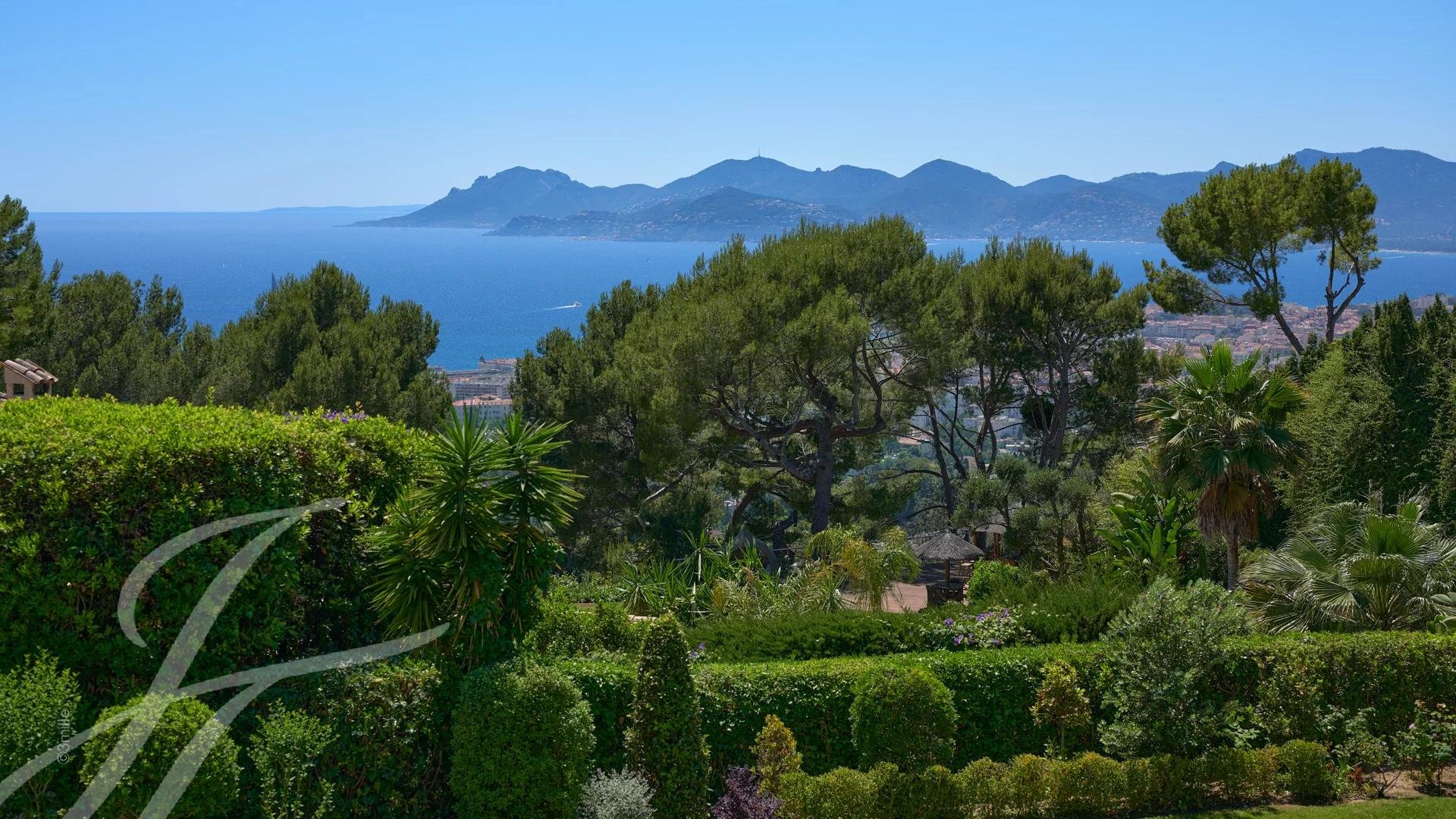Immersa in 2.100 m2 di giardino, questa superba villa vanta 378 m2 di spazio abitabile, esposizione a sud-ovest e vista sul mare della baia di Cannes e sul Massiccio dell'Estérel.
