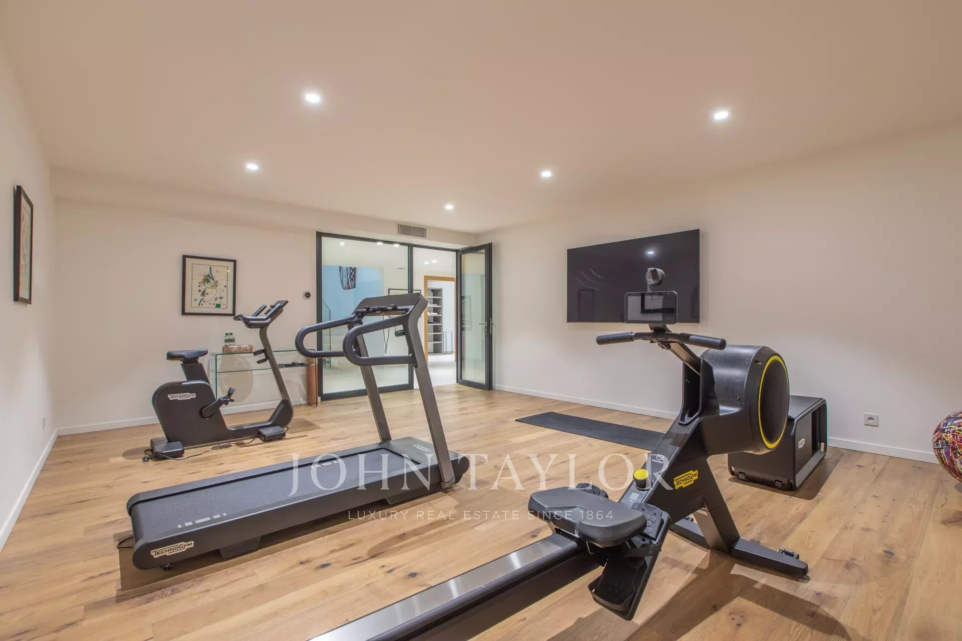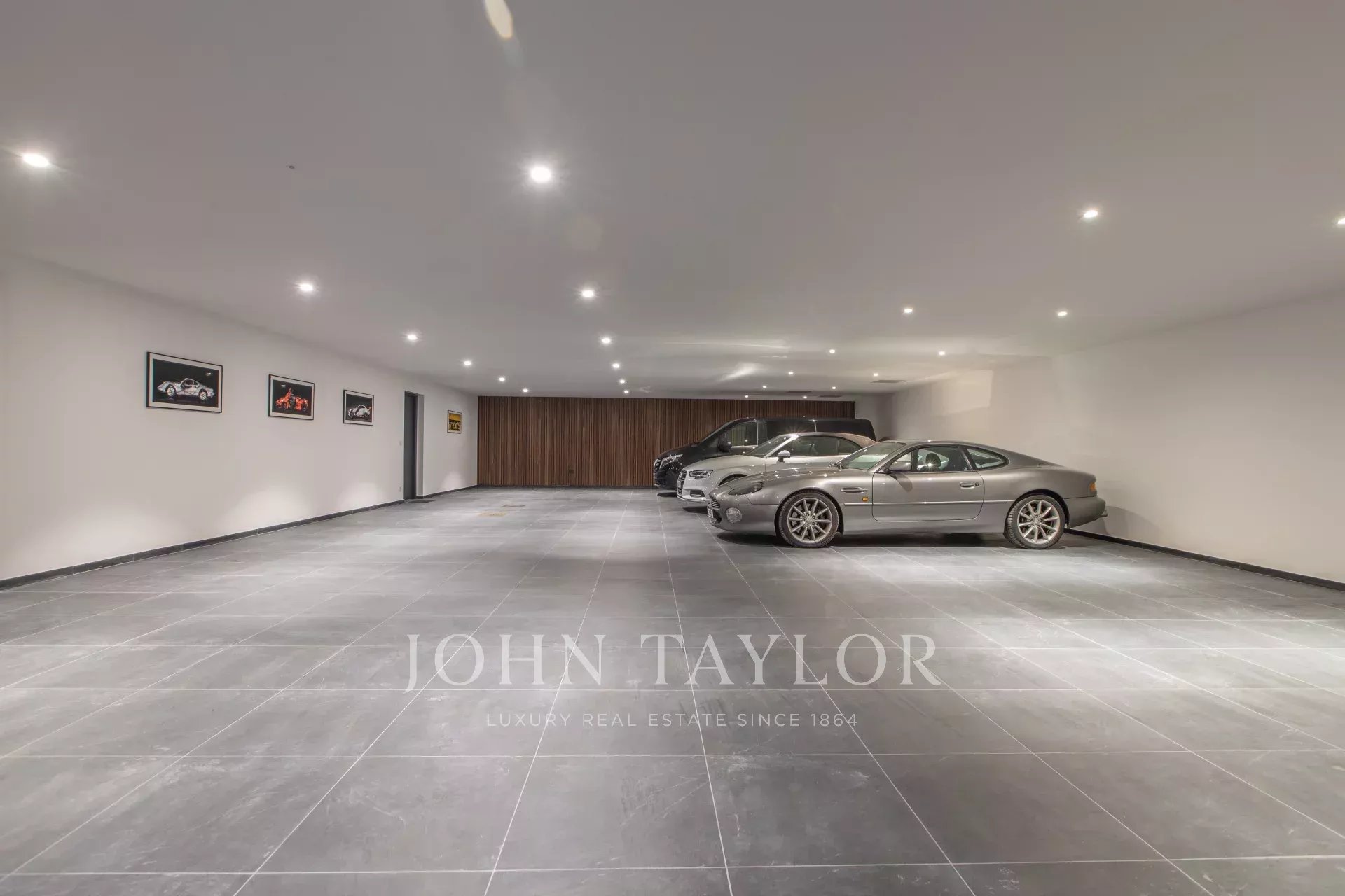 Il piano interrato comprende una cantina, una palestra, una sala giochi, una sala cinema, una stanza per la biancheria e un garage per un massimo di 12 auto.