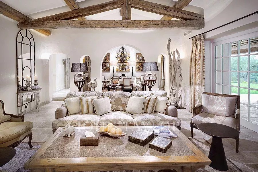 Soggiorno con camino e TV (schermo integrato dietro lo specchio) che si apre sulla terrazza coperta, sul salotto estivo e sulla piscina (vista sulla baia di Cannes).