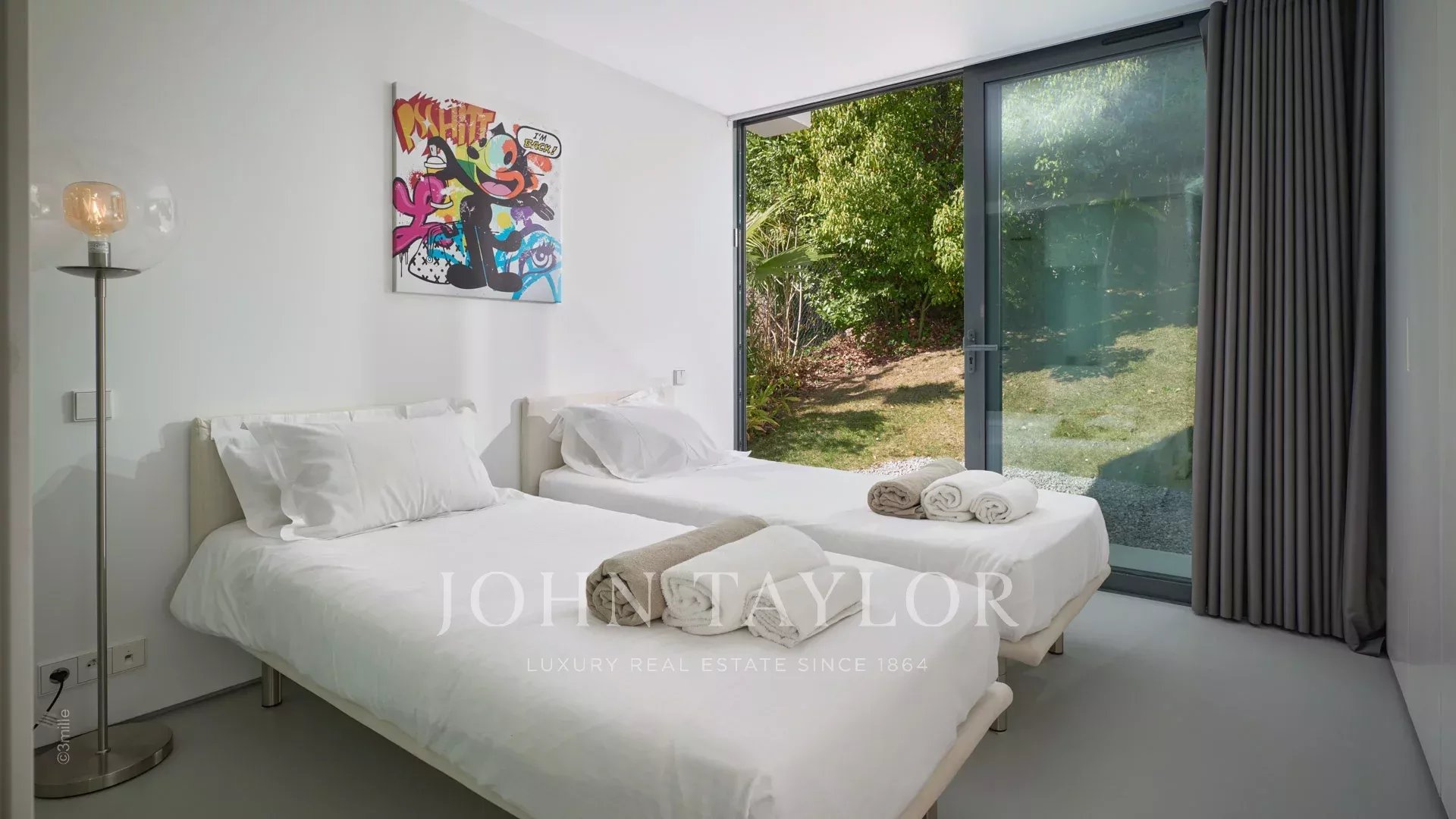 Sulle alture di Golfe-Juan e completamente climatizzata, questa bella proprietà di architettura moderna costruita su 2 livelli è così composta: