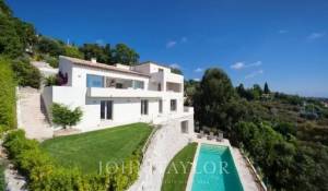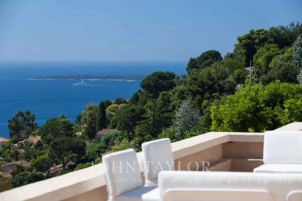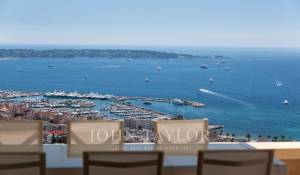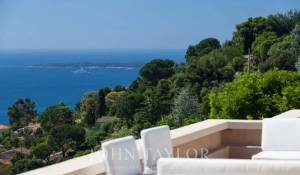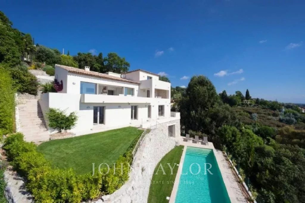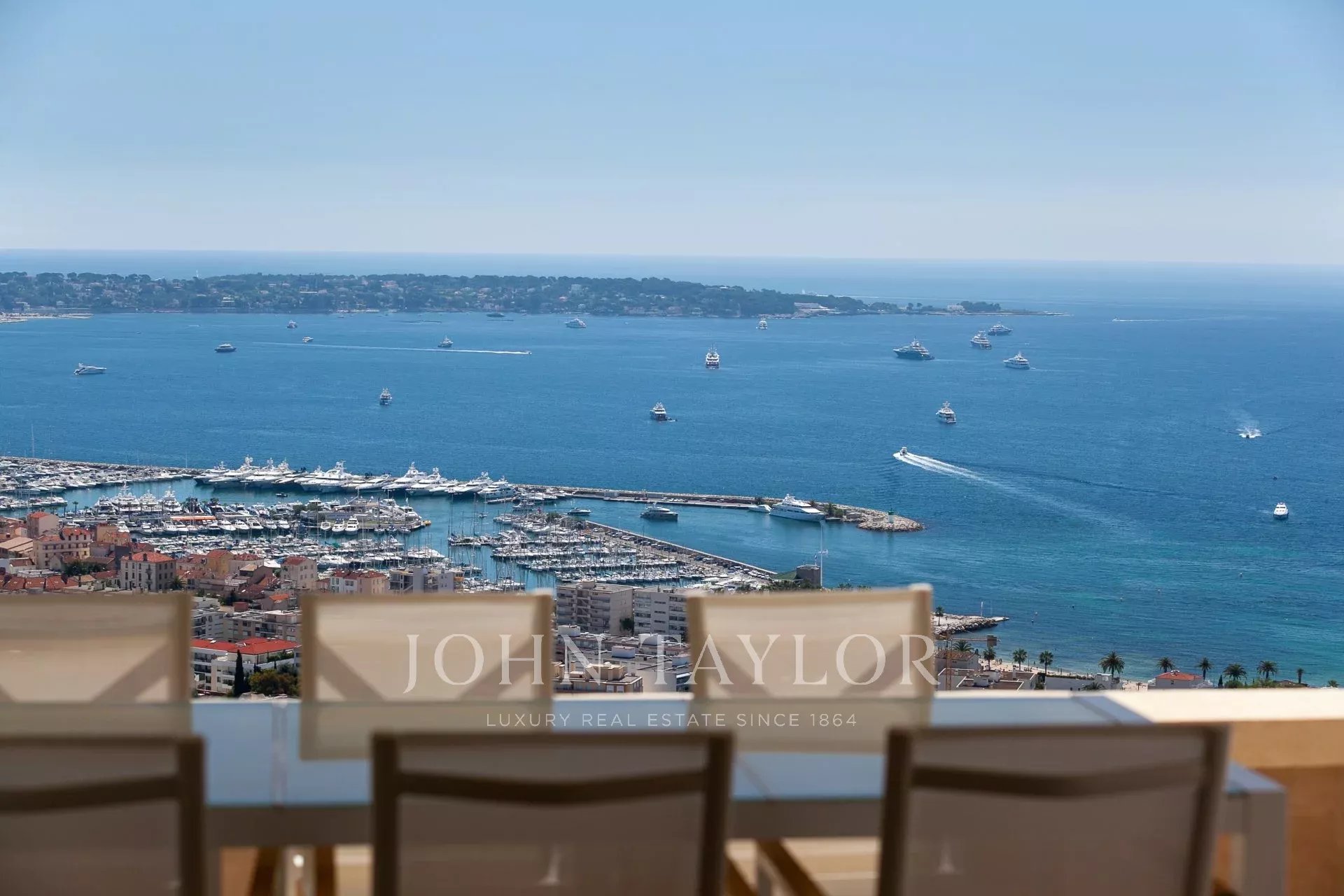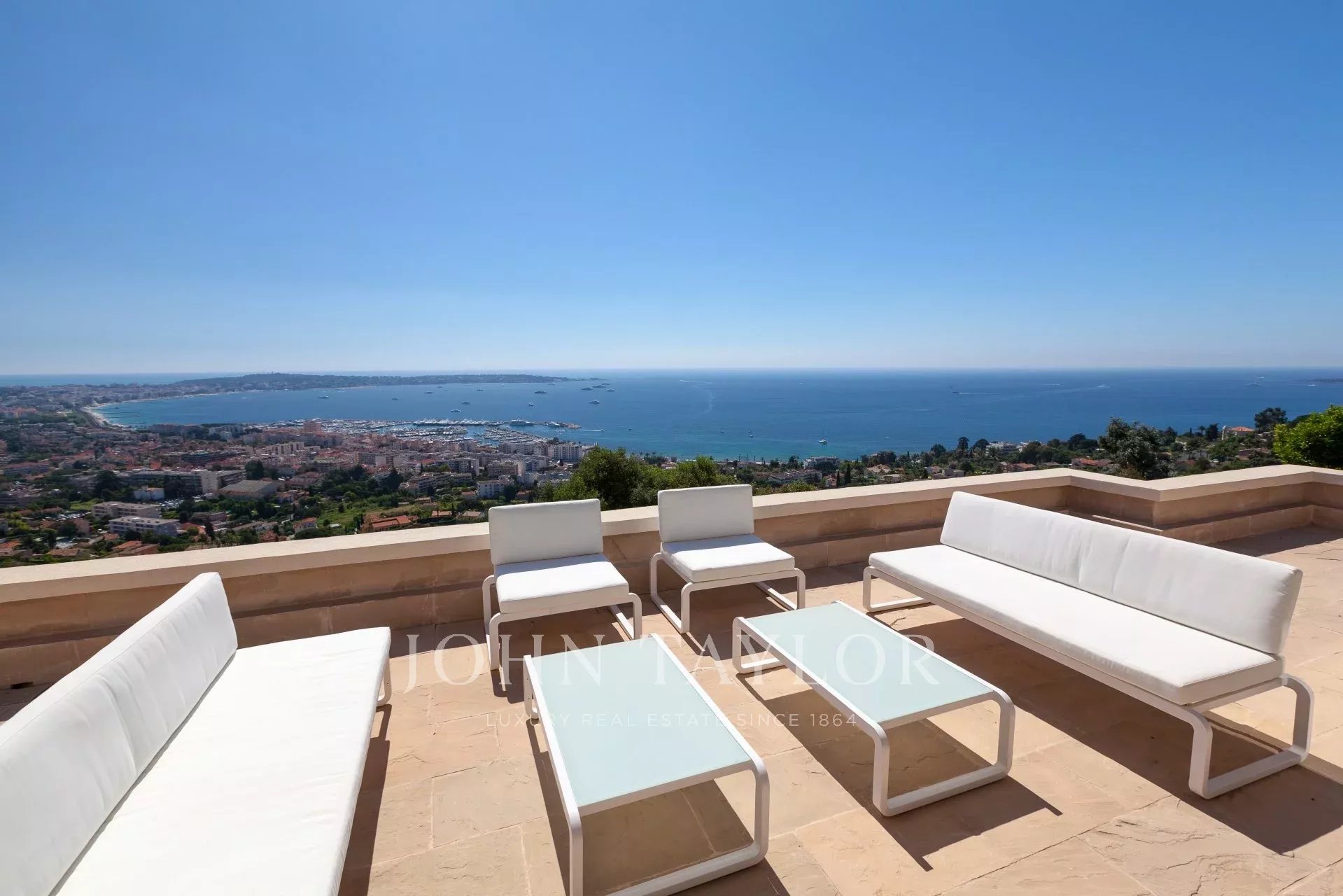 Sulle alture di Cannes, nel cuore di un giardino di 2.000 m2 esposto a sud-est, superba villa in stile contemporaneo, completamente ristrutturata e climatizzata, con magnifica vista sul mare fino a Cap d'Antibes.