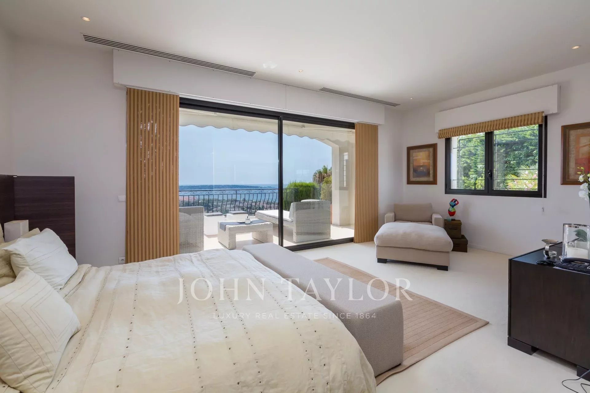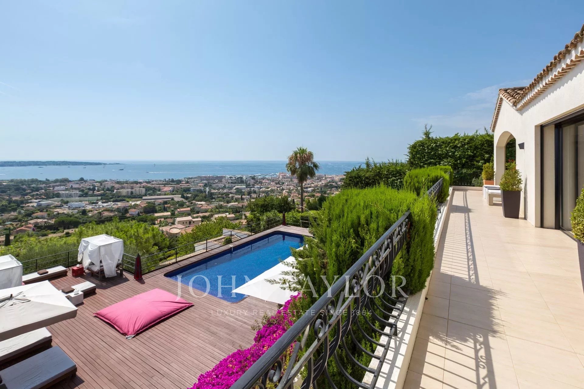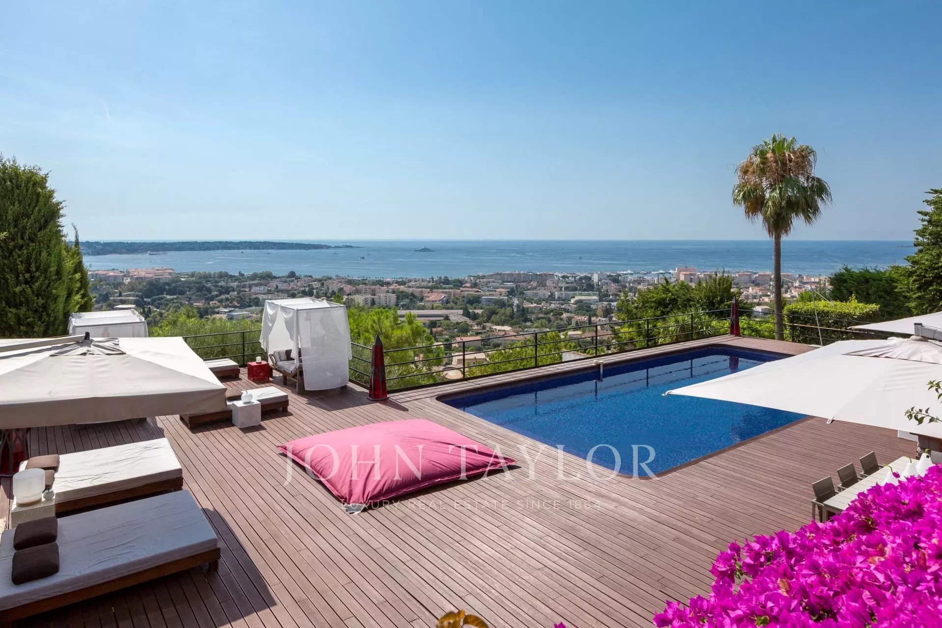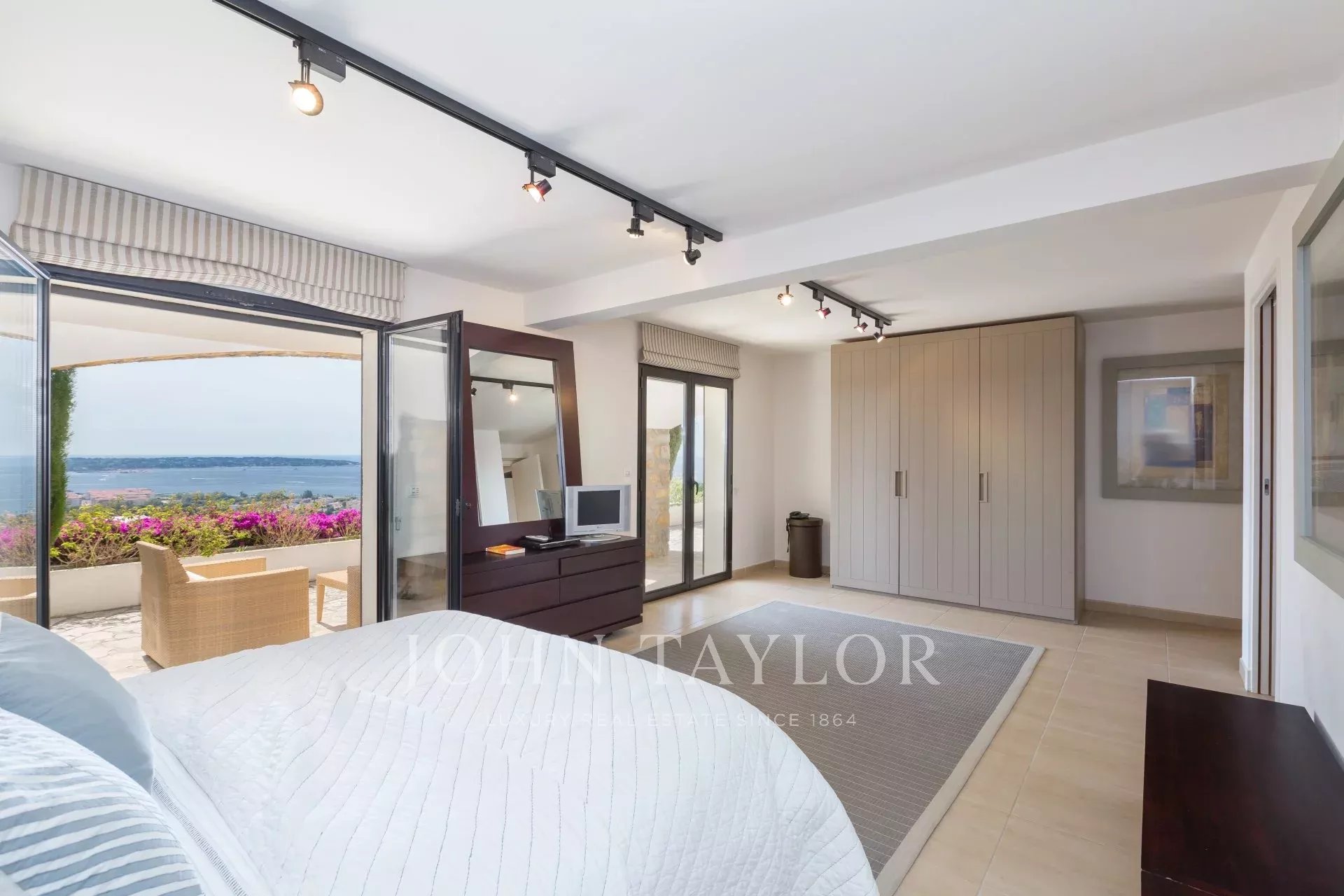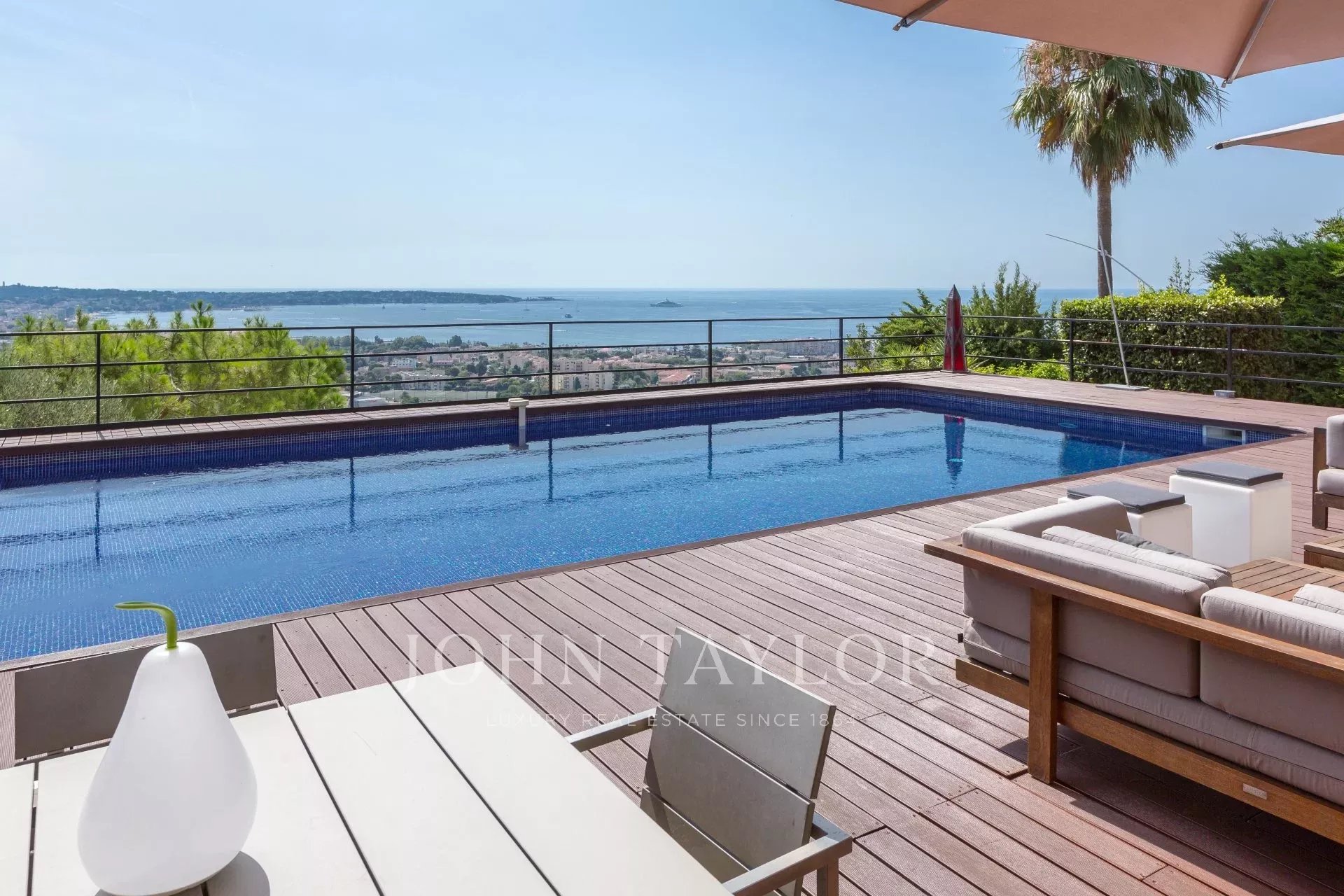 Sulle alture di Golfe-Juan, nel cuore di un giardino paesaggistico di circa 3.000 m², questa magnifica villa vanta caratteristiche contemporanee di alta qualità e un'eccezionale vista panoramica sul mare fino a Cap d'Antibes.