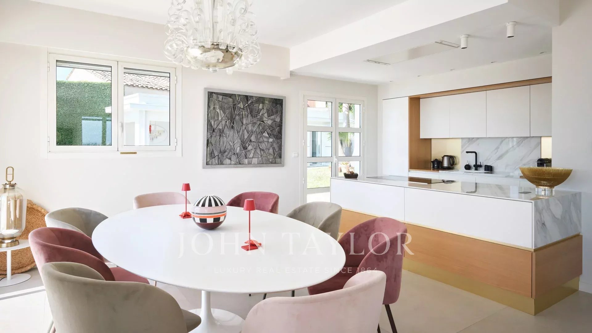Reception che si apre sul giardino e sulla piscina, composta da salotto, sala da pranzo e cucina a vista.