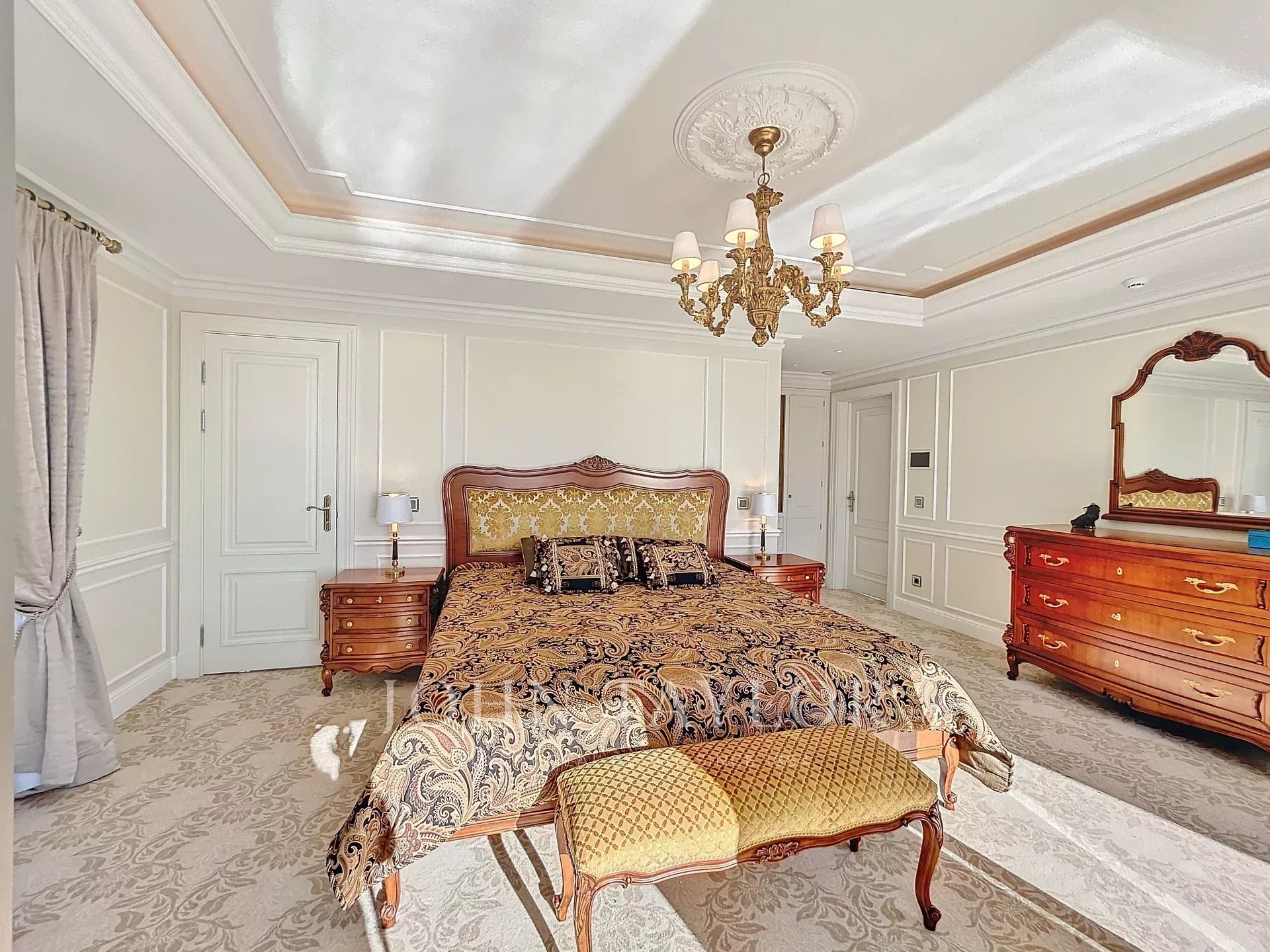 Camera da letto principale con accesso a una terrazza e vista sul mare delle isole Lérins, dotata di spogliatoio e bagno con doccia/WC.