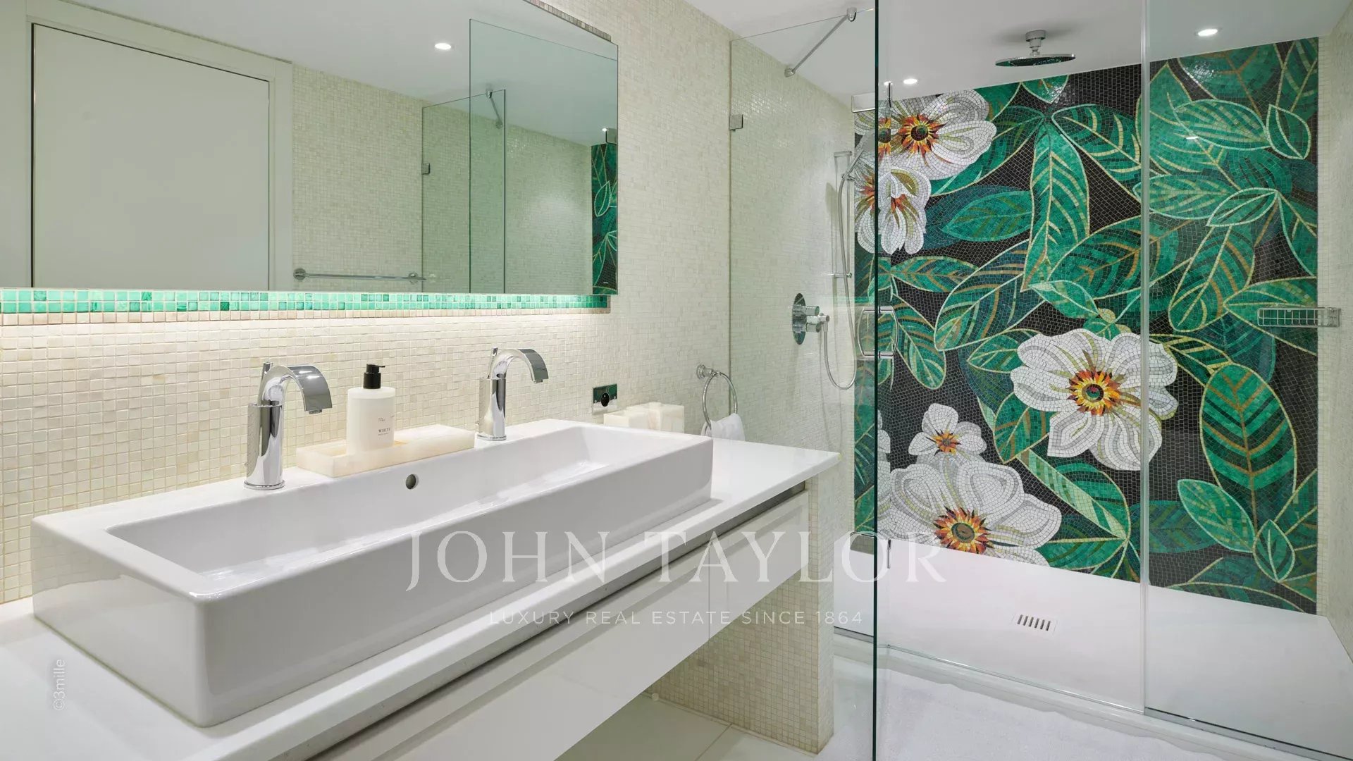 L'ingresso conduce a un'ampia sala di ricevimento che si apre su una magnifica terrazza con vista sul mare e sulla vecchia Antibes, composta da un salotto e da una sala da pranzo che può ospitare 12 persone.