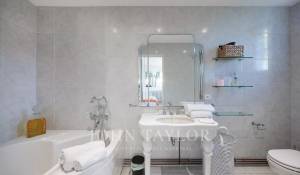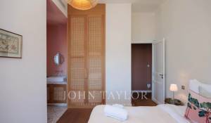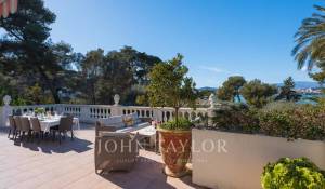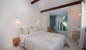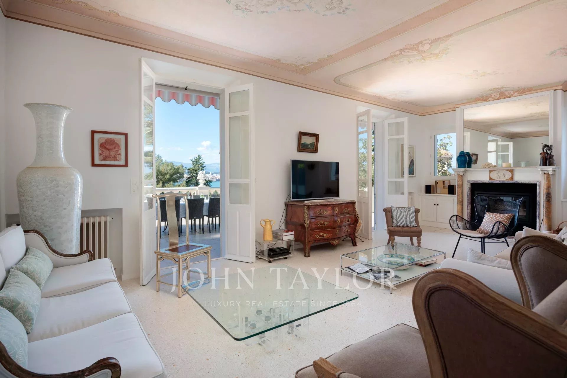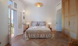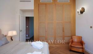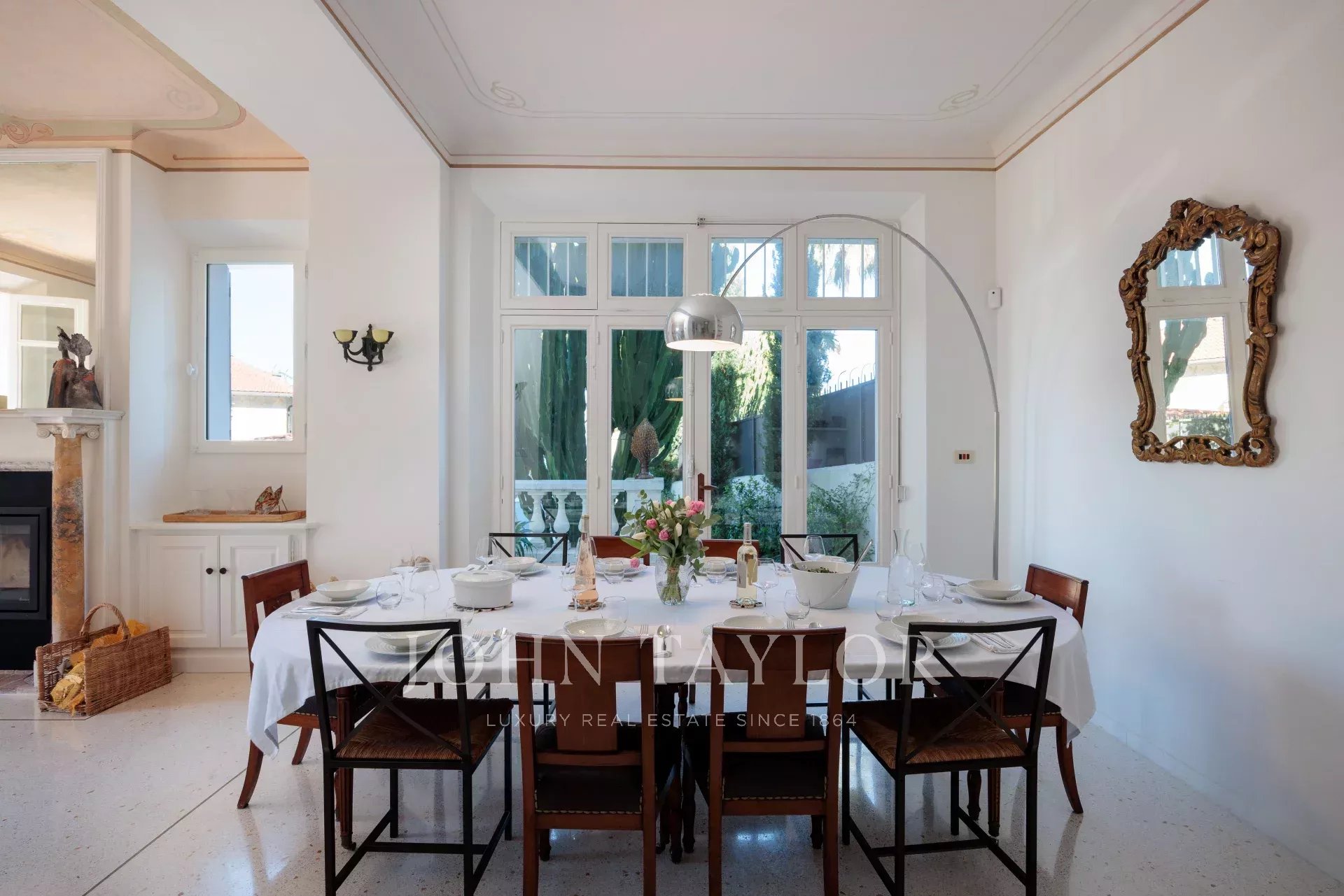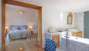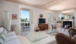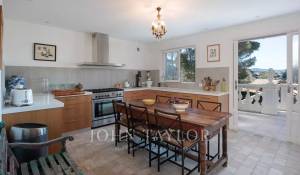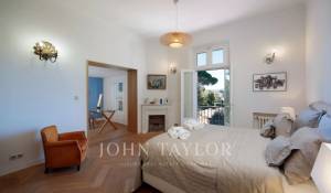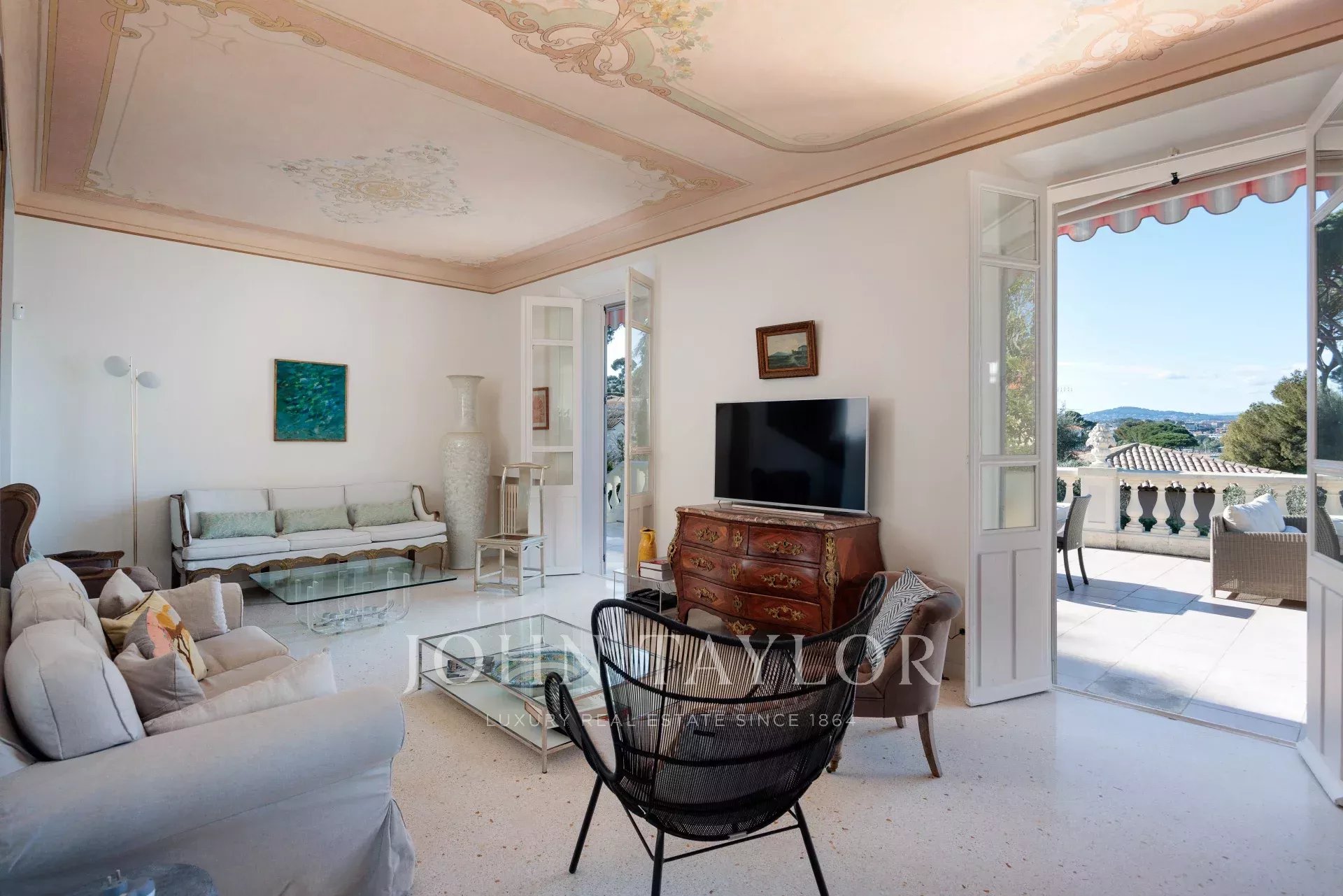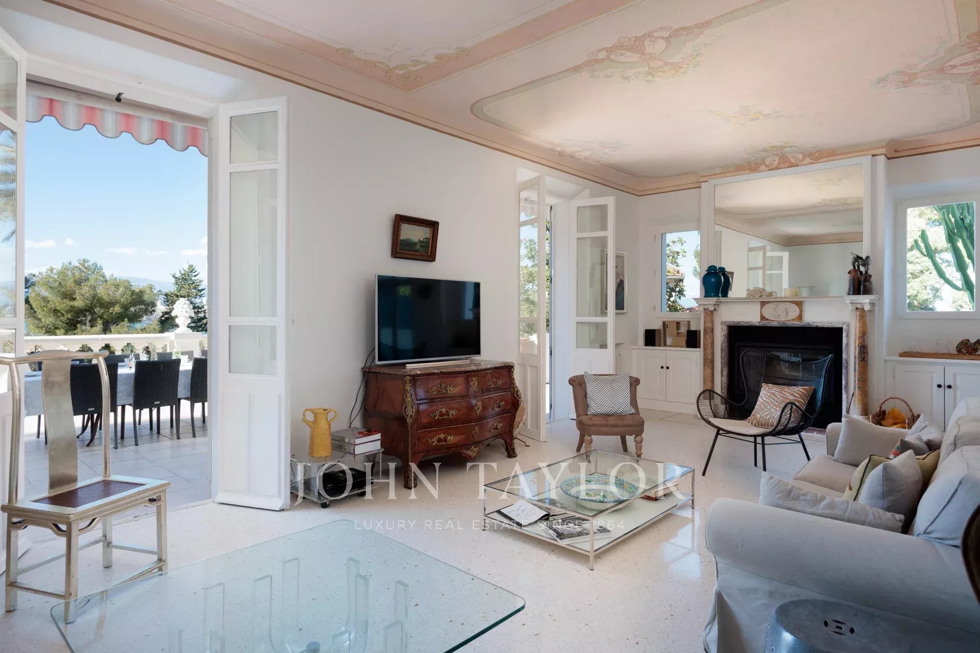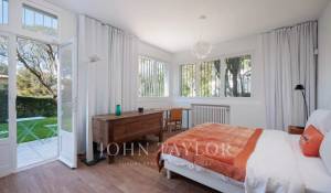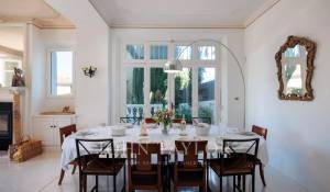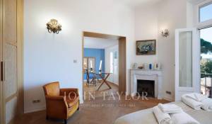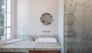 Vicino alle spiagge di La Garoupe e La Salis, questa villa degli anni '30 è stata completamente ristrutturata nel 2019 in uno stile chic e contemporaneo che rispetta gli stilemi delle origini, come il soffitto affrescato del soggiorno.