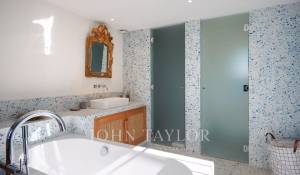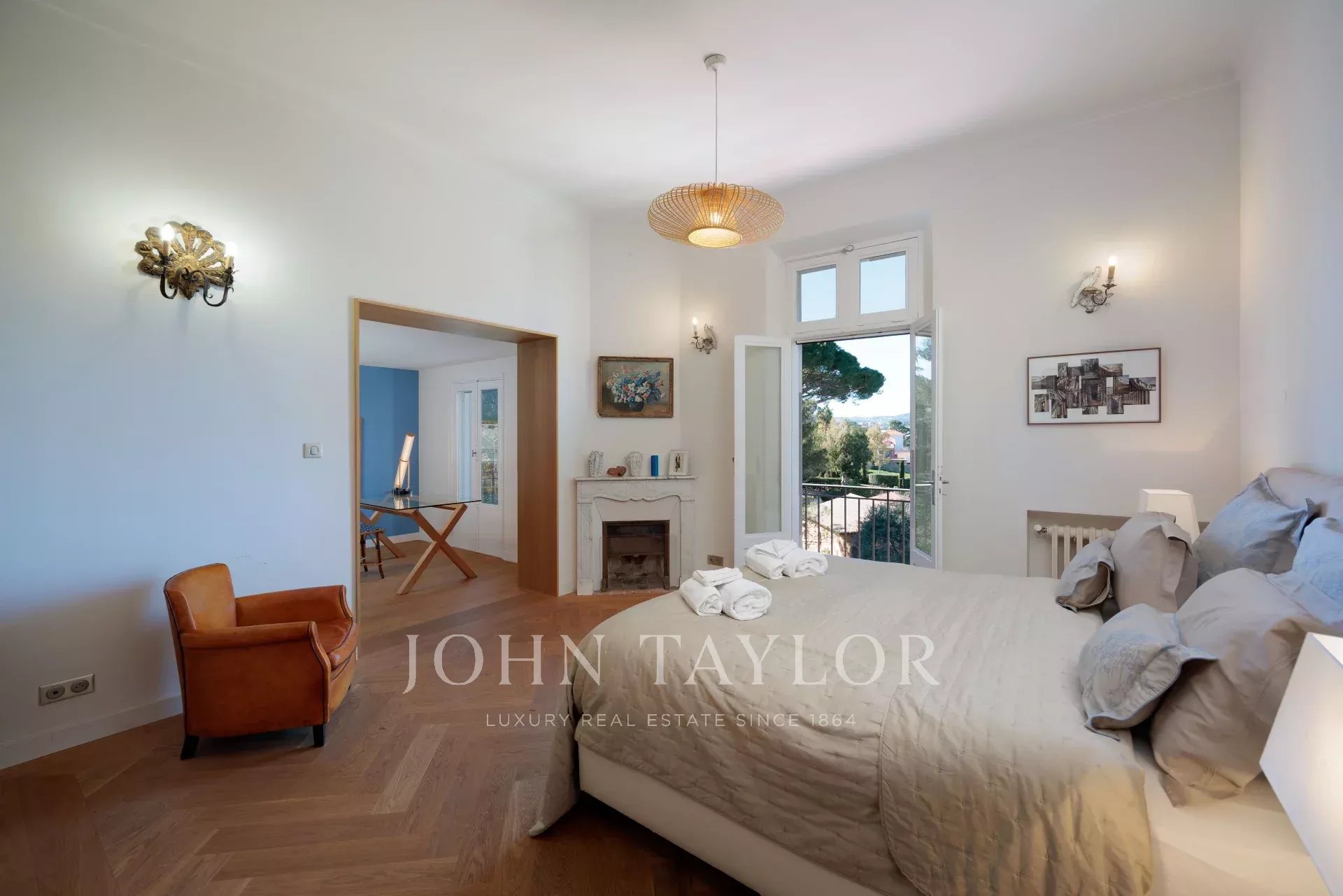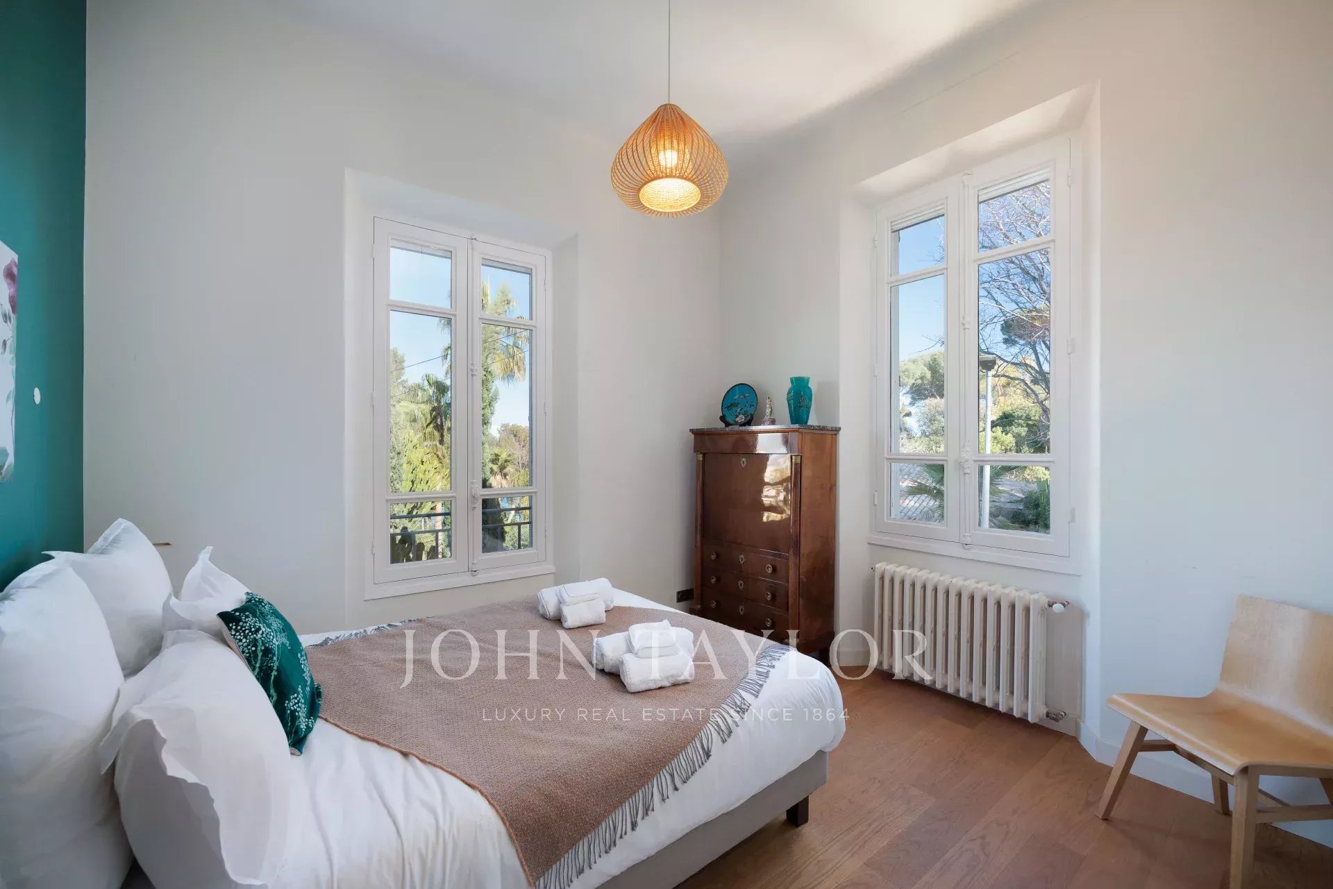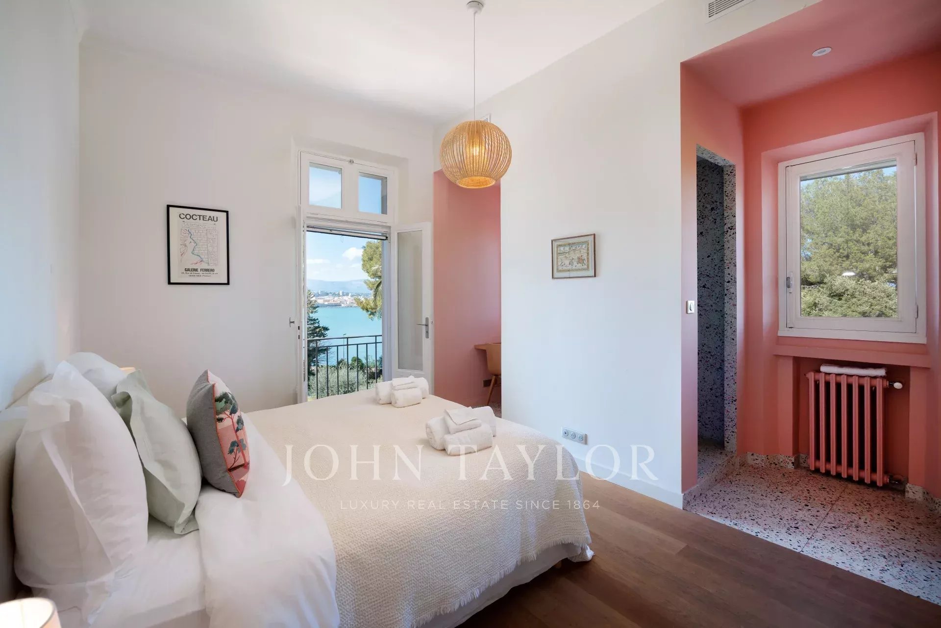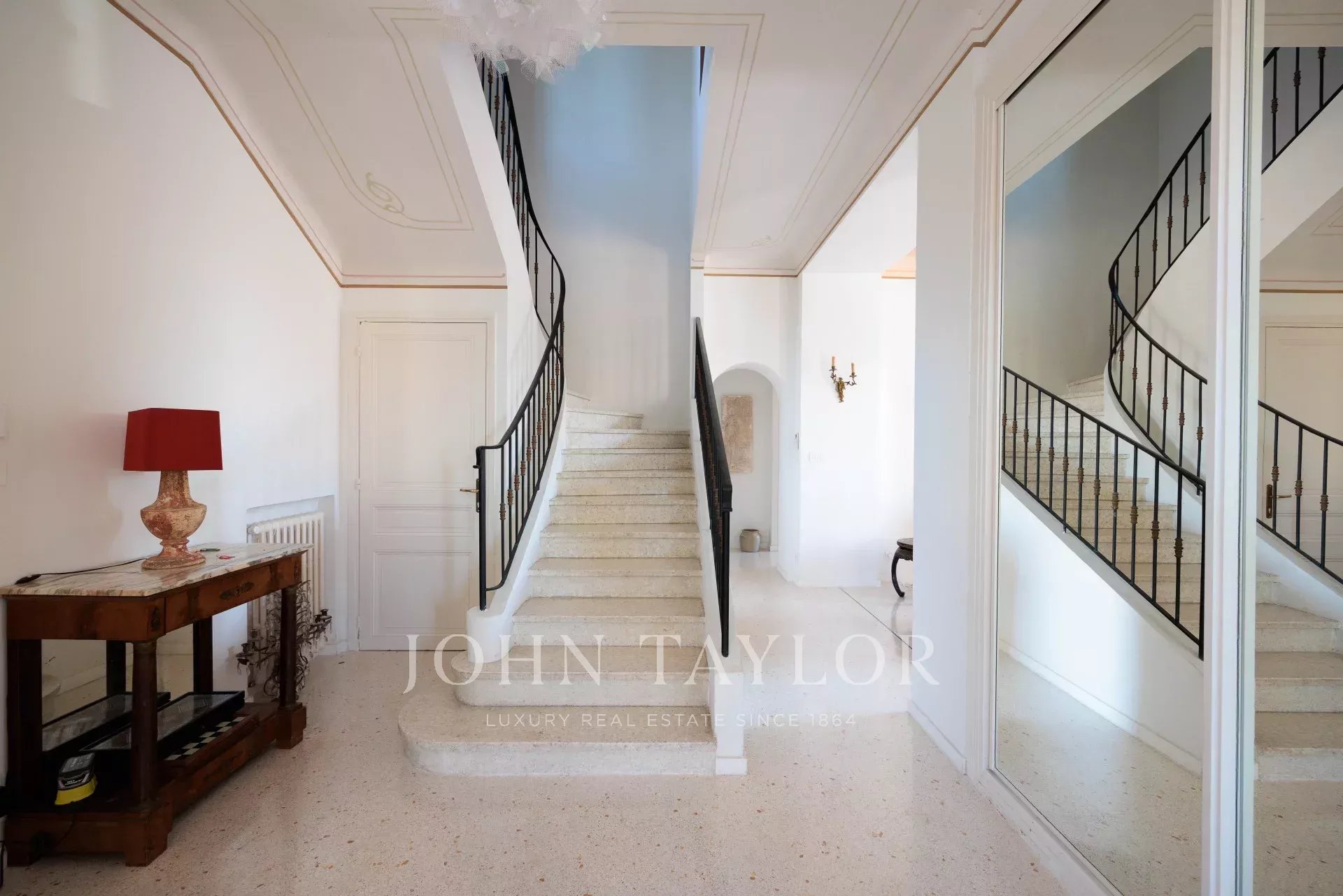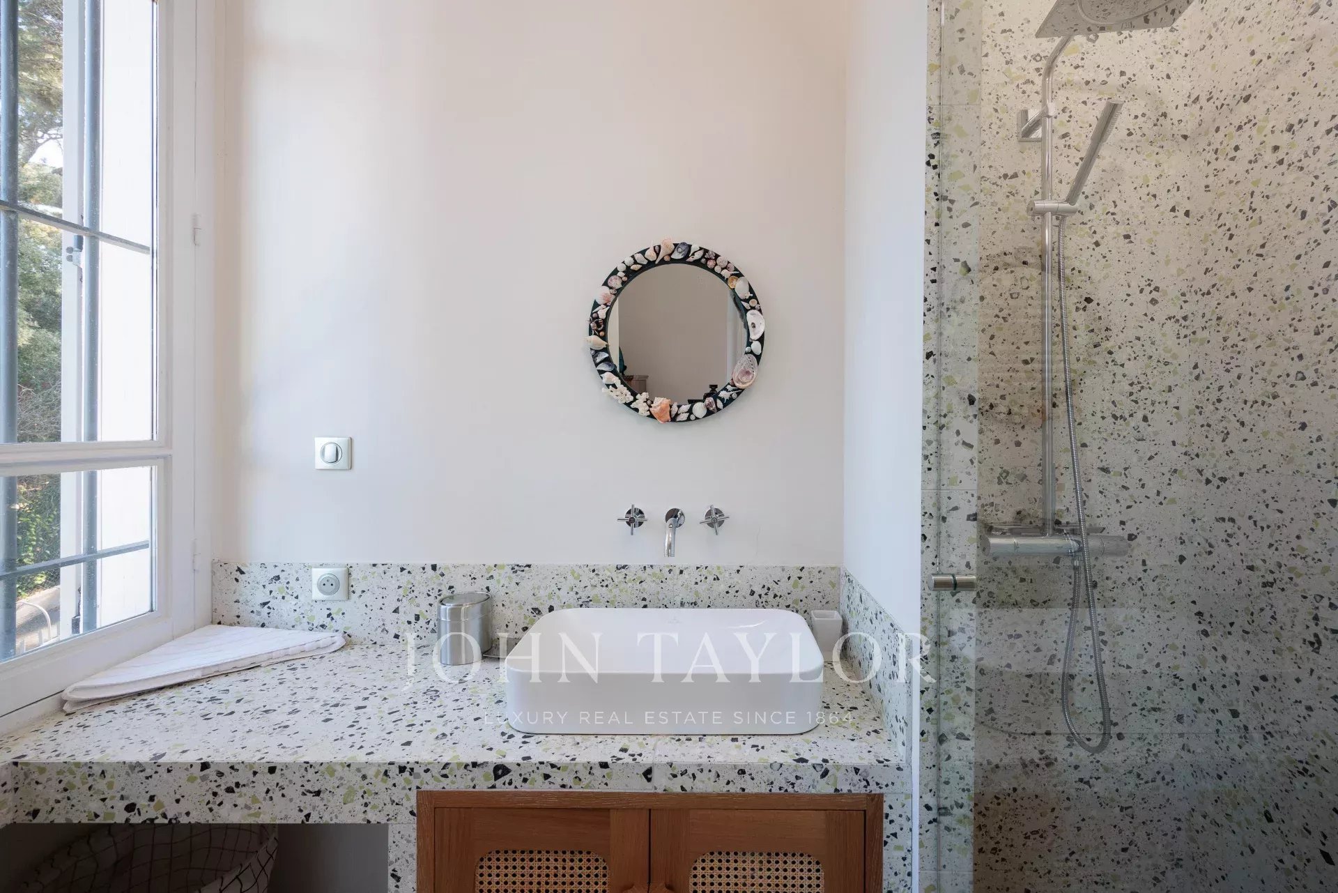 Vicino alle spiagge di La Garoupe e La Salis, questa villa degli anni '30 è stata completamente ristrutturata nel 2019 in uno stile chic e contemporaneo che rispetta gli stilemi delle origini, come il soffitto affrescato del soggiorno.