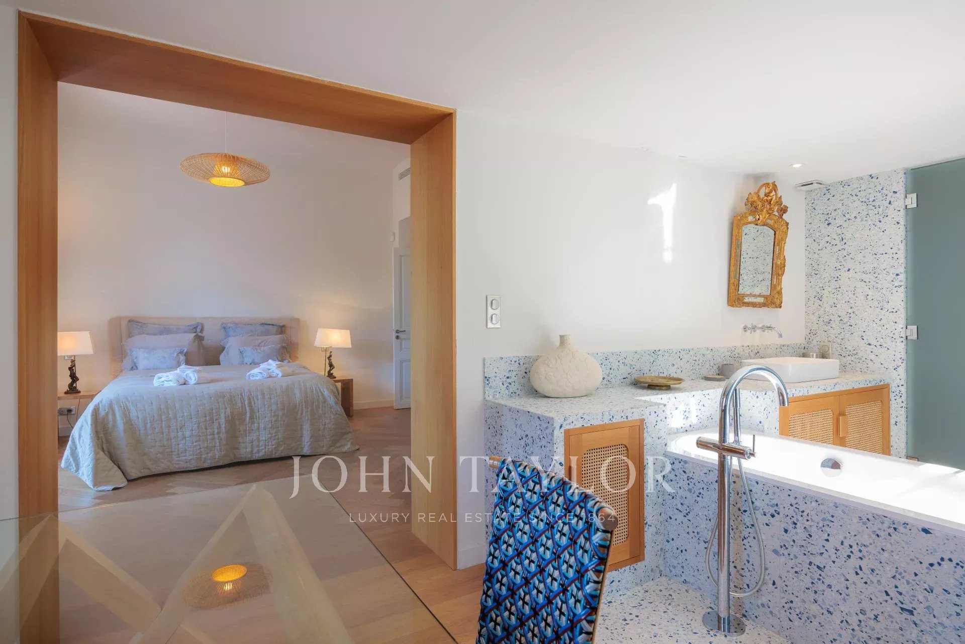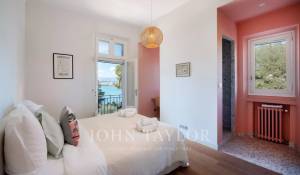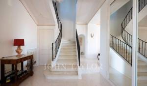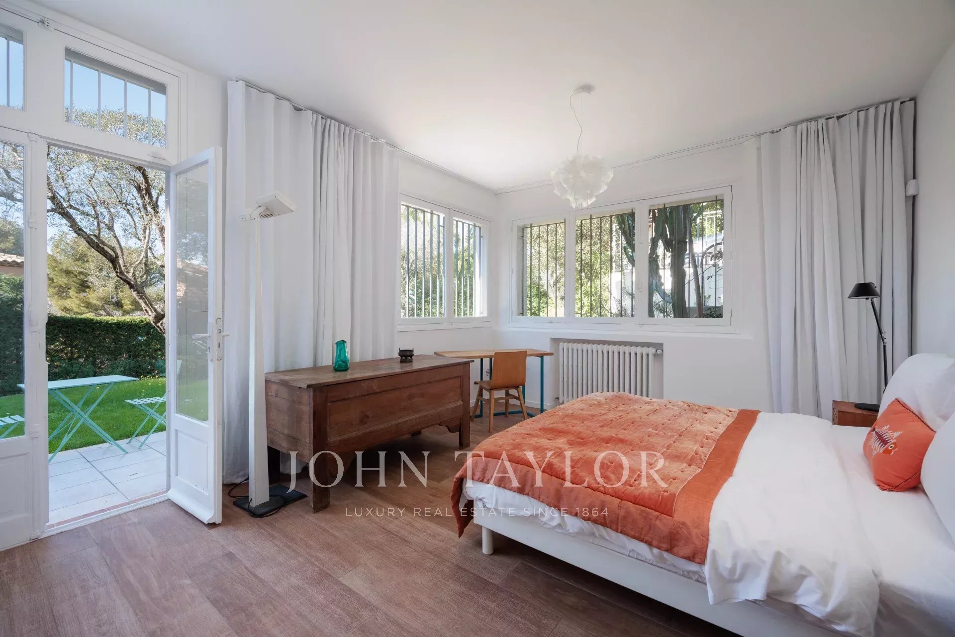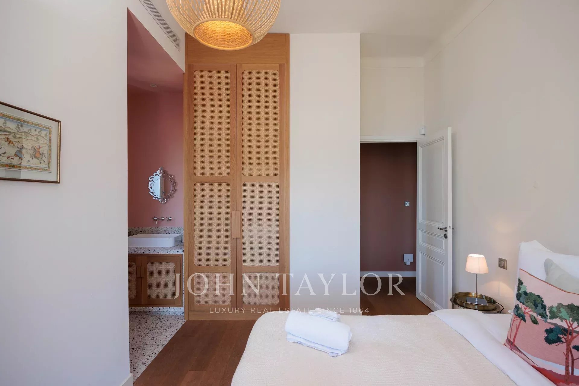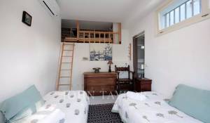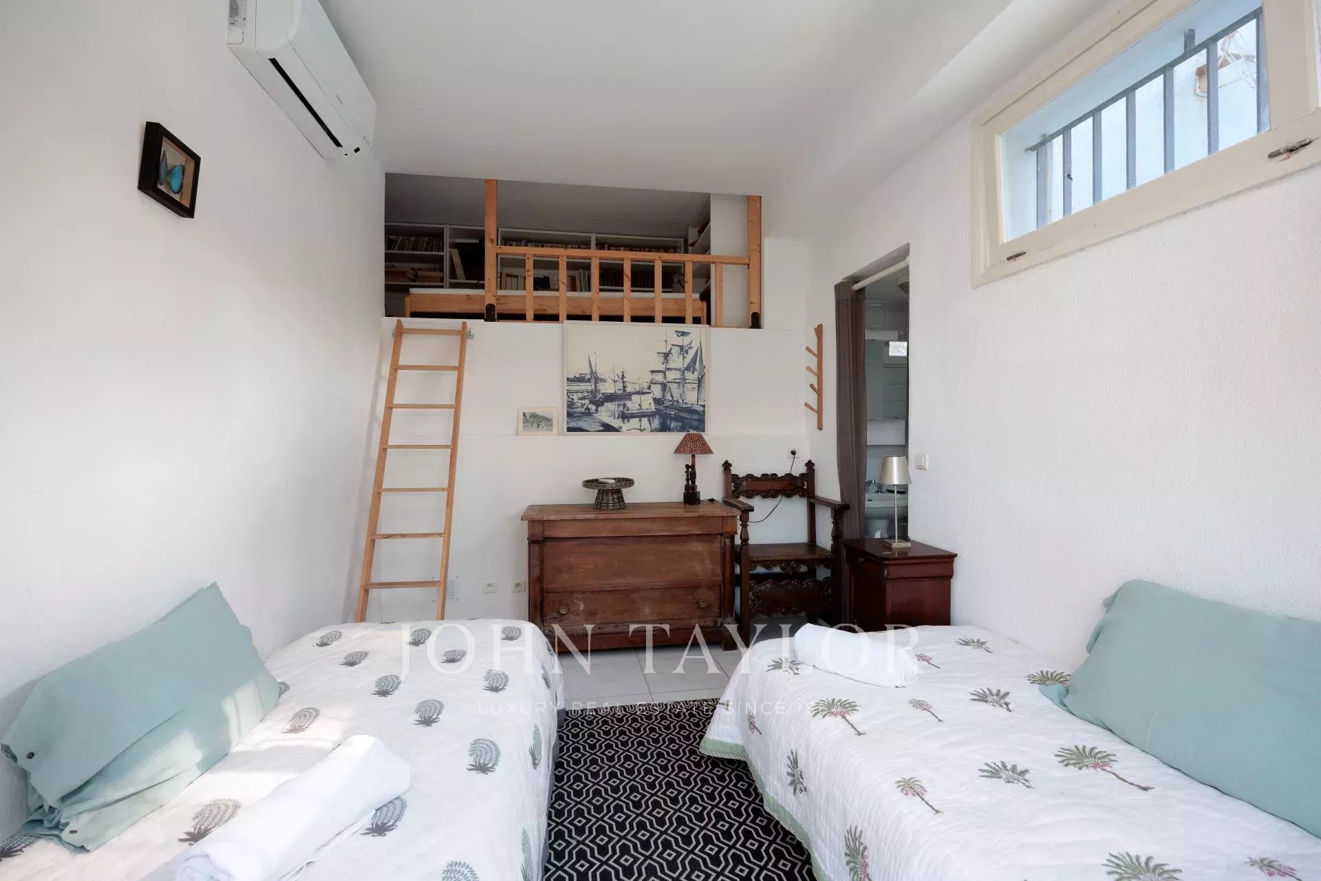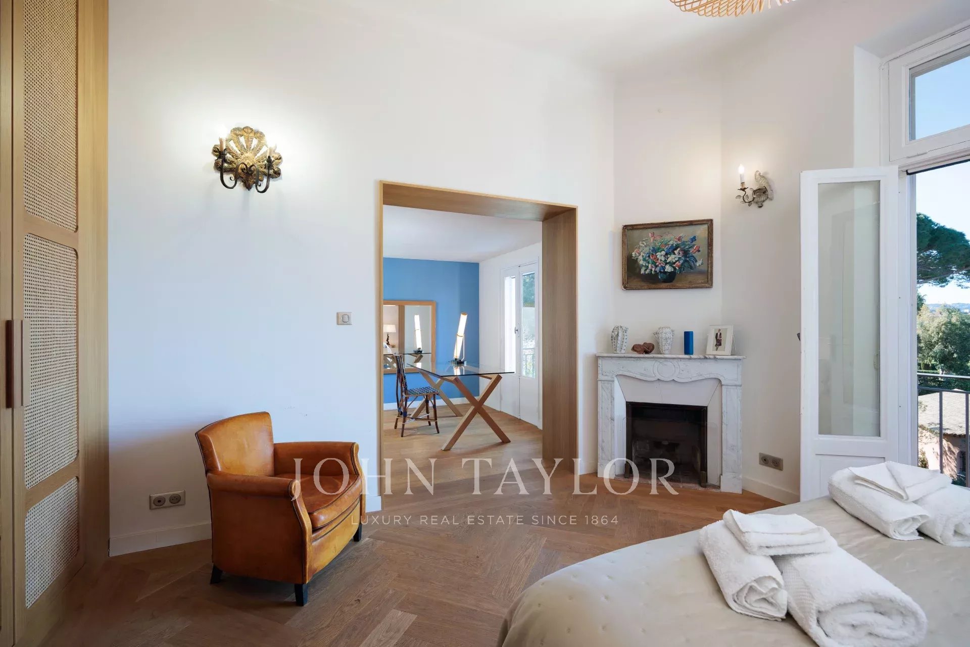 Vicino alle spiagge di La Garoupe e La Salis, questa villa degli anni '30 è stata completamente ristrutturata nel 2019 in uno stile chic e contemporaneo che rispetta gli stilemi delle origini, come il soffitto affrescato del soggiorno.