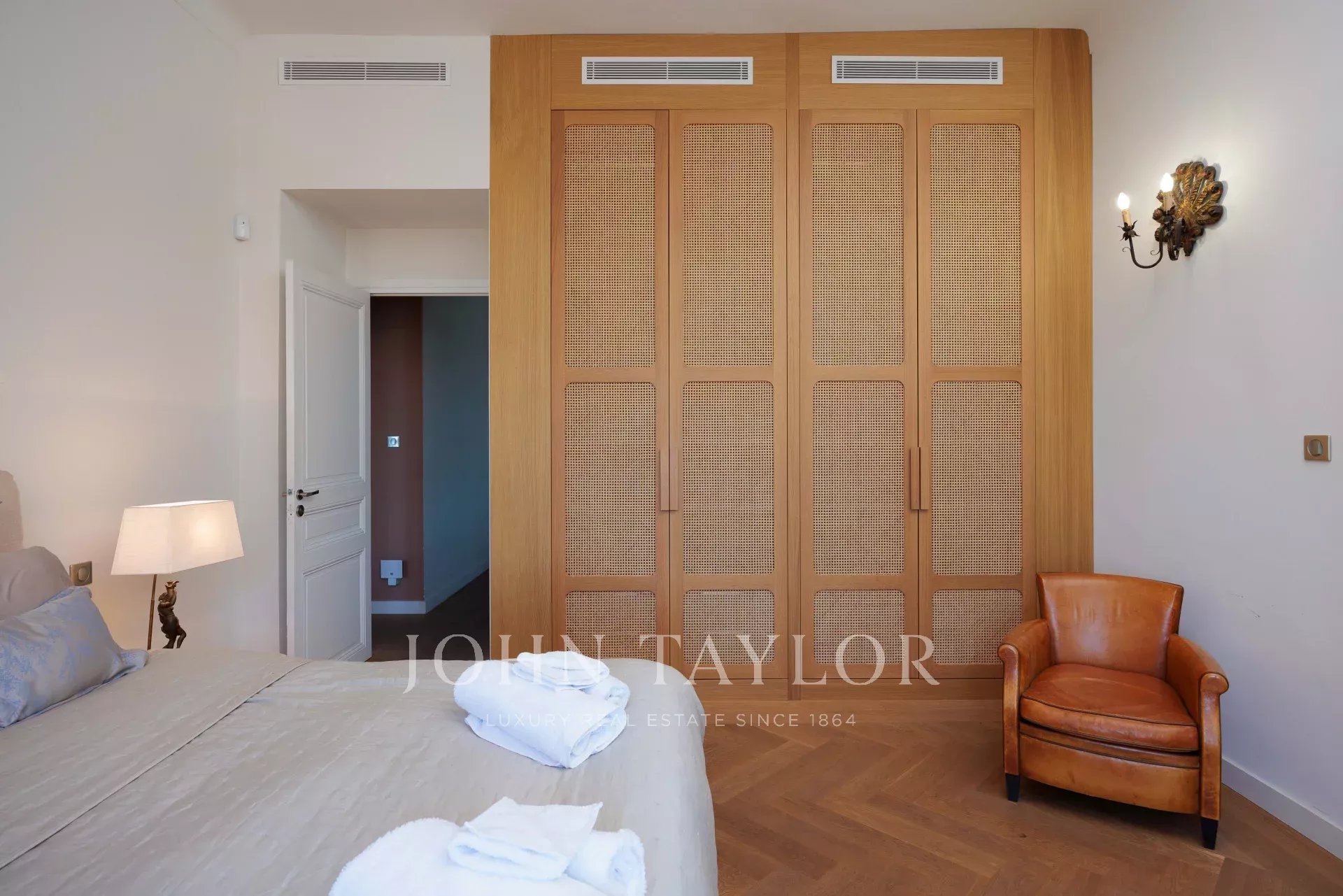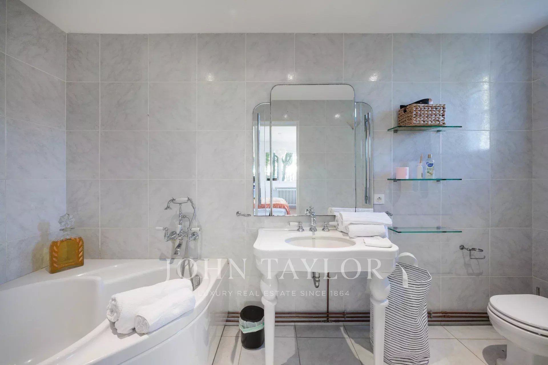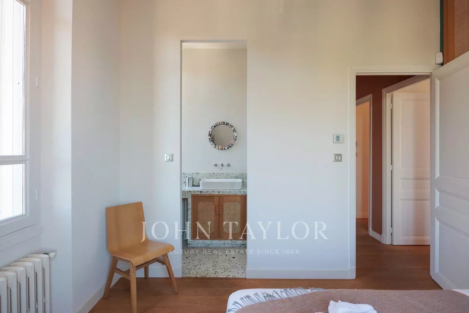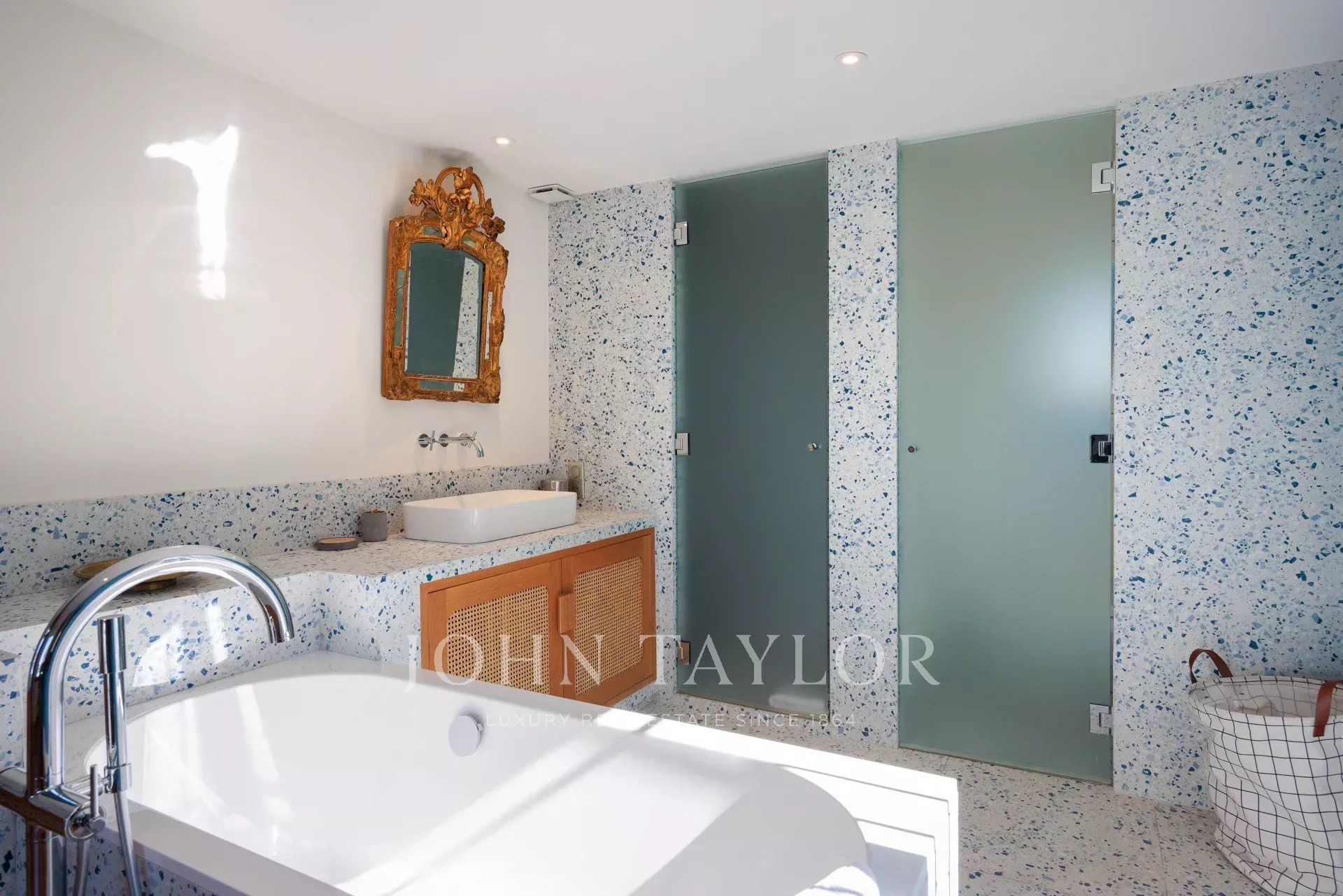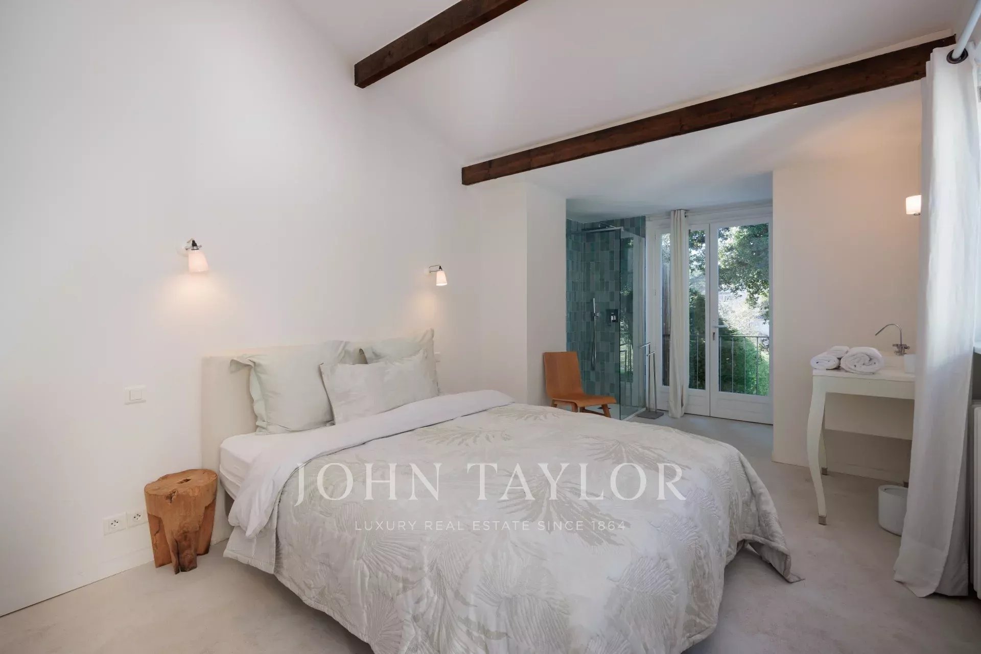 Vicino alle spiagge di La Garoupe e La Salis, questa villa degli anni '30 è stata completamente ristrutturata nel 2019 in uno stile chic e contemporaneo che rispetta gli stilemi delle origini, come il soffitto affrescato del soggiorno.