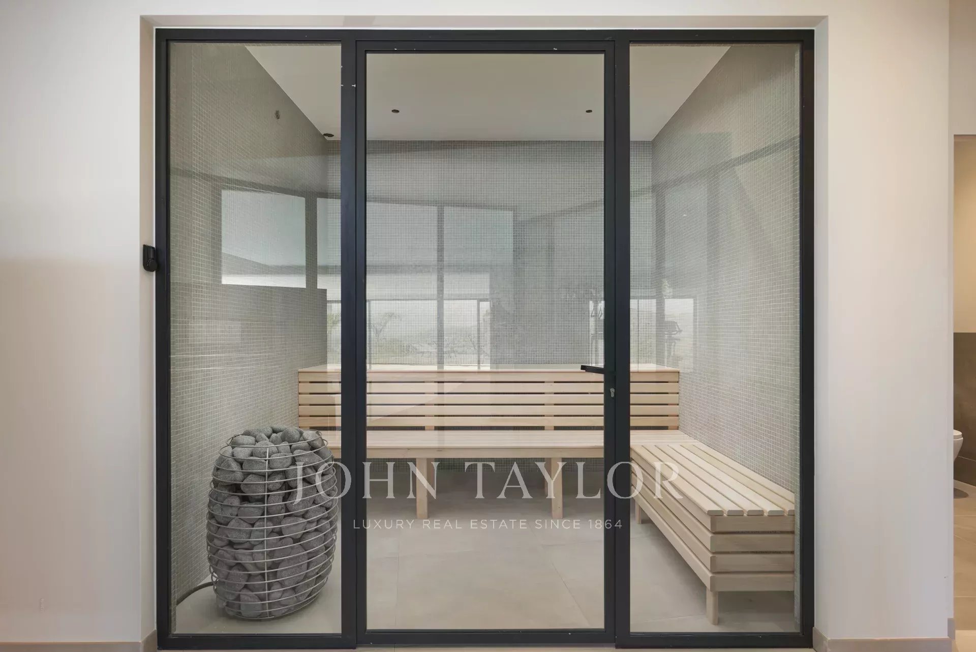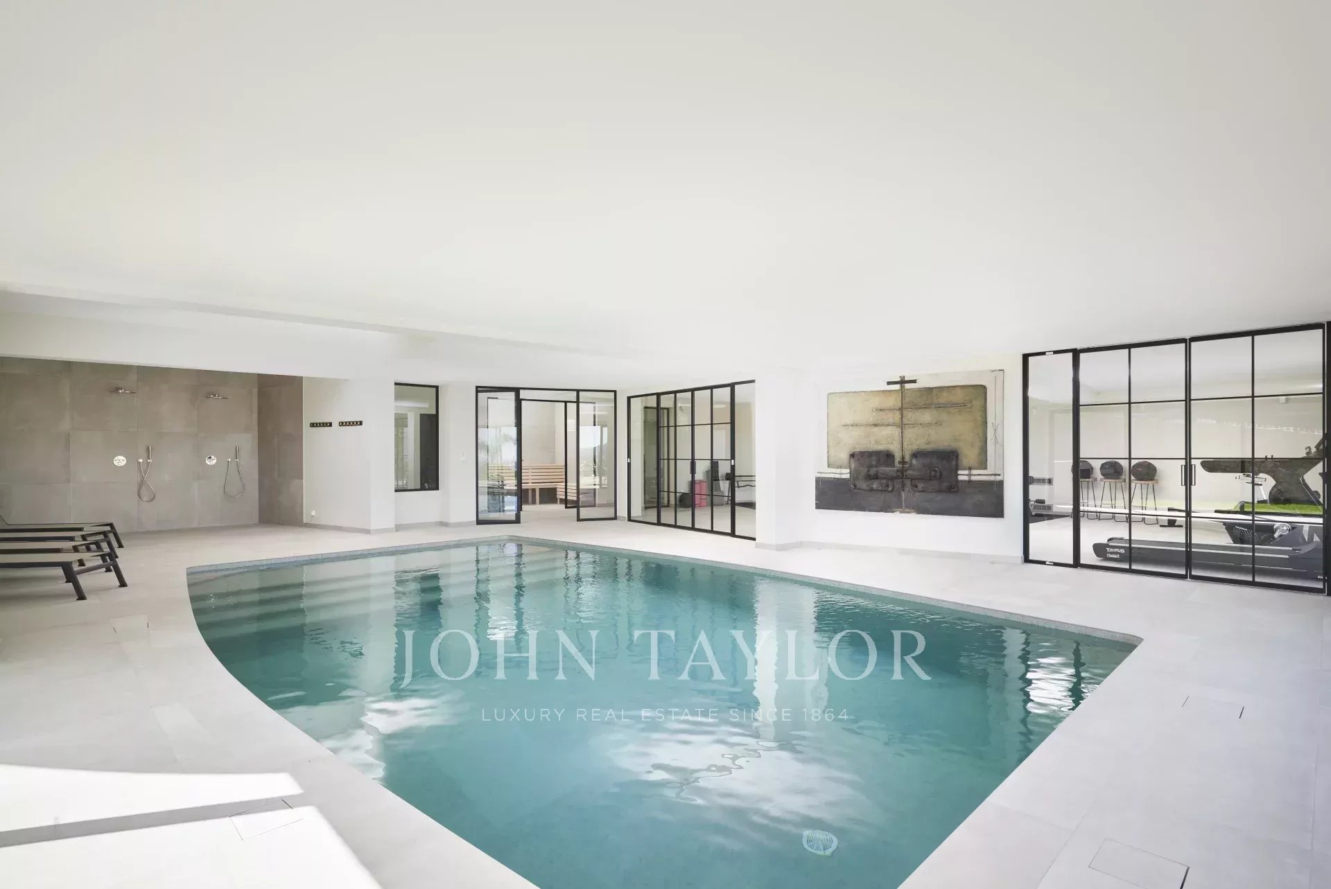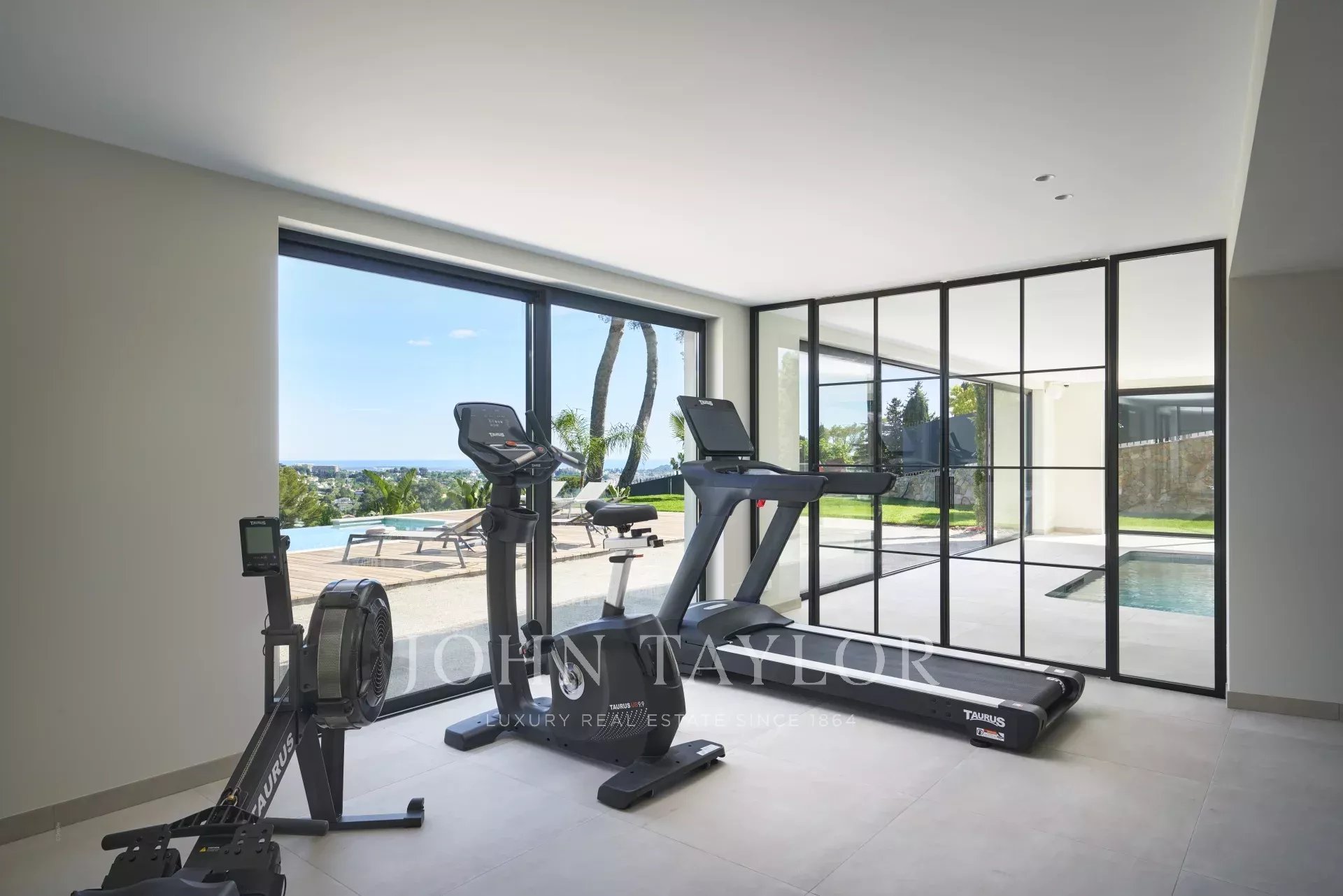 Il piano giardino dispone di una piscina coperta, una palestra, una sauna, un bagno con doccia, una prima camera da letto (n°1) con due letti (90 cm) o un letto matrimoniale (180 cm) con accesso alla terrazza, un'altra camera da letto (n°2) con due letti (90 cm) o un letto matrimoniale (180 cm), e una terza camera da letto (n°3) con due letti (90 cm) o un letto matrimoniale (180 cm) e un locale caldaia.