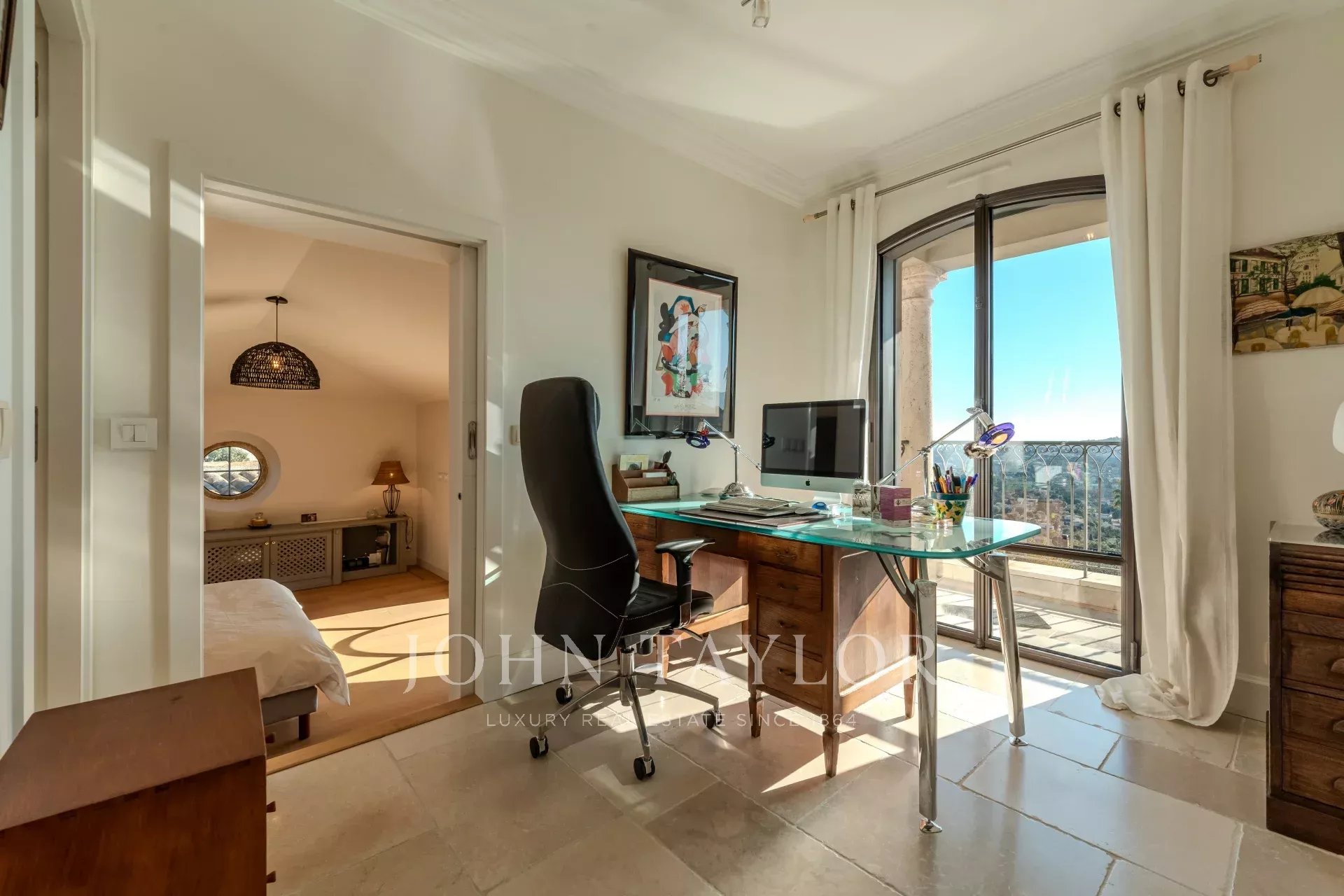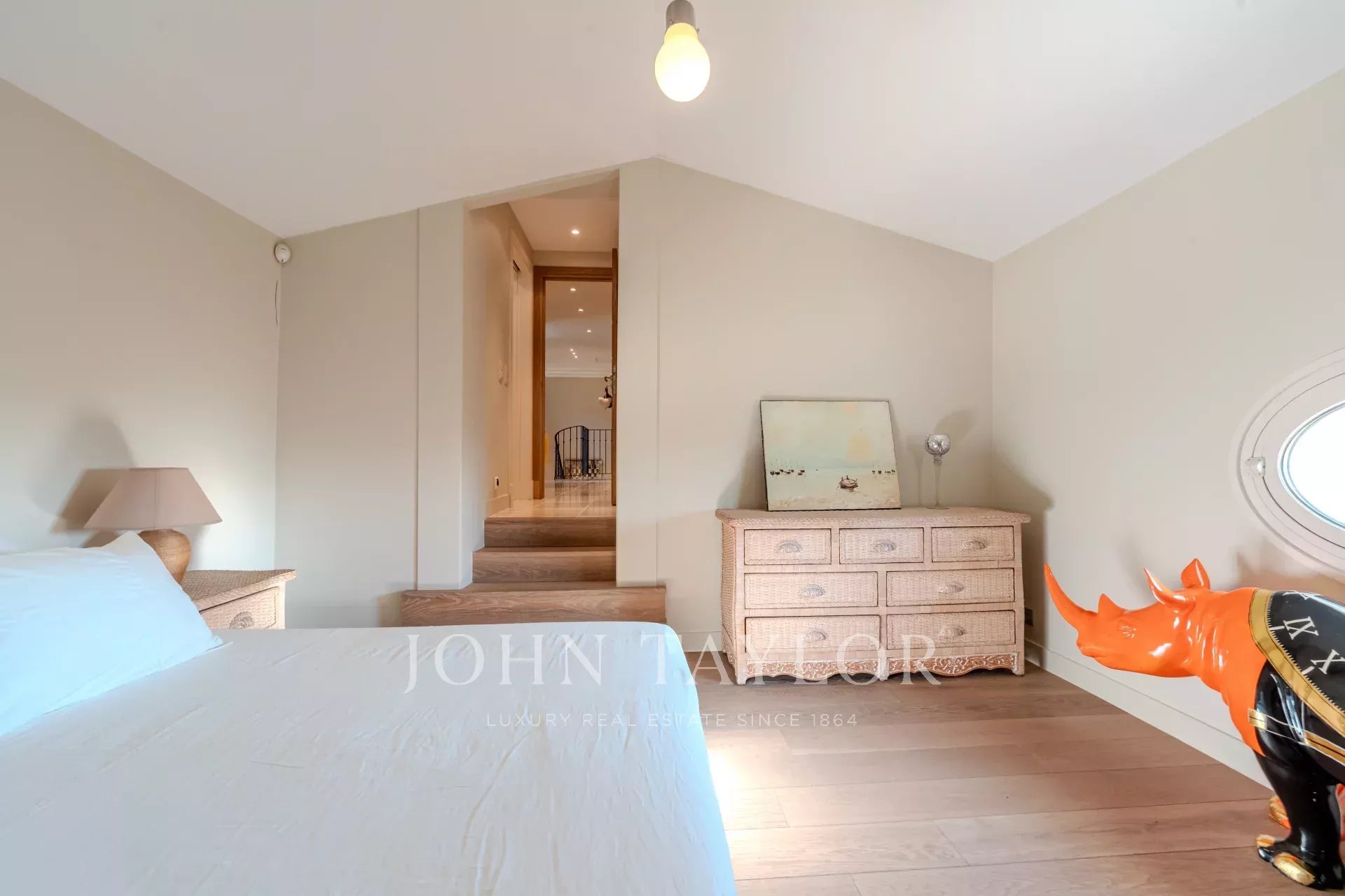 Al piano superiore, quattro eleganti camere da letto, ciascuna con bagno con doccia e WC, si aprono su una vasta terrazza. Queste includono una sala studio, ideale per il telelavoro, e aree che offrono una disposizione flessibile dei letti (king size o singoli).