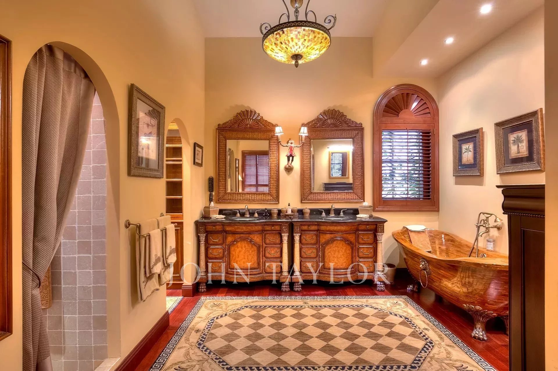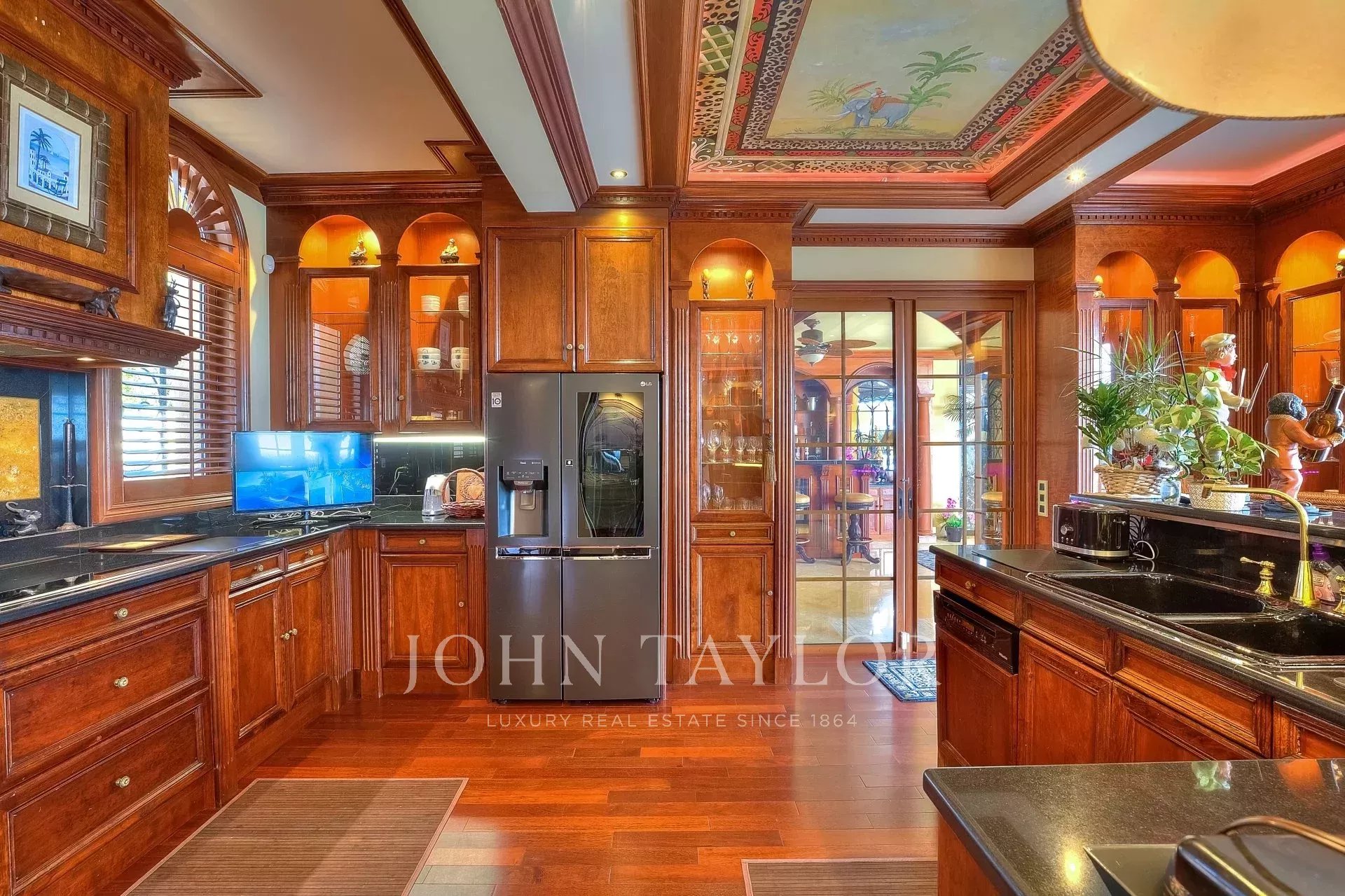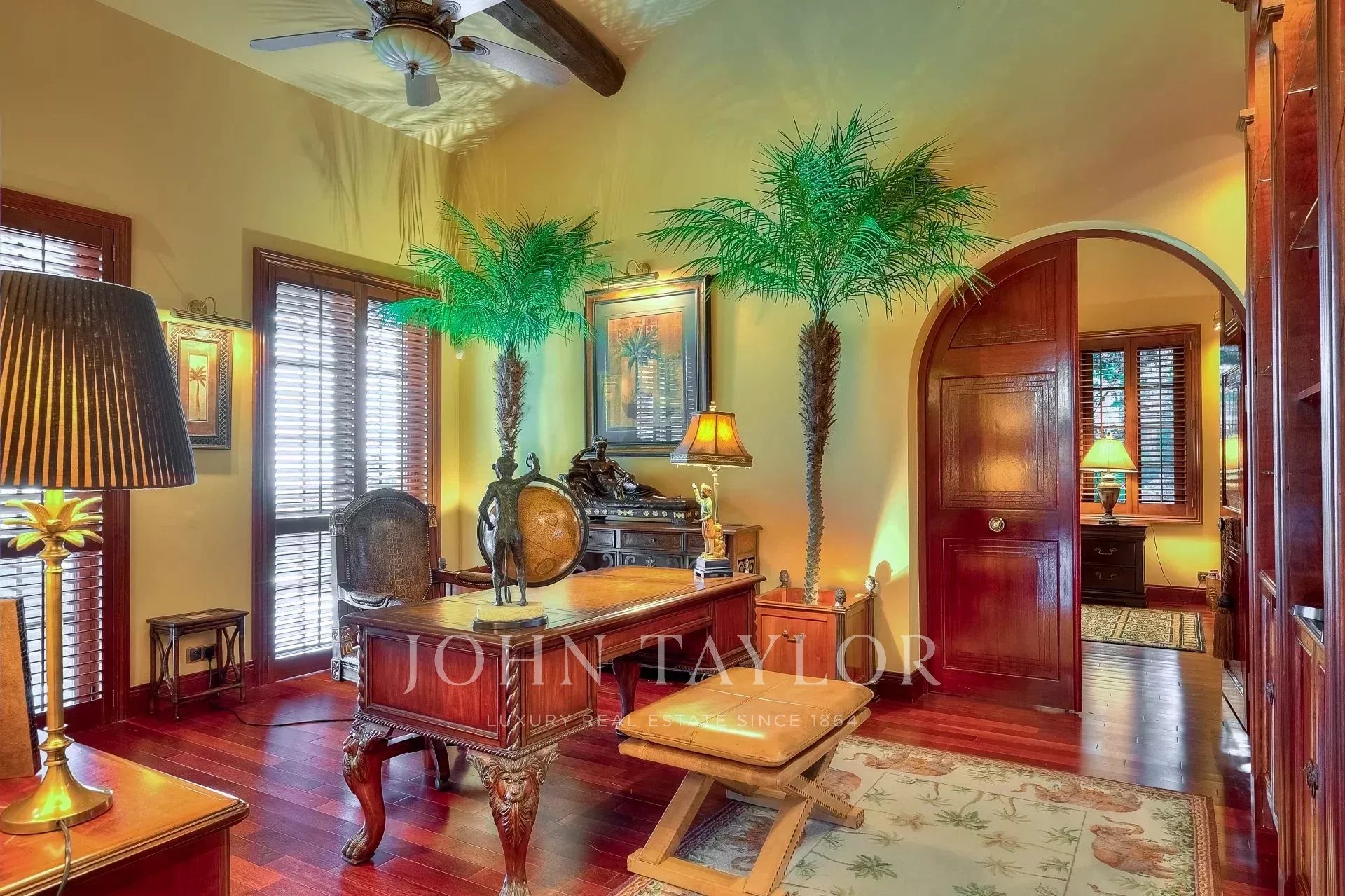 Al livello del giardino si trovano un ingresso e una toilette per gli ospiti, un grande salone/soggiorno di oltre 150 m², una sala da pranzo, una cucina, uno studio, una camera da letto principale (n. 1) con il suo grande bagno e due spogliatoi, un salone estivo e una sala cinema di 50 m².