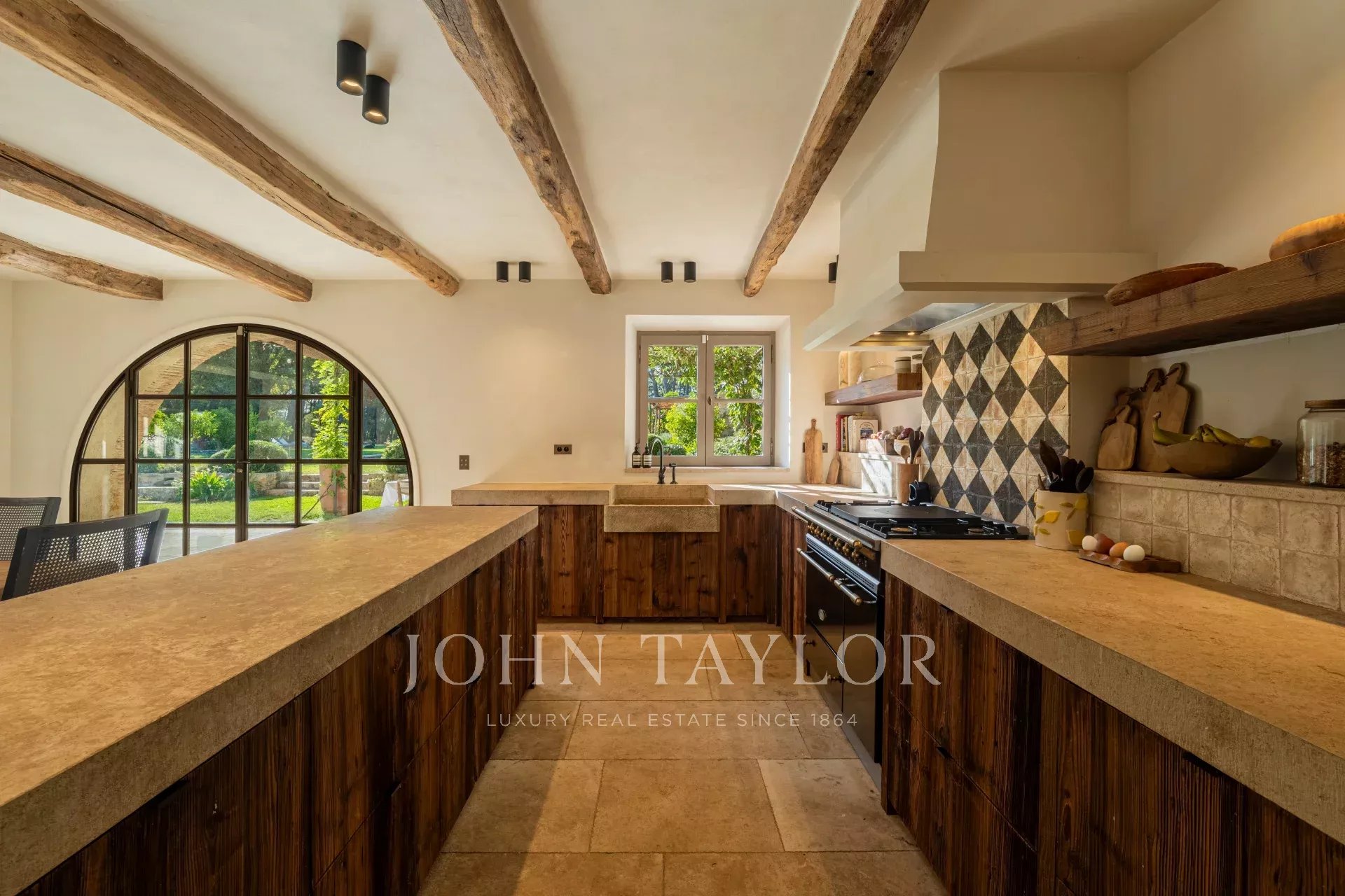 Immersa nel cuore di un vasto giardino paesaggistico, questa proprietà di alta gamma di 340 m² con annessi vi accoglie per un soggiorno tranquillo, lussuoso e conviviale.