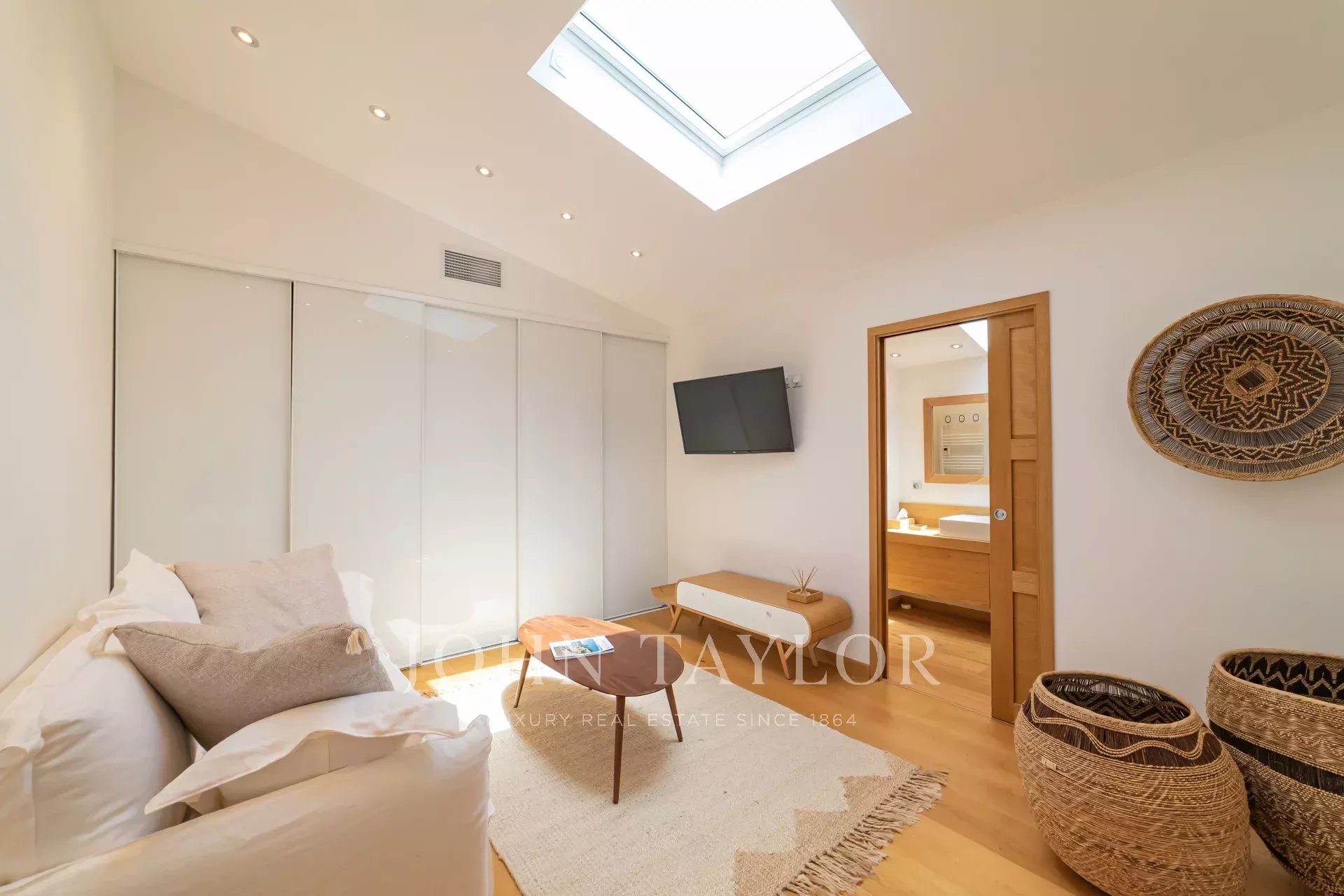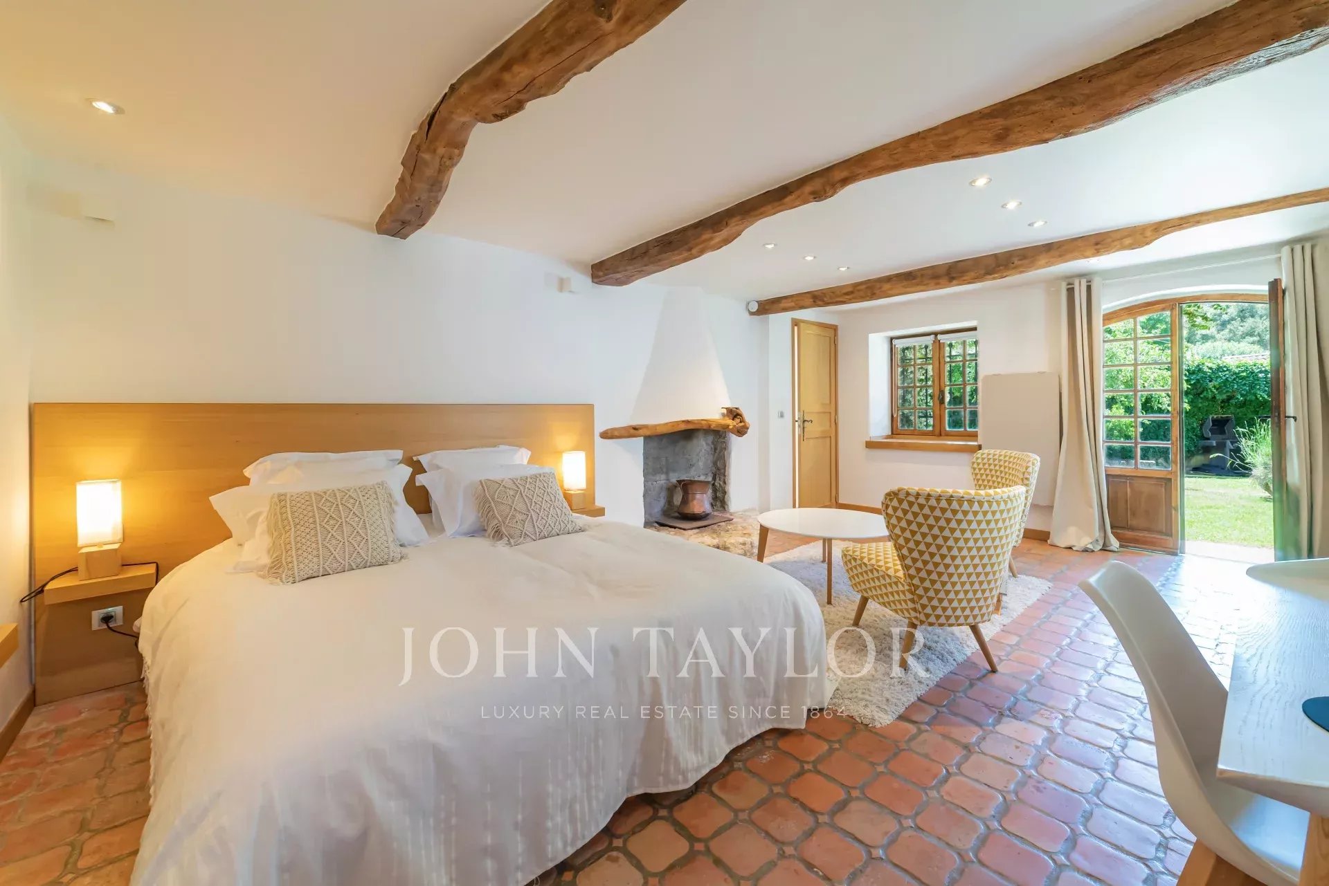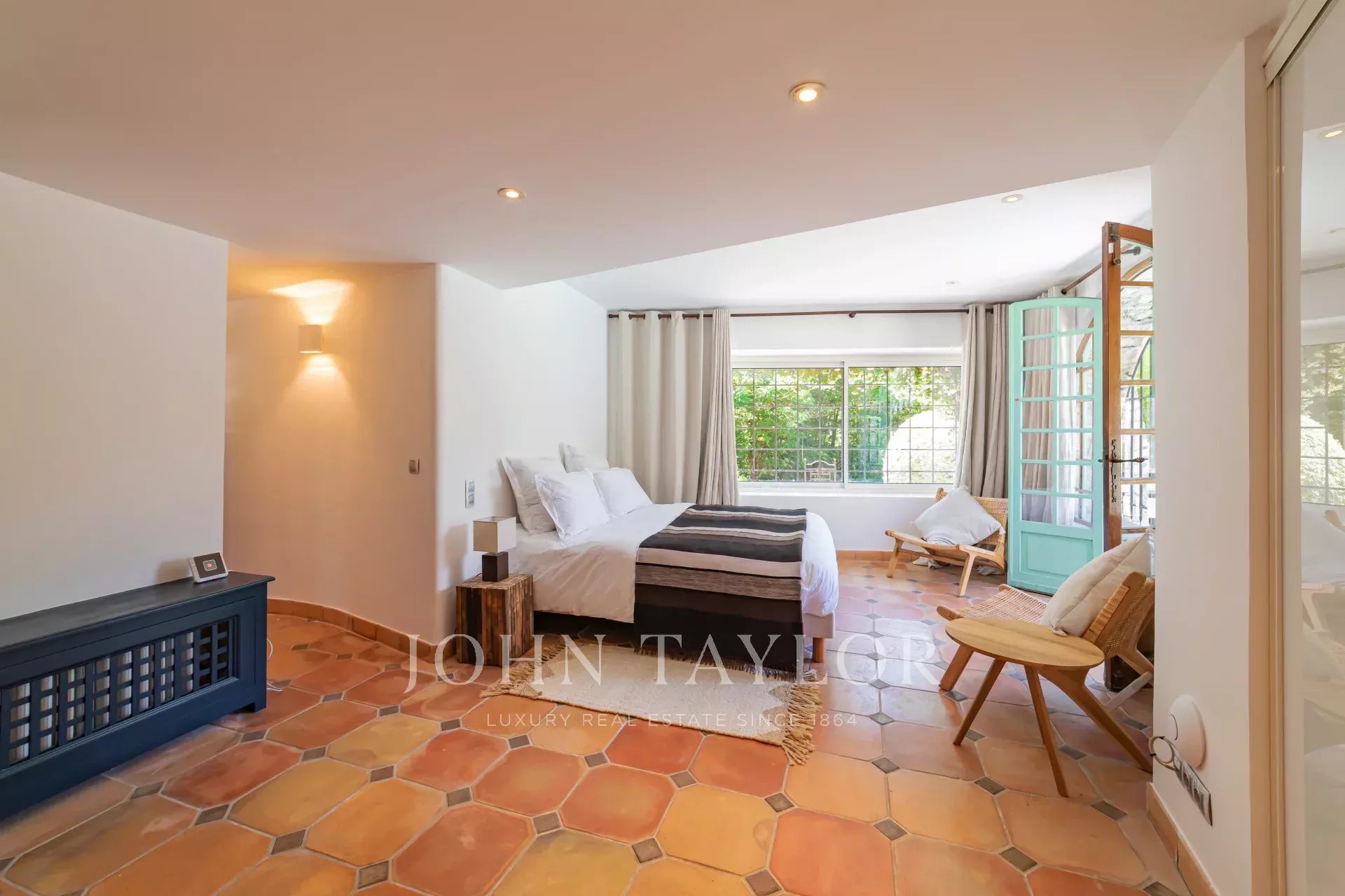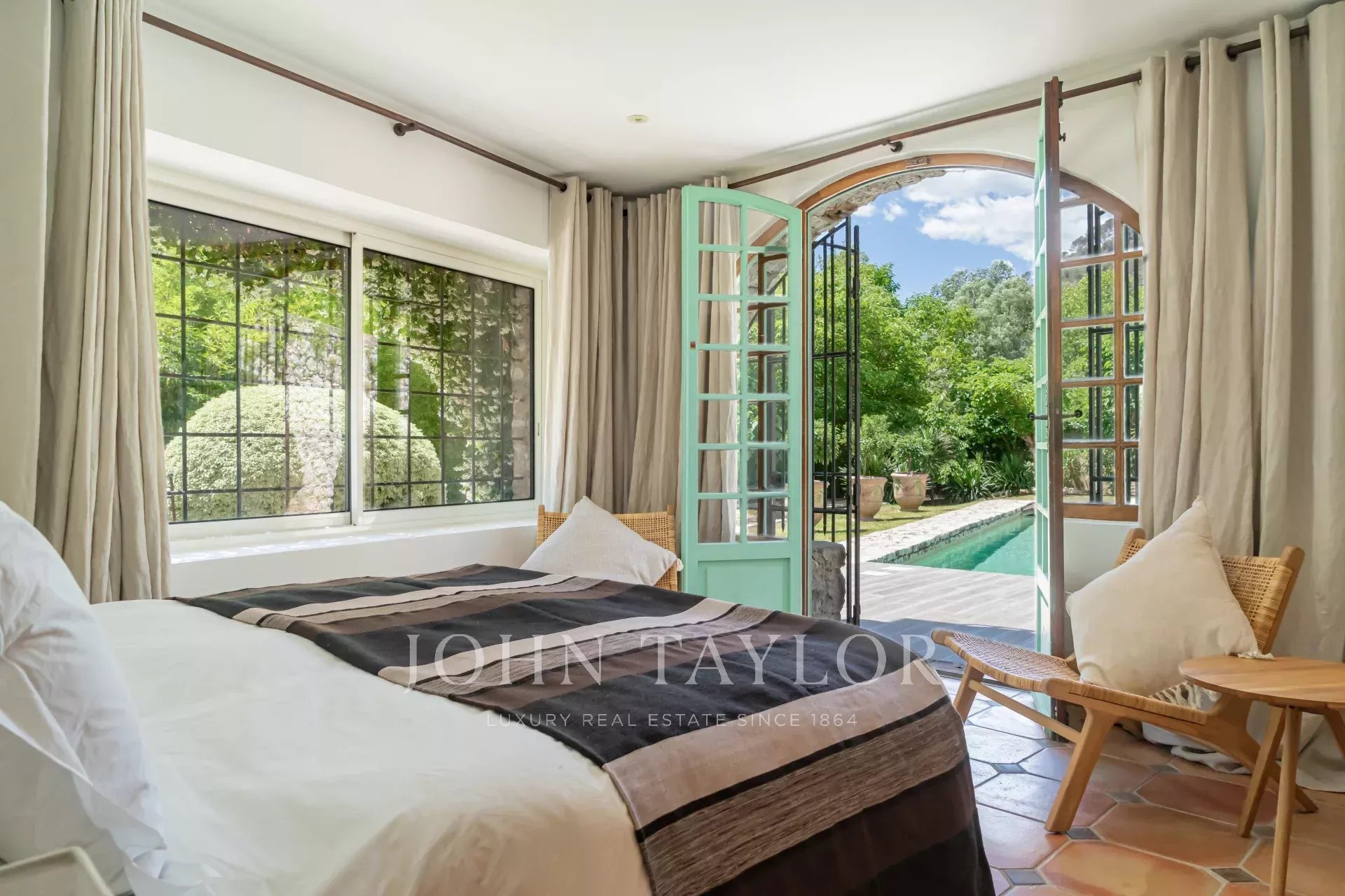 La camera da letto principale, situata al piano terra, ha accesso diretto alla piscina e una sauna privata.