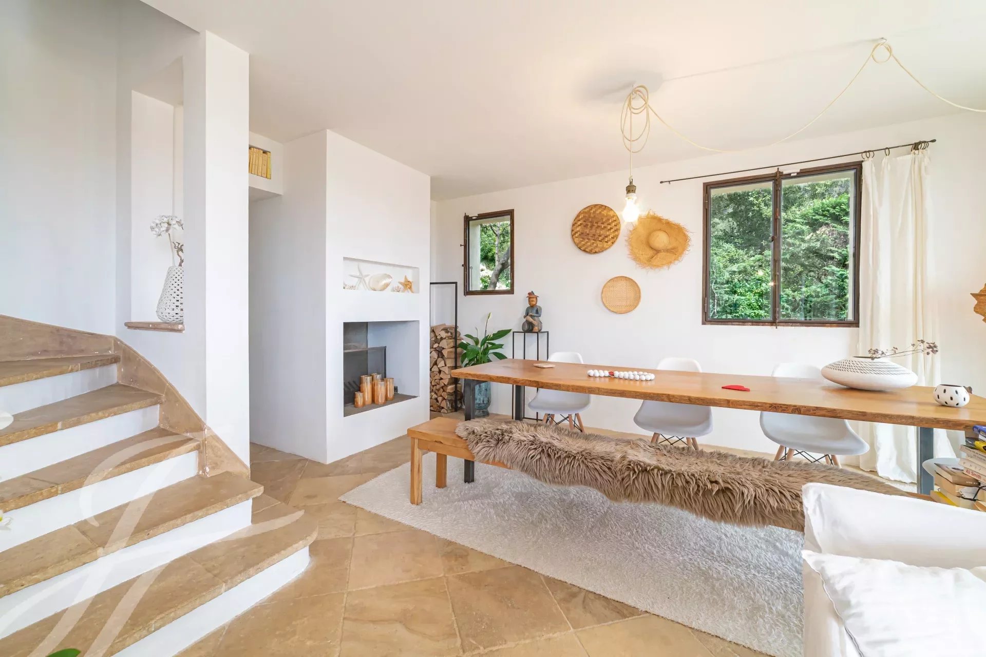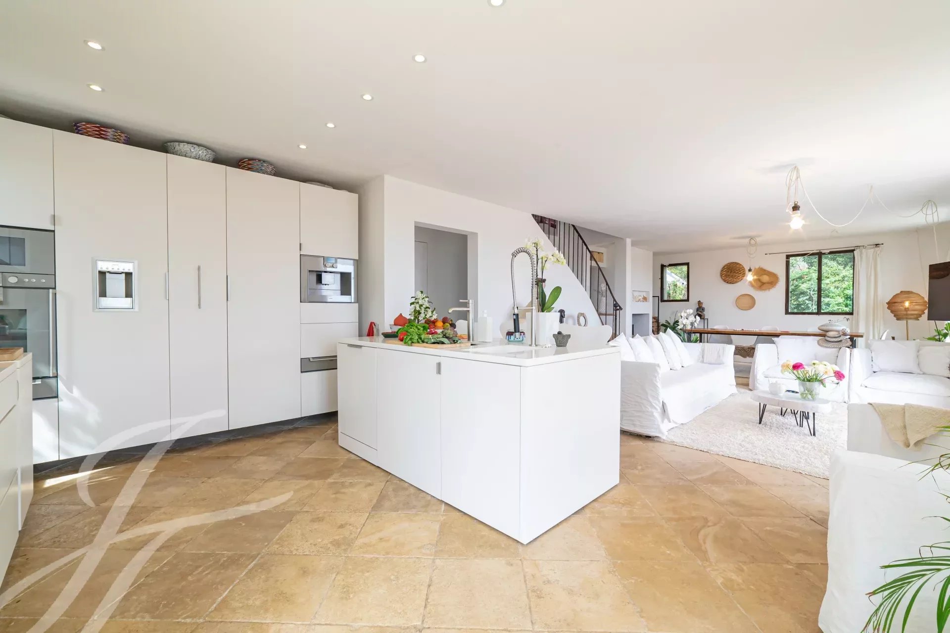 - Ampio e luminoso soggiorno con camino e accogliente zona lettura. La cucina e il soggiorno a pianta aperta si aprono su una terrazza con vista sul mare.