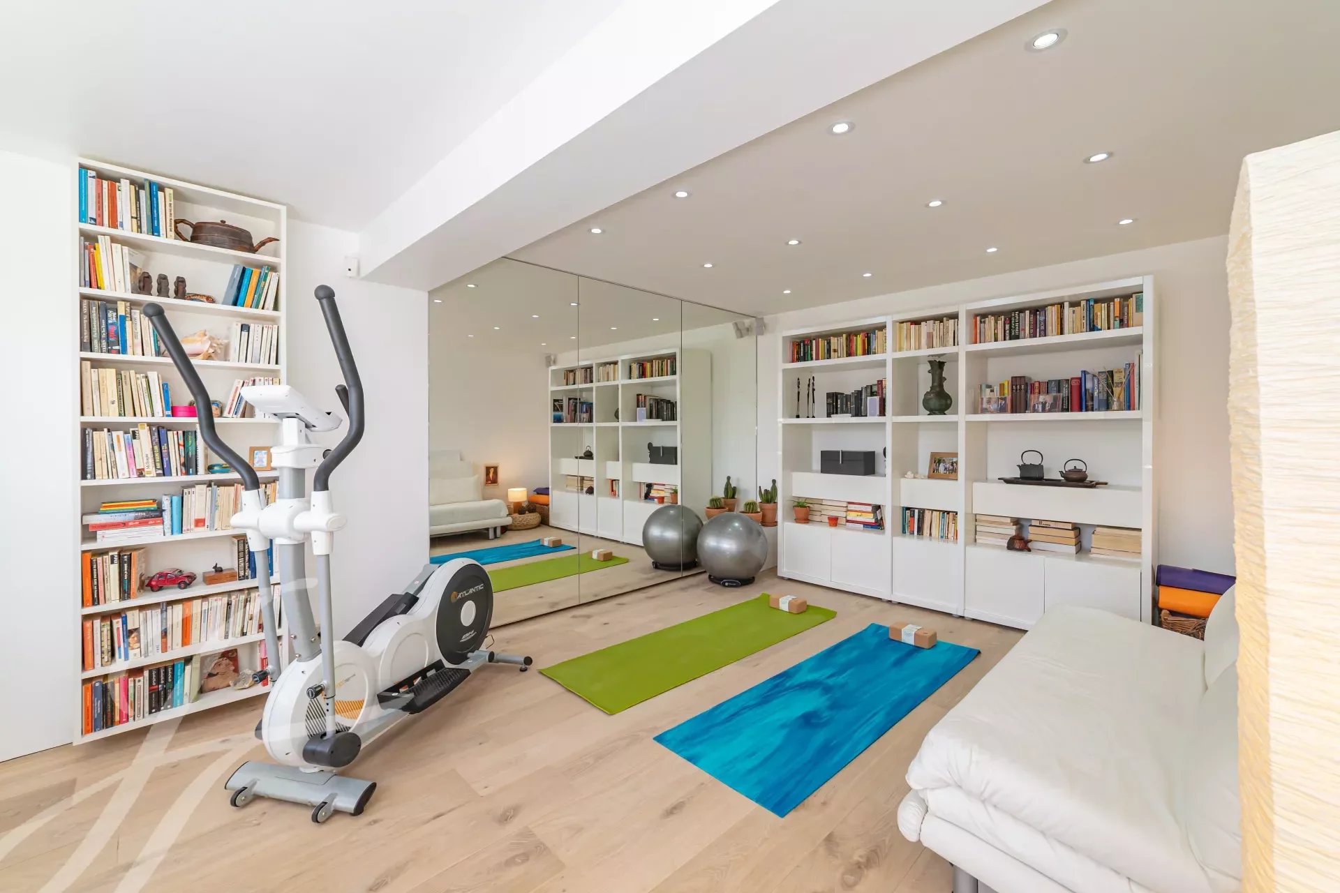 - Sala yoga con parete a specchio, tappetini e blocchi per lo yoga, cross trainer o stepper, ecc.