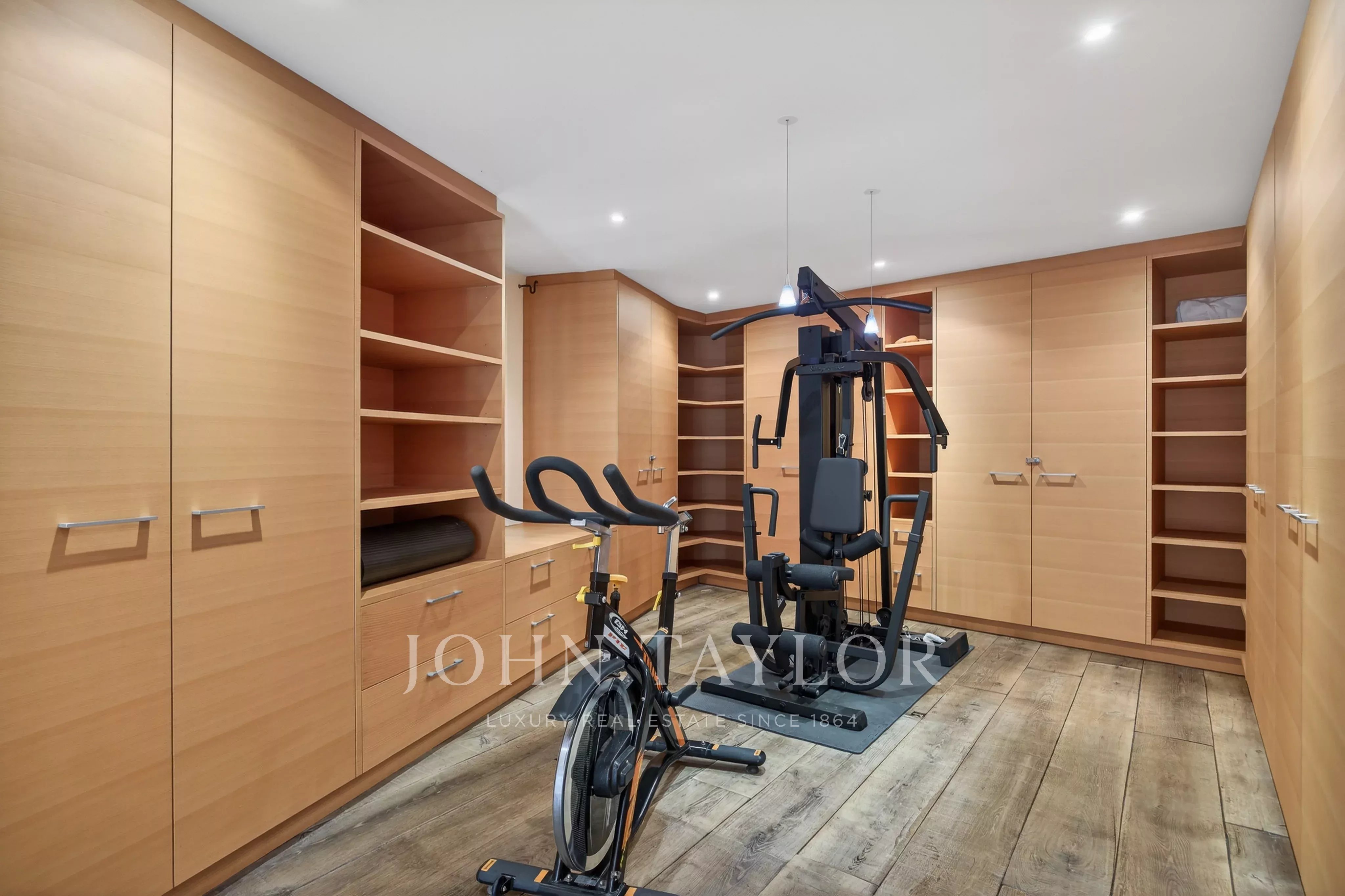 La proprietà principale (412 m²) si compone di un ampio soggiorno aperto sulla sala da pranzo con grandi vetrate che offrono una vista mozzafiato, di una cucina aperta completamente attrezzata che può essere chiusa, e di una palestra.