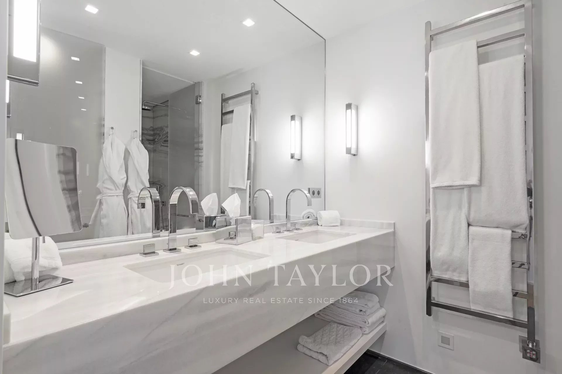 ingresso con toilette per gli ospiti, ampio soggiorno che si apre su una terrazza coperta, sala da pranzo, cucina completamente attrezzata con cella frigorifera, camera da letto principale con vista mare su Pampelonne con bagno e spogliatoio con terrazza privata.